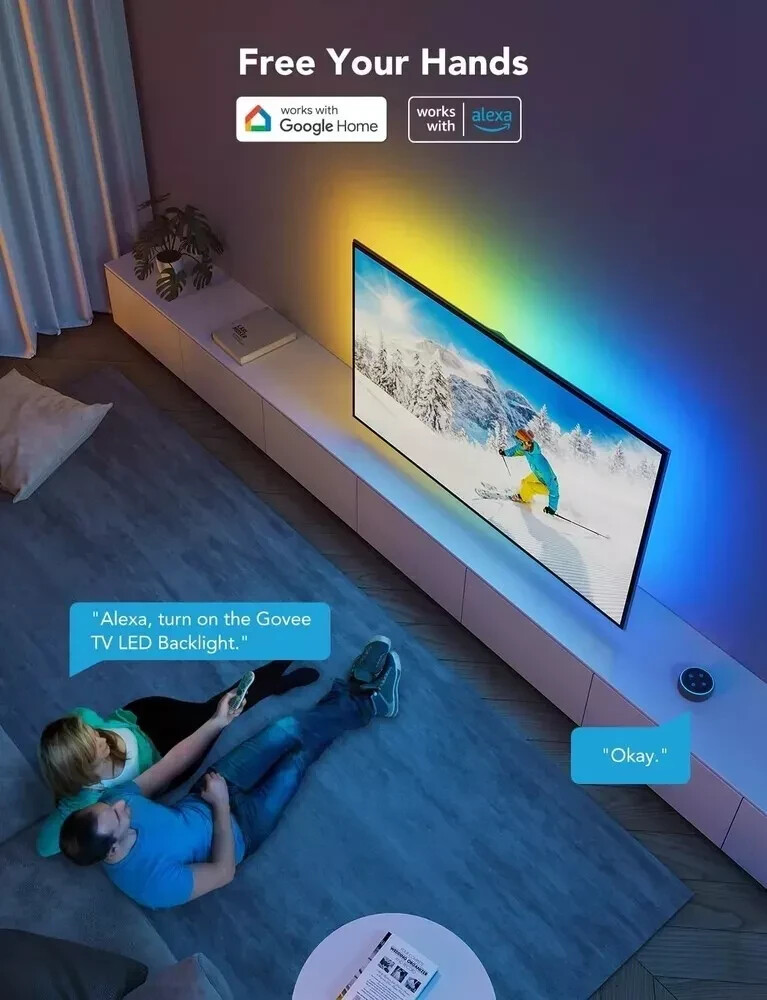 About this item A Symphony of RGBIC Lighting: Govee RGBIC technology realizes the color segmentation display of the TV lights behind, creating more dynamic and gorgeous lighting effects. Experience more vibrant colors in your TV lights and upgrade your visuals. App & Voice Control: Manage the LED TV lights via app or smart voice control with Alexa & Google Assistant. ( Please note that it won't capture colors automatically and support 2.4G only.) Multiple Preset Scenes: Govee Home App offers 99+ preset scene modes and 11 music modes, from which you can choose the lighting effects that suit your mood or the atmosphere around you to enhance your viewing. Music Sync: Govee TV LED Backlight includes a built-in mic, making the color and brightness sync with the music. Experience breathtaking lighting effects that dance with any audio as though you're at a concert. Flexible Installation: The 12.5ft TV backlight can easily cover 4 sides of any 55-65 inch TV. It is recommended to use the cable clips to secure the TV LED strip lights to make them snugly fit your TVs.