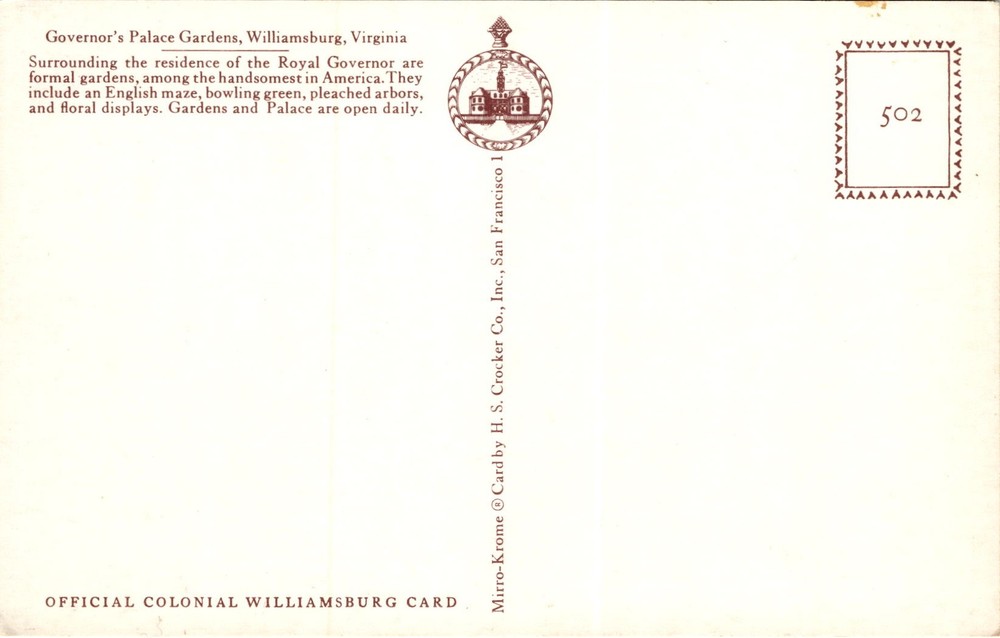 The postcard features the Governor's Palace Gardens in Williamsburg, Virginia, which are described as some of the most beautiful formal gardens in America. The gardens surround the residence of the Royal Governor and include various features such as an English maze, a bowling green, pleached arbors, and stunning floral displays.