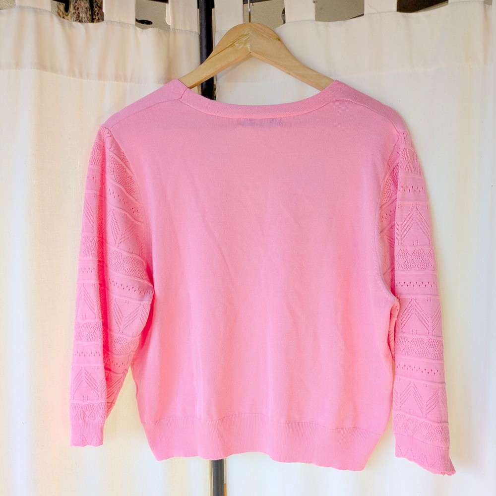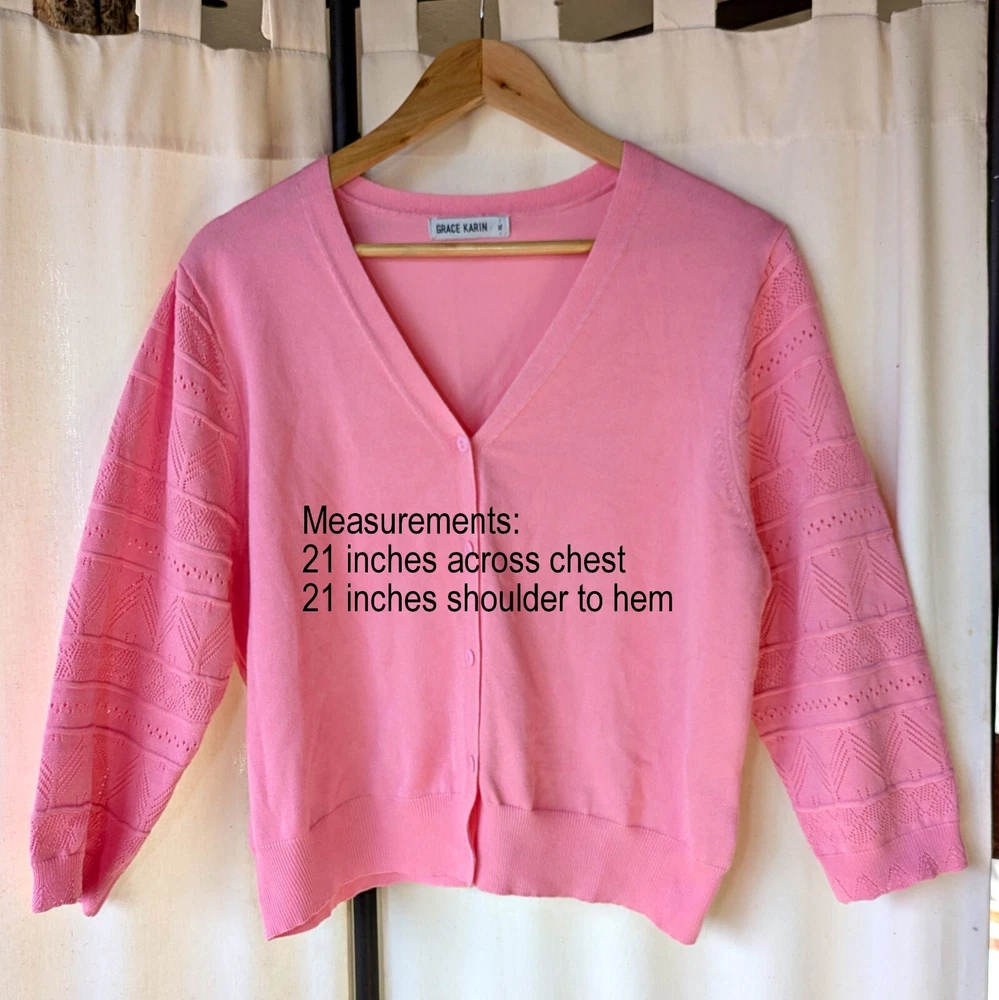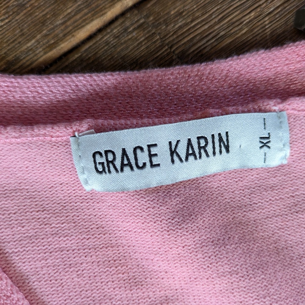 Grace Karin Womens SZ XL Ballet 3/4 Knit Sleeve V-Neck Pink Cardigan Gently worn. No flaws. V neck ballet pink cardigan. Romantic ballet style 3/4 length sleeves. Decorative knitting on sleeves. Button down. Measurements: 21 inches across chest 21 inches from shoulder to hem