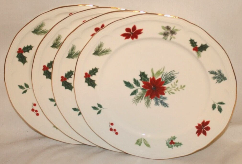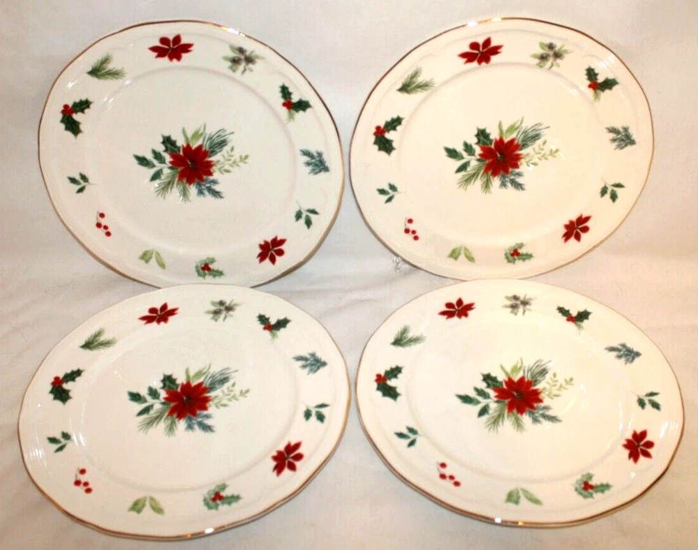 Grace Teaware Poinsettia & Holly Rimmed Porcelain 10.5" Dinner Plates Set of Four New Dishwasher safe. NOT microwave safe due to the gold accent trim on the outside rim. Measures approx. 10 1/2" diameter. Will set a gorgeous table for the holidays. Matching pieces sold in our other listings. Please check them out. New never used. Stored in a smoke free warehouse environment.
