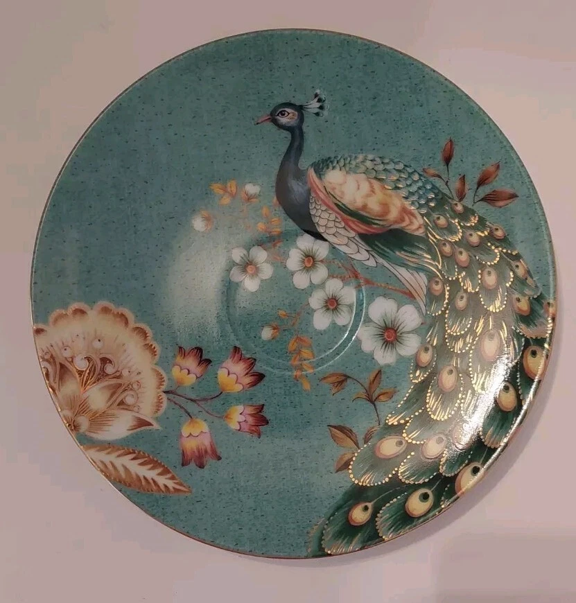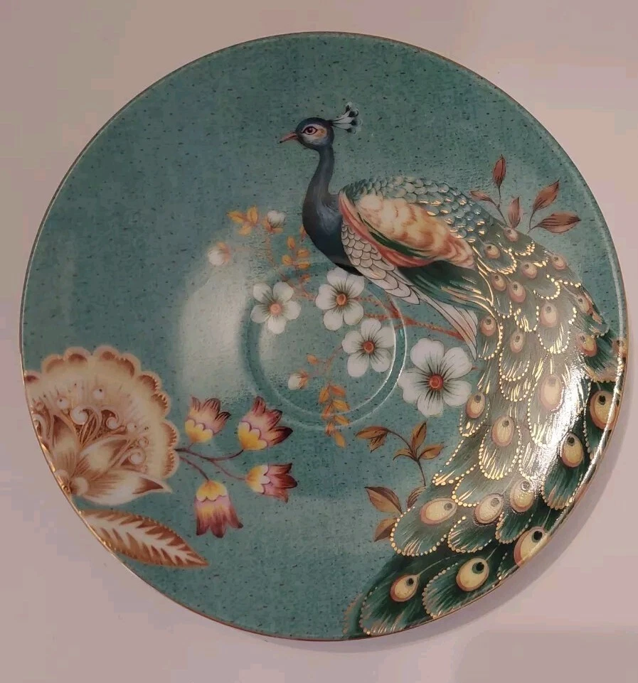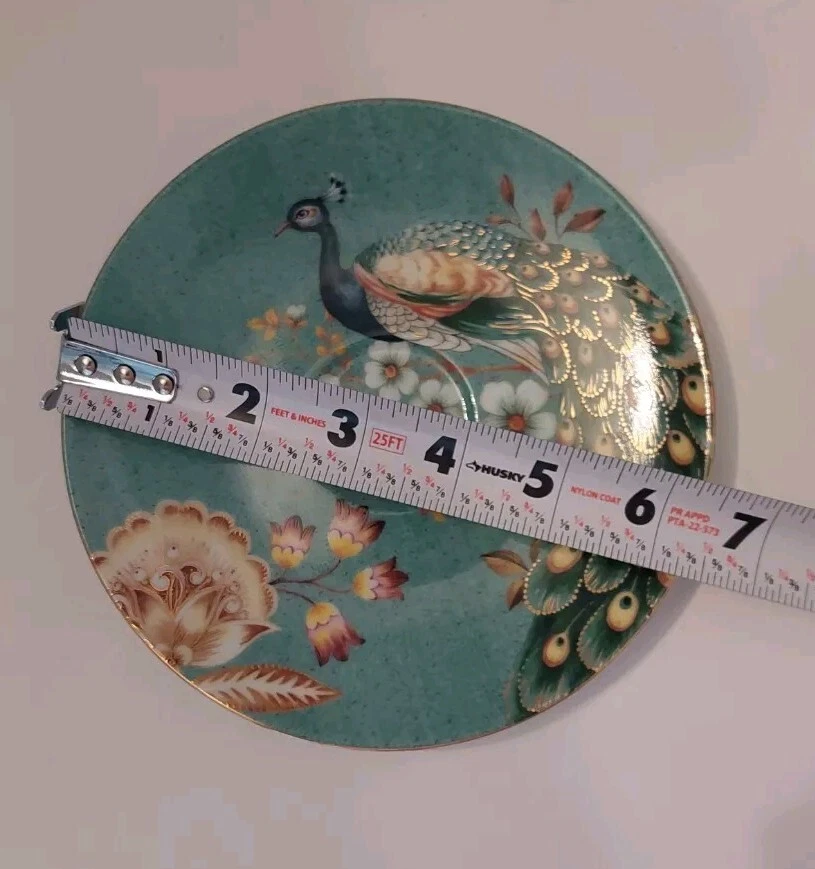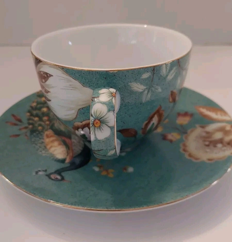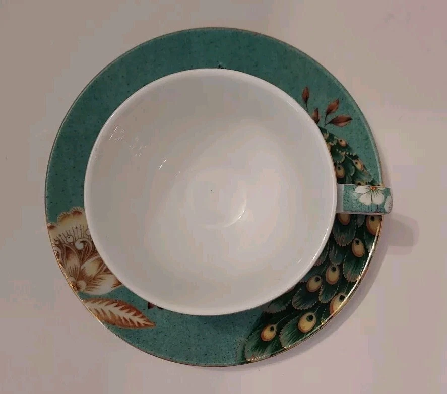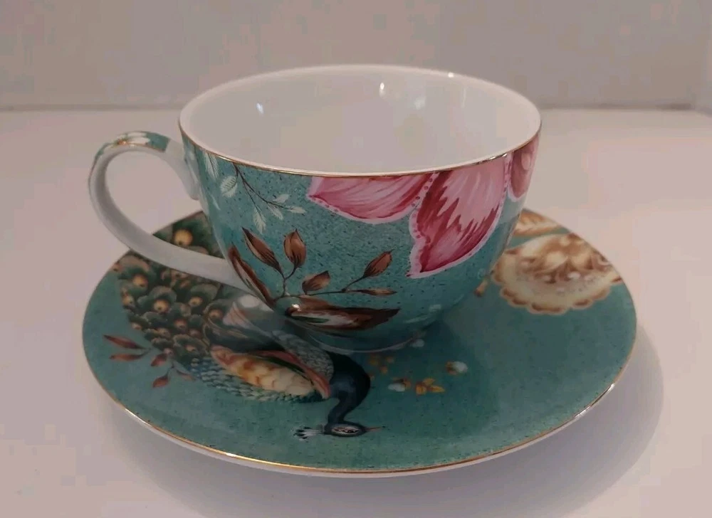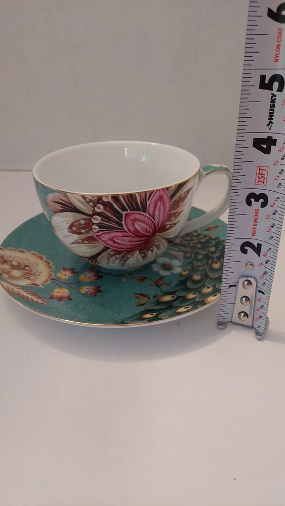 Very pretty teacup and saucer set with a Peacock and flower design. No chips or cracks. See photos for complete description, measurements, and condition