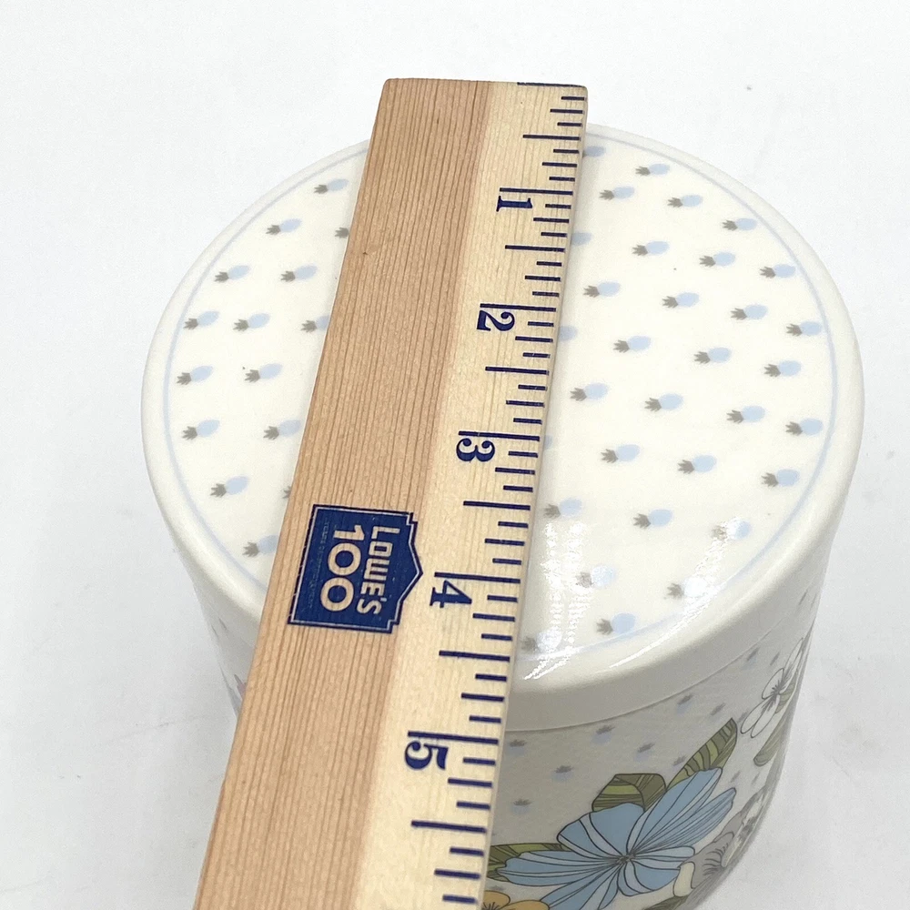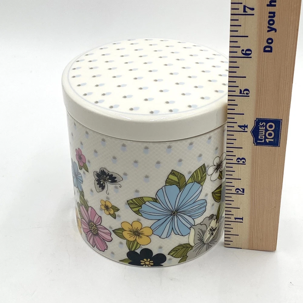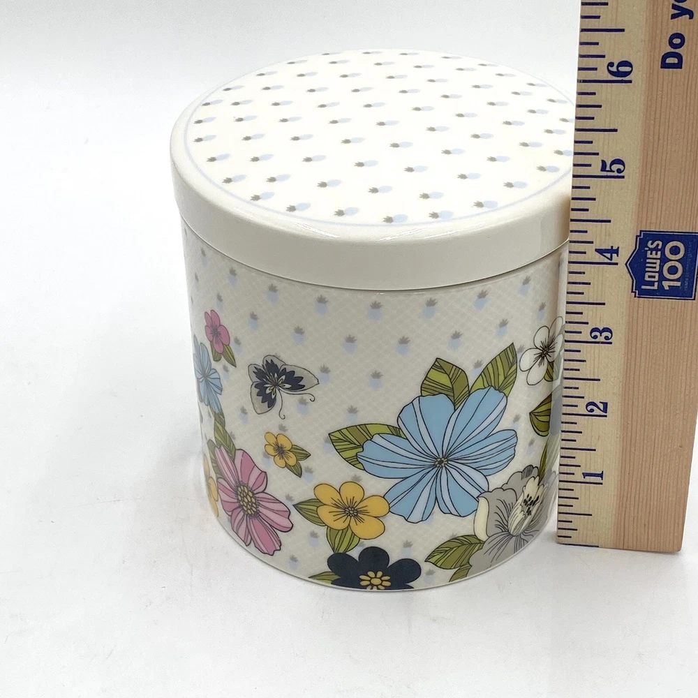 Original/Licensed Reproduction:OriginalItem Length:approx. 4 1/4' acrossSize:MediumAntique:NoPattern:Floral & ButterfliesSet Includes:LidSeller Notes:“Great pre-owned. See photos. Thanks!”MPN:n/aNumber in Pack:1Item Height:Approx. 4.5" including lidType:CanisterFeatures:Fun and Colorful, With LidVintage:NoItem Width:approx. 4 1/4" acrossNumber of Items in Set:2Theme:Butterflies, FloralNumber of Compartments:1Country/Region of Manufacture:ChinaMaterial:Ceramic & PorcelainNumber of Jars Included:1Style:Retro / Vintage LookColor:MulticolorBrand:Grace's TeawareLid Type:none