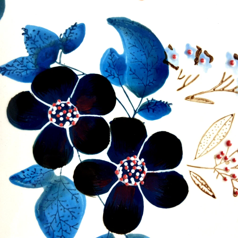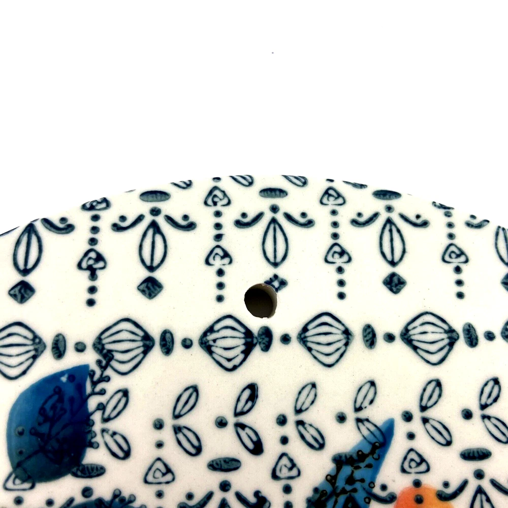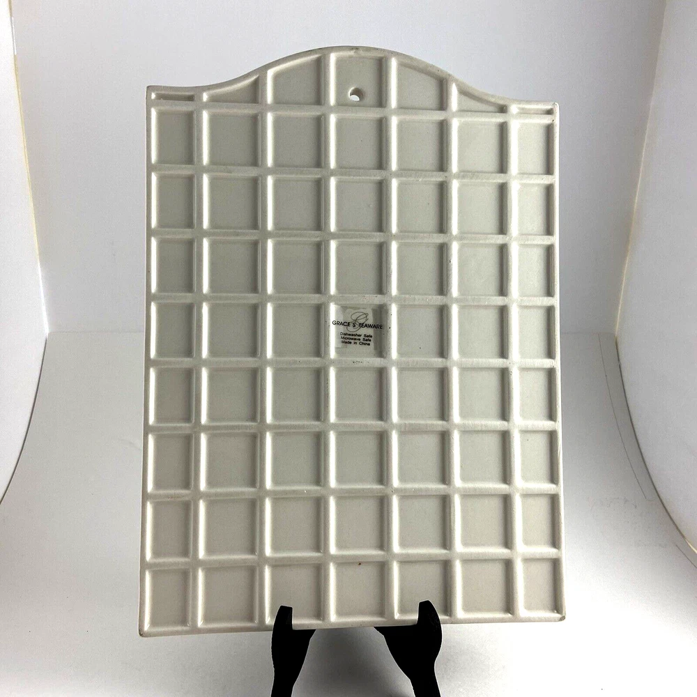 Grace's Teaware Ceramic Trivet Tray Hanging Wall Art Width: 8 1/2" Length: 12" Weight: 3 lbs. Vibrant Colors with raised dots in flower middles. Has hole in the top for hanging. Found at an estate sale.