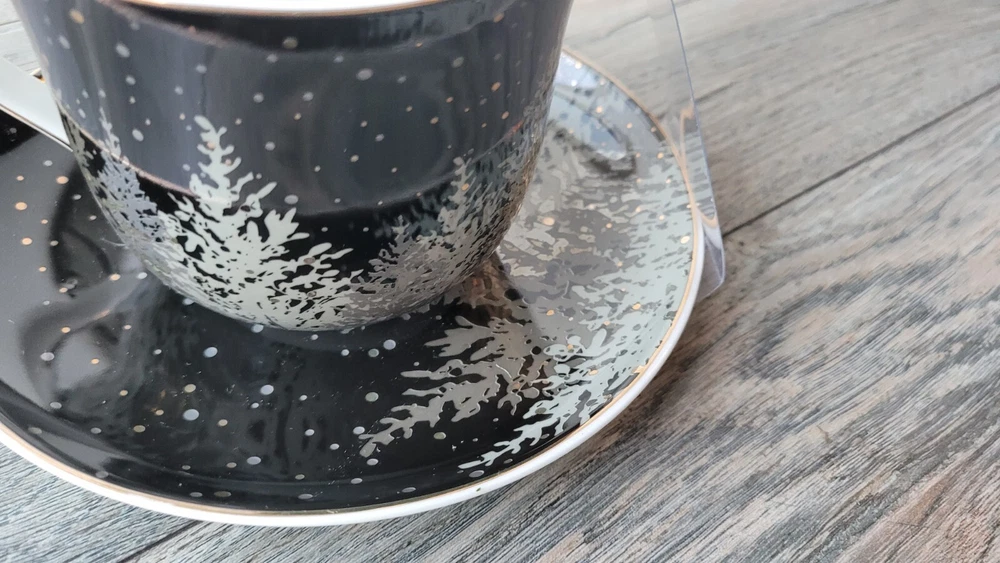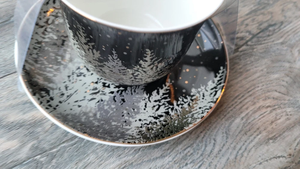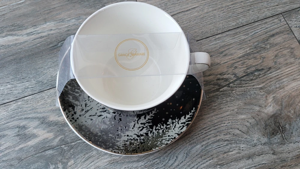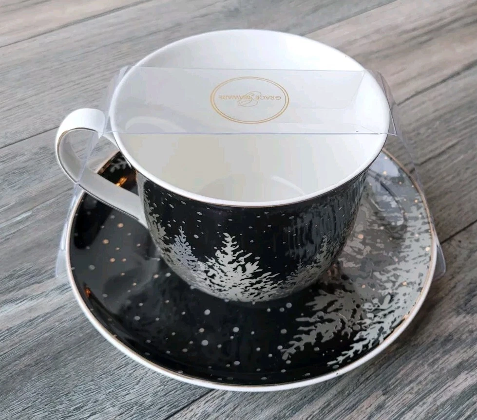 This beautiful teacup and saucer set from Grace's Teaware features a winter tree pattern in black, gray, and gold colors. The set is made of fine porcelain and has a capacity of 8 oz. It is perfect for all occasions and is machine washable for easy cleaning. The teacup and saucer are round in shape and have a printed backstamp. They are not signed and are not vintage or licensed reproductions. The production style is porcelain and the production technique is also porcelain. The set includes two pieces and is unisex for all adults. It is a perfect addition to any tea lover's collection.