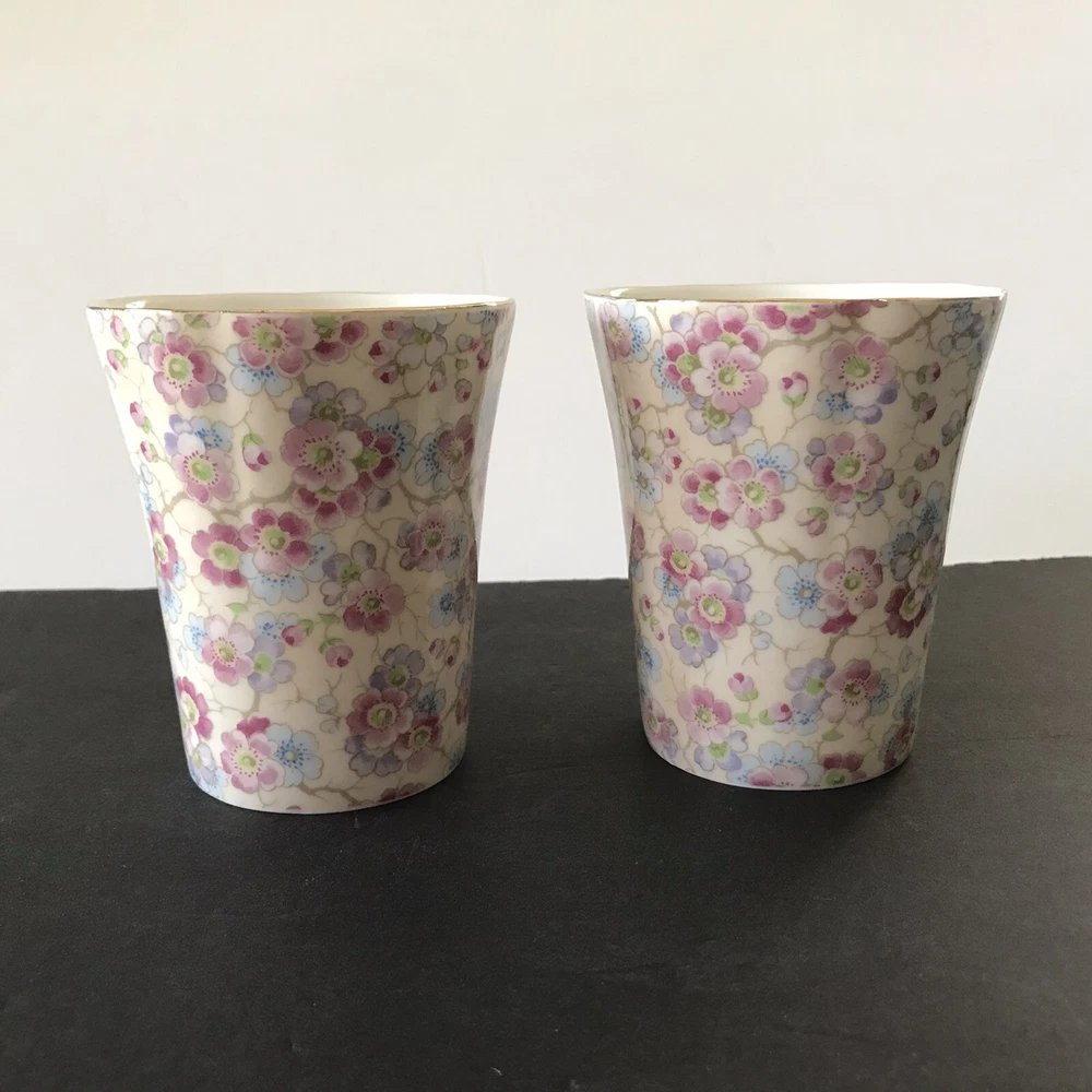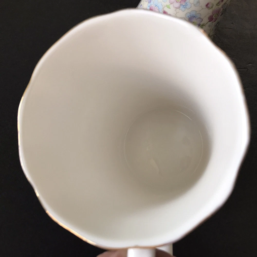 Grace's Teaware Two Pink Floral Scallop Rims with Gold Trim Tea Coffee Mugs Cups with Thumb Rest 9 fl oz Capacity Used in Good Condition: No Chips, Cracks, Crazing, Scratches or Staining Thank You for Viewing