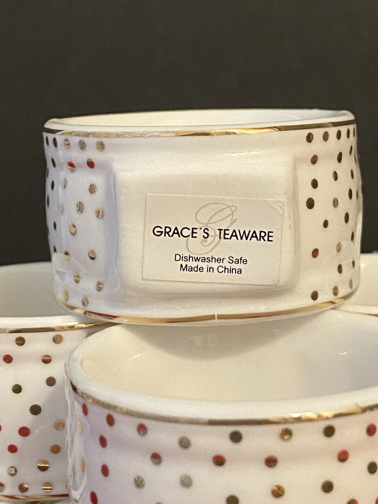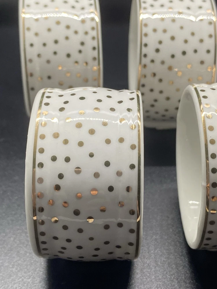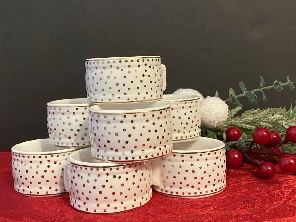 Pre-Owned Good Condition! One napkin ring does have a chip (see pictures). Add a touch of elegance to your dining table with this set of 8 napkin rings. These napkin rings made by Grace's Teaware, feature gold polka dots that will compliment any table for any occasion (Fall, Christmas, Birthday, Anniversary, etc. Thank you for your interest. I take pride in all of my listed items. Message me with any questions. Please take a look at my other listed items.