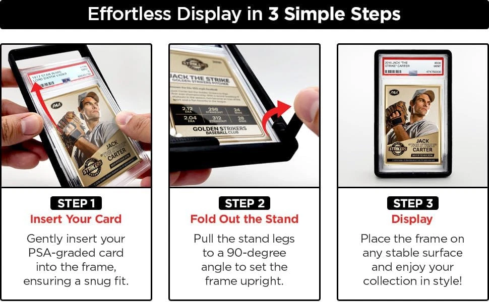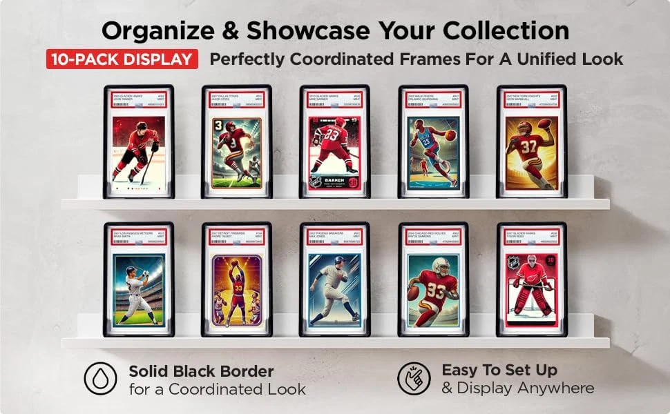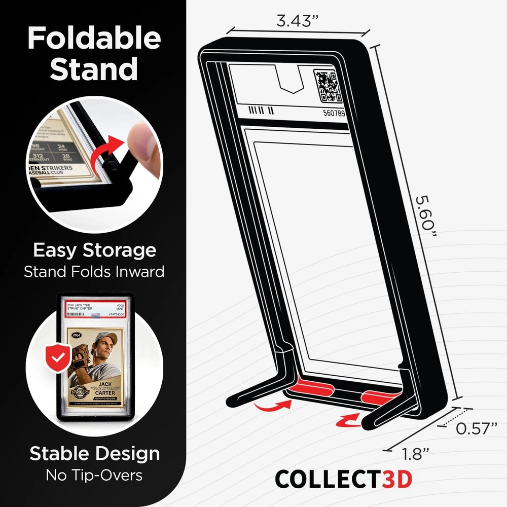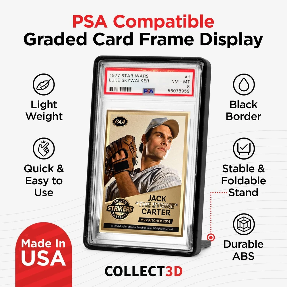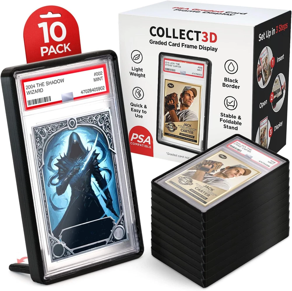 Graded Trading Card Frame Display with Folding Stand | 10 Pack (Black) Black Product Details Brand: COLLECT3D Color: Black Material: Thermoplastic Polyurethane Special Feature: Trading Card Display Style: Modern Recommended Uses For Product: For Trading Cards Product Dimensions: 5.6"L x 3.43"W x 0.57"H Water Resistance Level: Water Repellent Opening Mechanism: Hinge Shape: Rectangular Number of Items: 10 Unit Count: 10.0 Count Item Package Quantity: 1 UPC: 860012414208 Manufacturer: Collect3D Item Weight: 7 ounces Special Features: Trading Card Display Batteries Included?: No Batteries Required?: No Brand: COLLECT3D Color: Black Material: Thermoplastic Polyurethane Special Feature: Trading Card Display Style: Modern Unique foldable Incorporated card stand makes it very easy to display your favorite trading cards or store your collection. Our display card stands are designed for a perfect secure fit to provide protection and style to your collectibles. The simple design of the display frame makes for a no hassle experience to setup and enjoy your trading card collection. The display frame is specifically designed with a stable base that will not accidentally tip over easily like other stands. Accidental tip overs from a simple nudge are a thing of the past!