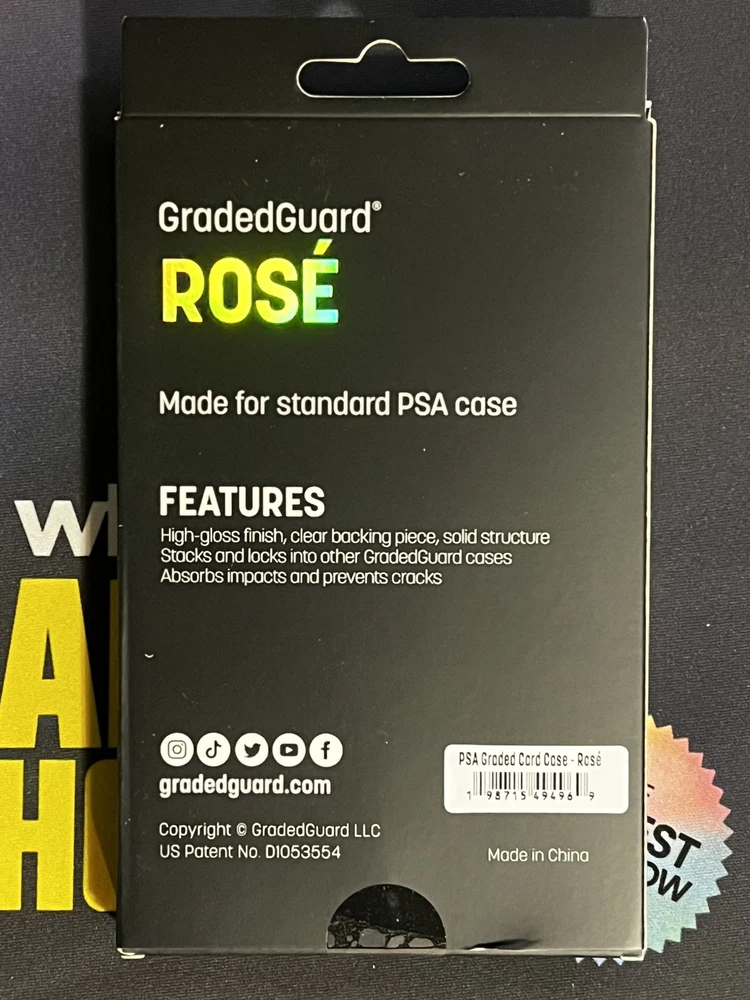 In hand ready to ship The GradedGuard PSA Graded Card Case Guard Protector is a limited edition rose-colored display case designed to showcase and protect standard-sized trading cards. The case is made of TPU and PC materials and features a single compartment to hold one card. It is compatible with GradedGuard acrylic stands and Phantom Displays for vertical display options. The case has a drop protection feature to safeguard the card.