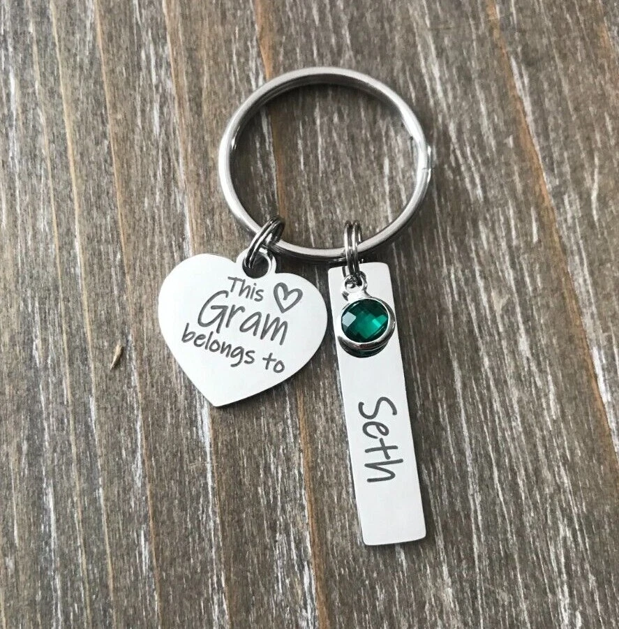 Listing is for Completed custom Name Keychain, Keychain includes heart charm with your choice of wording ( Up to 24 Characters ) and custom Bar Name charms with your choice of Names engraved ( up to 11 characters, capital letters count as 2 characters each ) and birthstones. Custom bar charms are 1 1/4" Stainless Steel heart charm is 3/4 Stainless Steel Key ring is 1" Stainless Steel Keychain will come in Gift box ready to Gift :) *IMPORTANT* Please be sure to include Names and Birth months in notes to seller during check out or in messages, if wording not requested this will come with This Gram belongs to :) Stainless Steel doesn't need polished, will not tarnish and doesn't stain the surrounding skin. It's properties are hypoallergenic for those with metal allergies. Please be sure to check messages after purchase in case of any questions I may have so your order is not slowed :)
