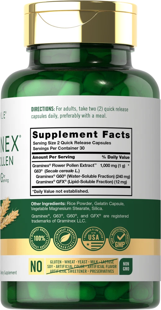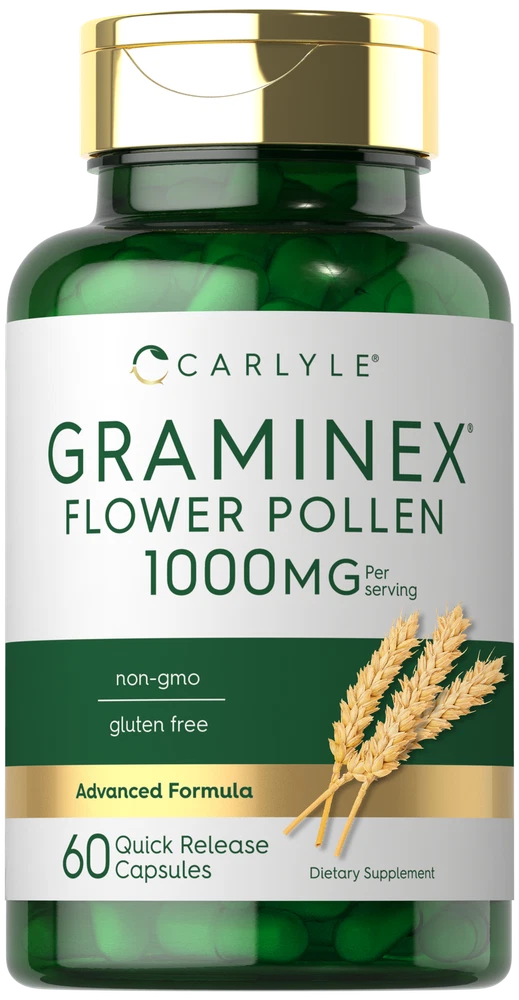 What is Graminex Flower Pollen? Carlyle's Graminex Flower Pollen Extract (G63) pills contain both the water-soluble and lipid-soluble of the pollen grain. It is a nutrient-dense raw material that delivers standardized amino acids to help support your everyday routine. Carlyle's Maximum Strength Graminex Flower Pollen: This easy-to-take supplement is made with the finest ingredients, featuring 1,000 mg of Graminex Flower Pollen per serving in gluten-free and non-GMO quick release, powder-filled capsules. Rooted in Wellness: Our expertise in sourcing the purest ingredients combined with advanced technologies makes us proud to deliver premium, honest supplements at the best value. Our Graminex Flower Pollen supplement is a testament to our commitment to excellence, made with powerful ingredients rooted in wellness. Thanks for choosing us in your pursuit of living healthy! WARNING: If you are pregnant, nursing, taking any medications or have any medical condition, consult your doctor before use. If any adverse reactions occur, immediately stop using this product and consult your doctor. If seal under cap is damaged or missing, do not use. Keep out of reach of children. Store in a cool, dry place.