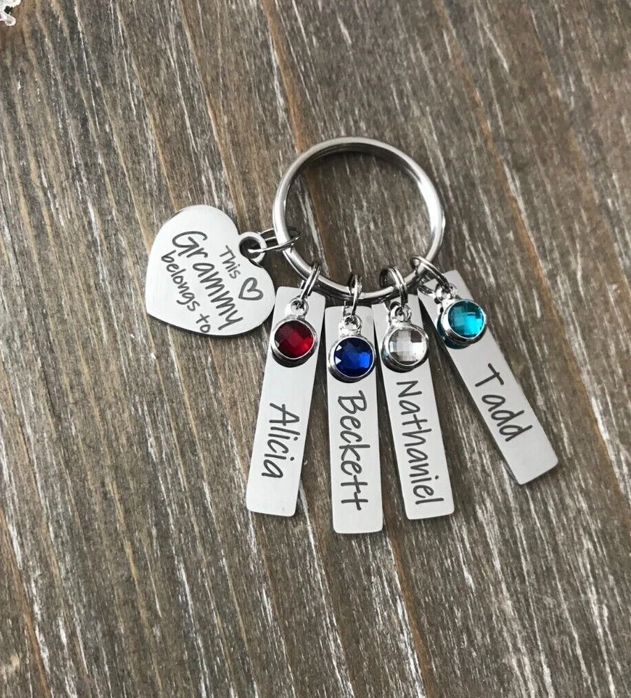 Listing is for Completed custom Name Keychain, Keychain includes heart charm with your choice of wording ( Up to 24 Characters ) and custom Bar Name charms with your choice of Names engraved ( up to 11 characters, capital letters count as 2 characters each ) and birthstones. Custom bar charms are 1 1/4" Stainless Steel heart charm is 3/4 Stainless Steel Key ring is 1" Stainless Steel Keychain will come in Gift box ready to Gift :) *IMPORTANT* Please be sure to include Names and Birth months in notes to seller during check out or in messages, if wording not requested this will come with This Grammy belongs to :) Stainless Steel doesn't need polished, will not tarnish and doesn't stain the surrounding skin. It's properties are hypoallergenic for those with metal allergies. Please be sure to check messages after purchase in case of any questions I may have so your order is not slowed :)