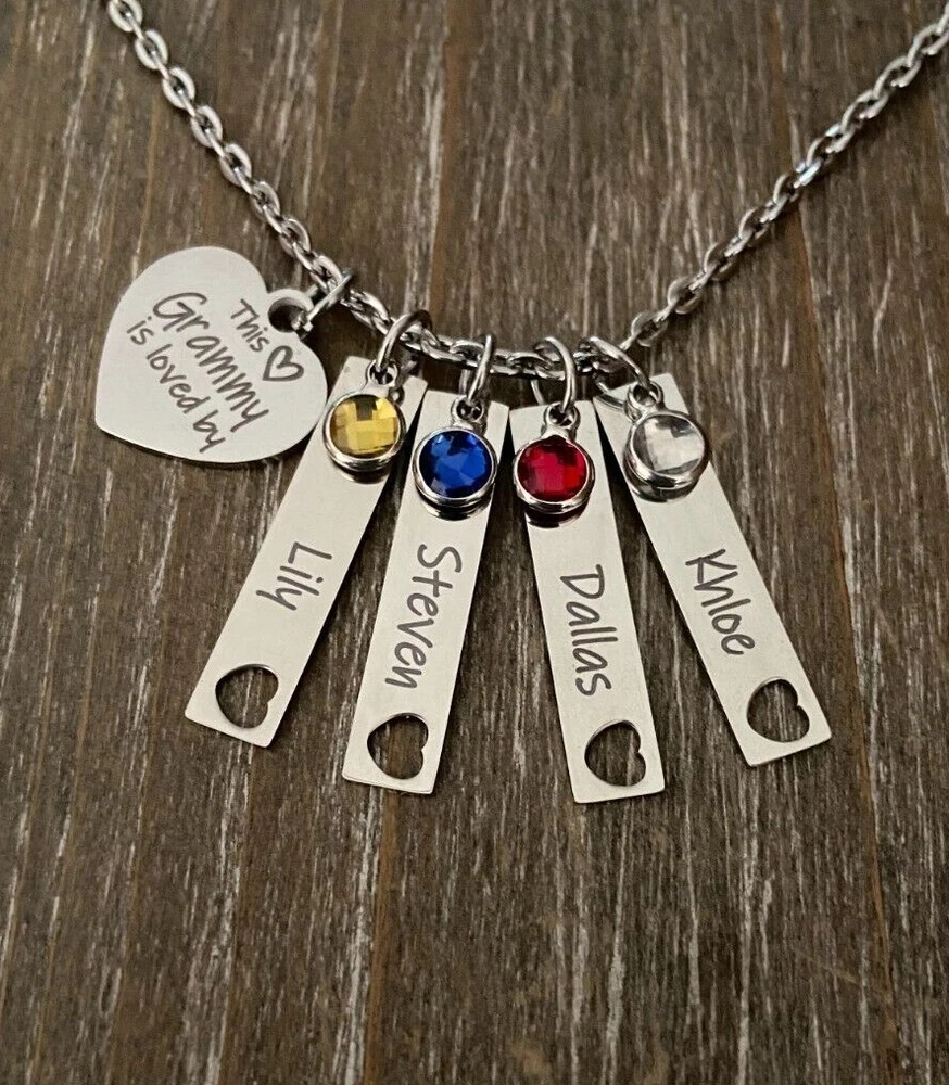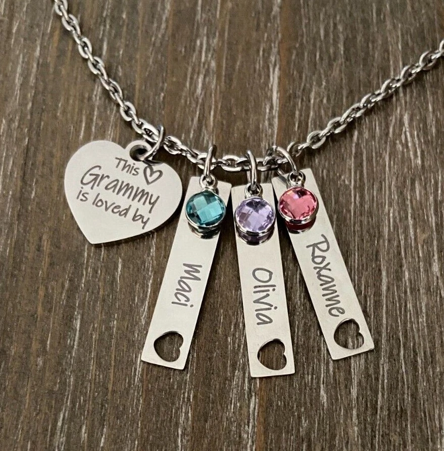 Listing is for Completed custom Name Necklace Necklace includes Heart charm with your choice of engraving ( up to 24 characters ) and custom cutout heart Bar Name charms with your choice of Names ( up to 10 characters, capital letters count as 2 spaces ) and birthstones. Chain is 18" Stainless Steel. I do also have 24" available upon request. Custom bar charms are 1 1/4" Stainless Steel Heart charm is 3/4 Stainless Steel Necklace will come in Gift box ready to Gift :) *IMPORTANT* Please be sure to include Names and Birth months in notes to seller during check out or in messages :) If requests not left for heart this will come as This Grammy is loved by :) Stainless Steel doesn't need polished, will not tarnish and doesn't stain the surrounding skin. It's properties are hypoallergenic for those with metal allergies. Please be sure to check messages after purchase in case of any questions I may have so your order is not slowed :)