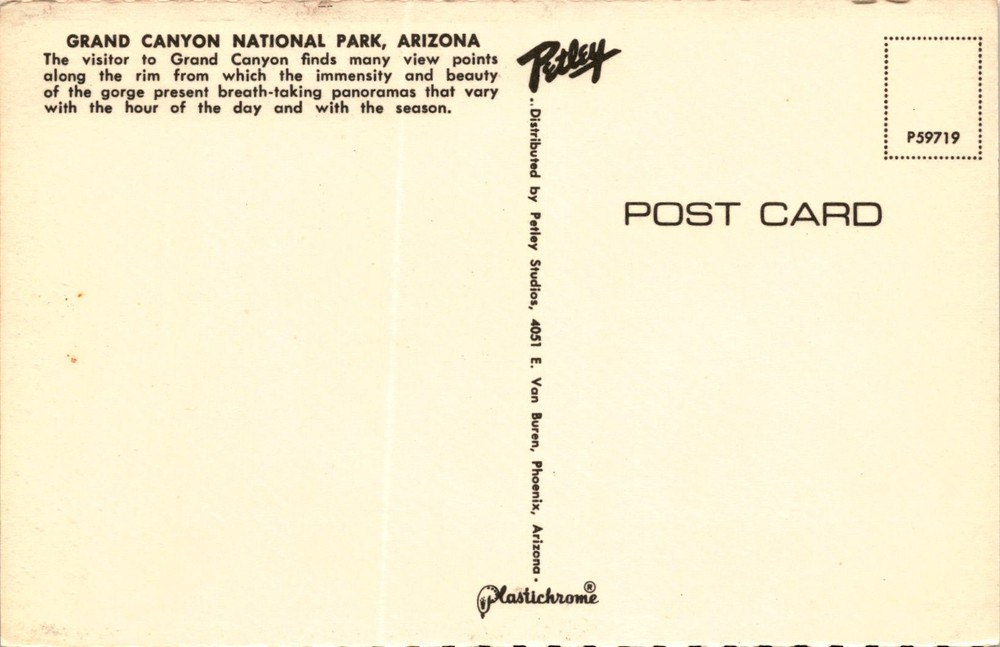 The postcard features a view of the Grand Canyon National Park in Arizona, known for its stunning and vast gorge. The park offers numerous viewpoints along the rim where visitors can take in the breathtaking panoramas of the canyon. The views vary depending on the time of day and the season, providing a unique experience each time.