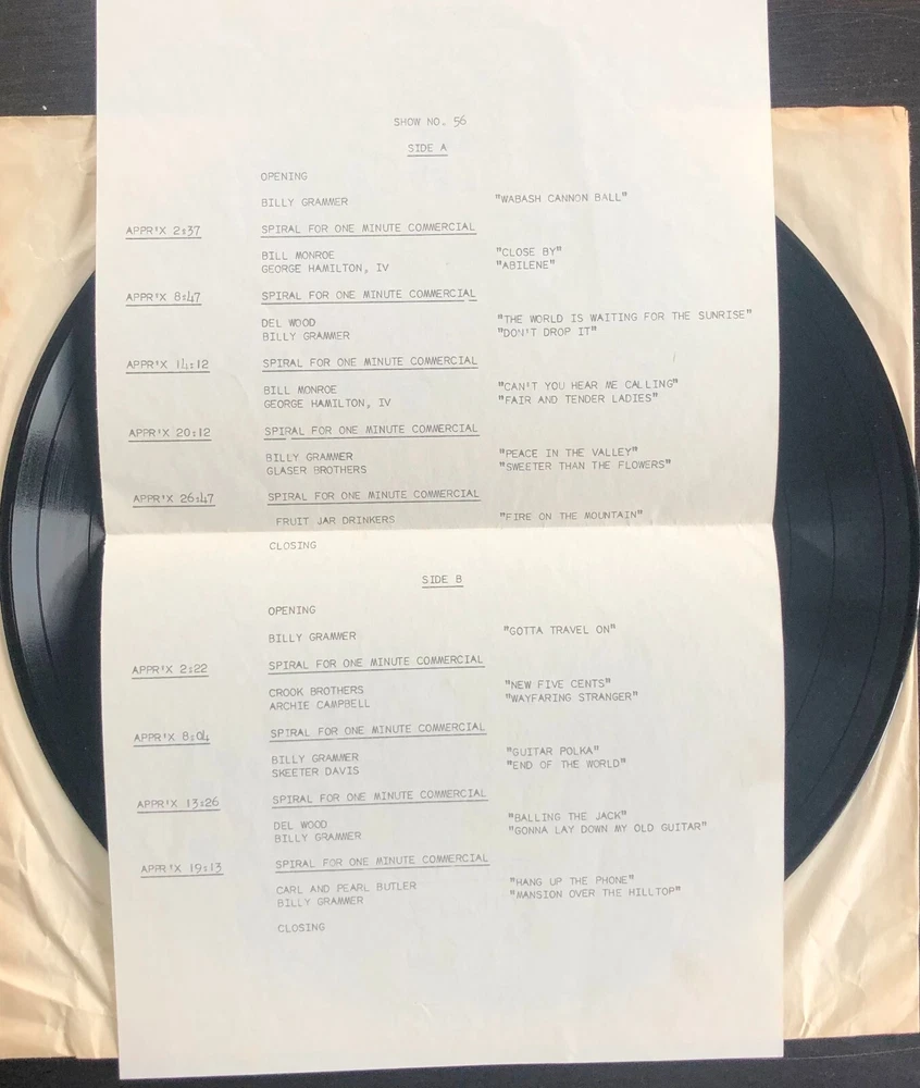 Grand Ole Opry Program No. 56 (1965) SIDE A Bill Monroe - Close By George Hamilton IV - Abilene Del Wood - The World Is Waiting For the Sunrise Billy Grammer - Don't Drop It Bill Monroe - Can't you Hear Me Calling George Hamilton IV - Fair and Tender Ladies Biller Grammer - Peace In the Valley Glaser Brothers - Sweeter Than The Flowers Fruit Jar Drinkers - Fire On the Mountain SIDE B Billy Grammer - Gotta Travel On Crook Brothers - Five New Cents Archie Campbell - Wayfaring Stranger Billy Grammer - Guitar Polka Skeeter Davis - End of the World Del Wood - Ballin' That Jack Billy Grammer - Gonna Lay Down My Old Guitar Carl and Pearl Butler - Hang Up the Phone Billy Grammer - Mansion Over the Hilltop Vinyl graded VG, Fully play-tested with no skips or pops and minimal surface noise. If you want this item shipped outside the contiguous United States (aka the Lower 48), you must contact us before purchasing. All items weighing over 1lb will incur added shipping costs. Thanks for your understanding.