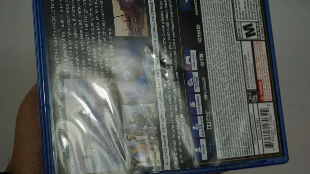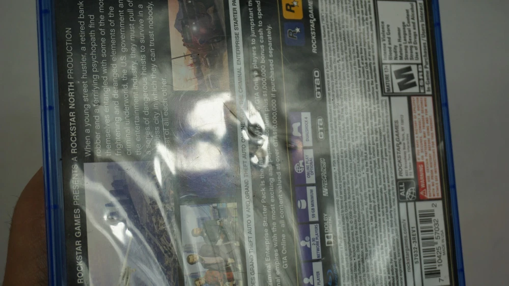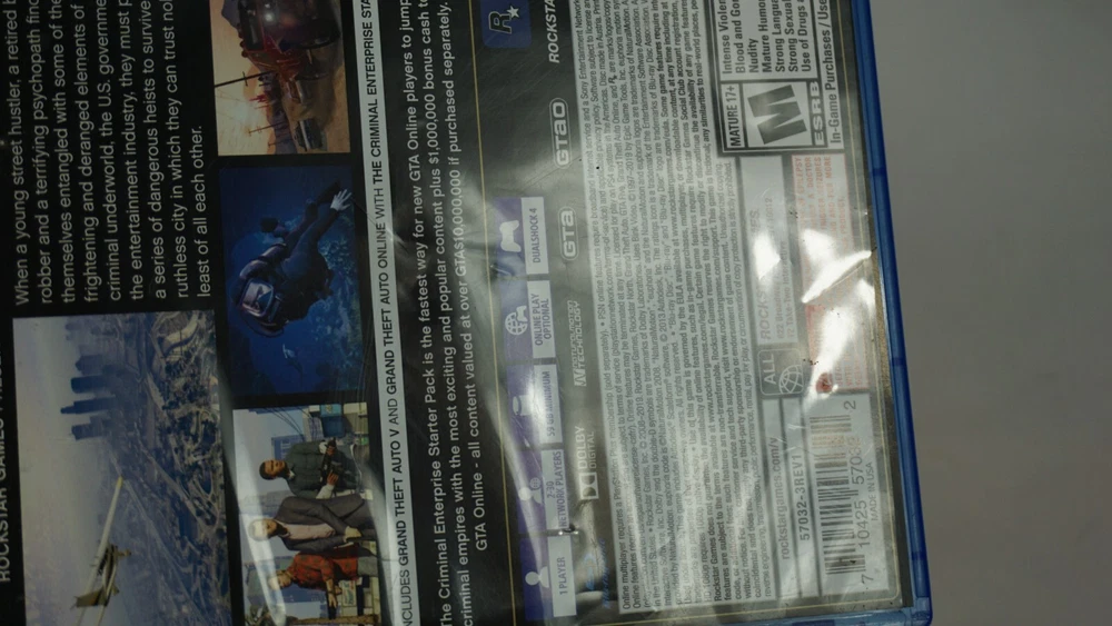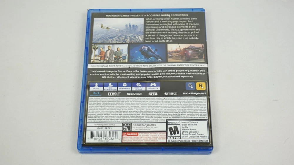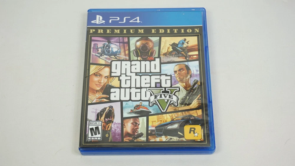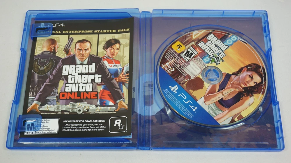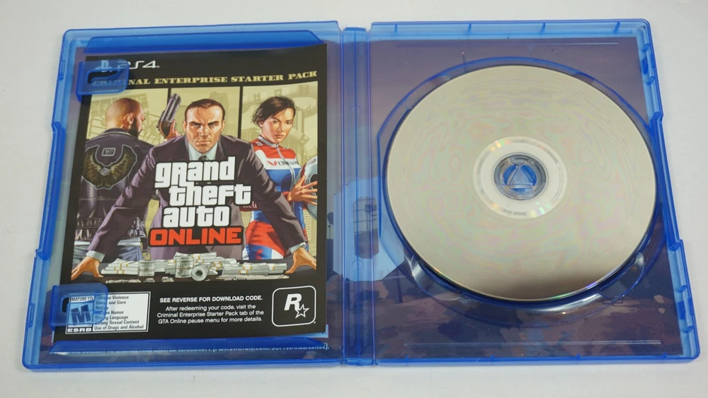 Experience the thrill of extreme sports and car racing with GTA 5 Grand Theft Auto V PS4 Premium Edition. This action-packed game, rated M for mature audiences, features an open-world environment where players can explore and complete various missions. With multiplayer and online playability, this complete edition game will provide hours of fun for gamers. This unit, manufactured by Sony Interactive Entertainment, is compatible with Sony PlayStation 4 and comes with a premium edition and Ad insert. The game was released in 2013 and has features like Grand Theft Auto video game series, extreme sports, car racing, and multiplayer. This product is perfect for anyone who loves action and adventure games. Case has dimples. Ad is clean. Disc is clean. TESTED AND WORKING! AUTHENTIC AND TESTED
