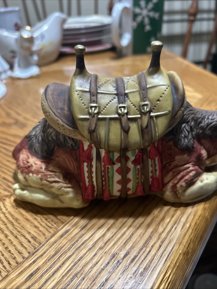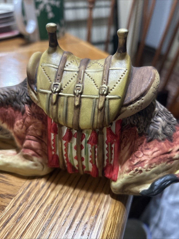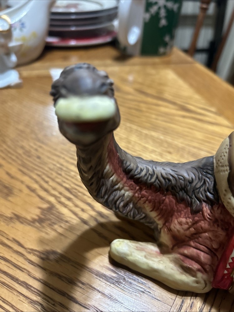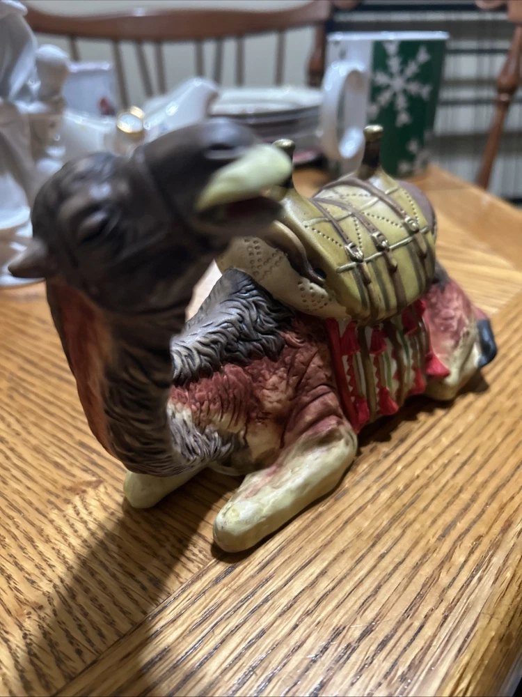 The Grandeur Noel Nativity by O'Well Novelty Co Camel N212A-1H Replacement Piece is a large, multicolored porcelain camel figurine designed for a Nativity scene. This vintage collectible, part of the Animals collection by Grandeur Noel, features intricate details and is perfect for those who appreciate religious-themed decor. It is an original piece from the 1990s, measuring 8 inches in length, 5 inches in height, and 3 inches in width. This Replacement Piece adds a touch of nostalgia and tradition to any Christmas display.