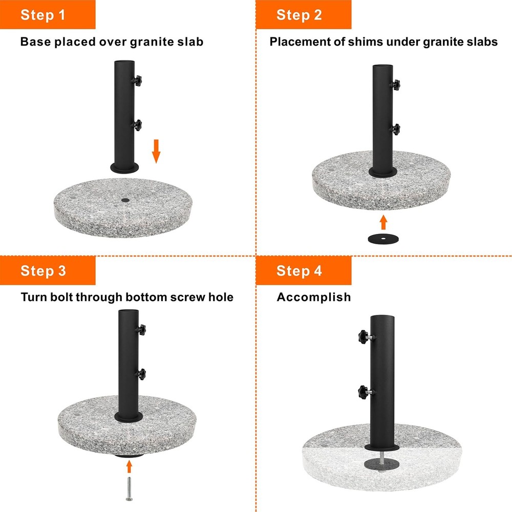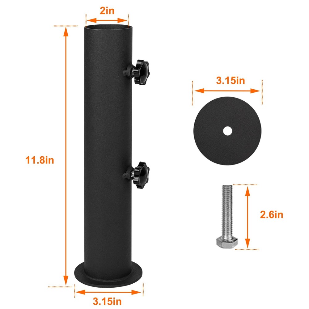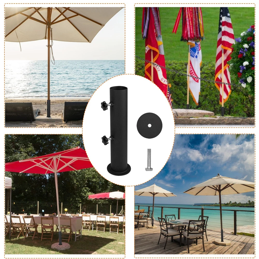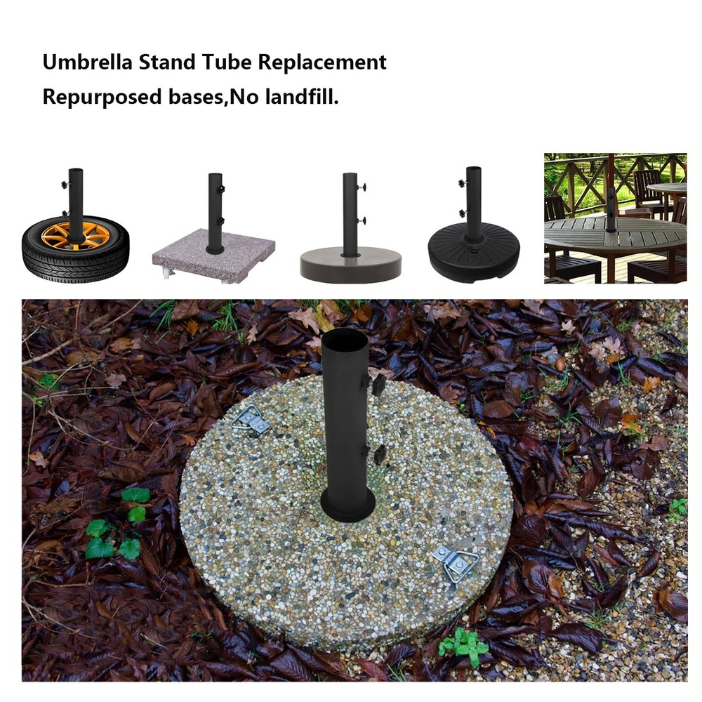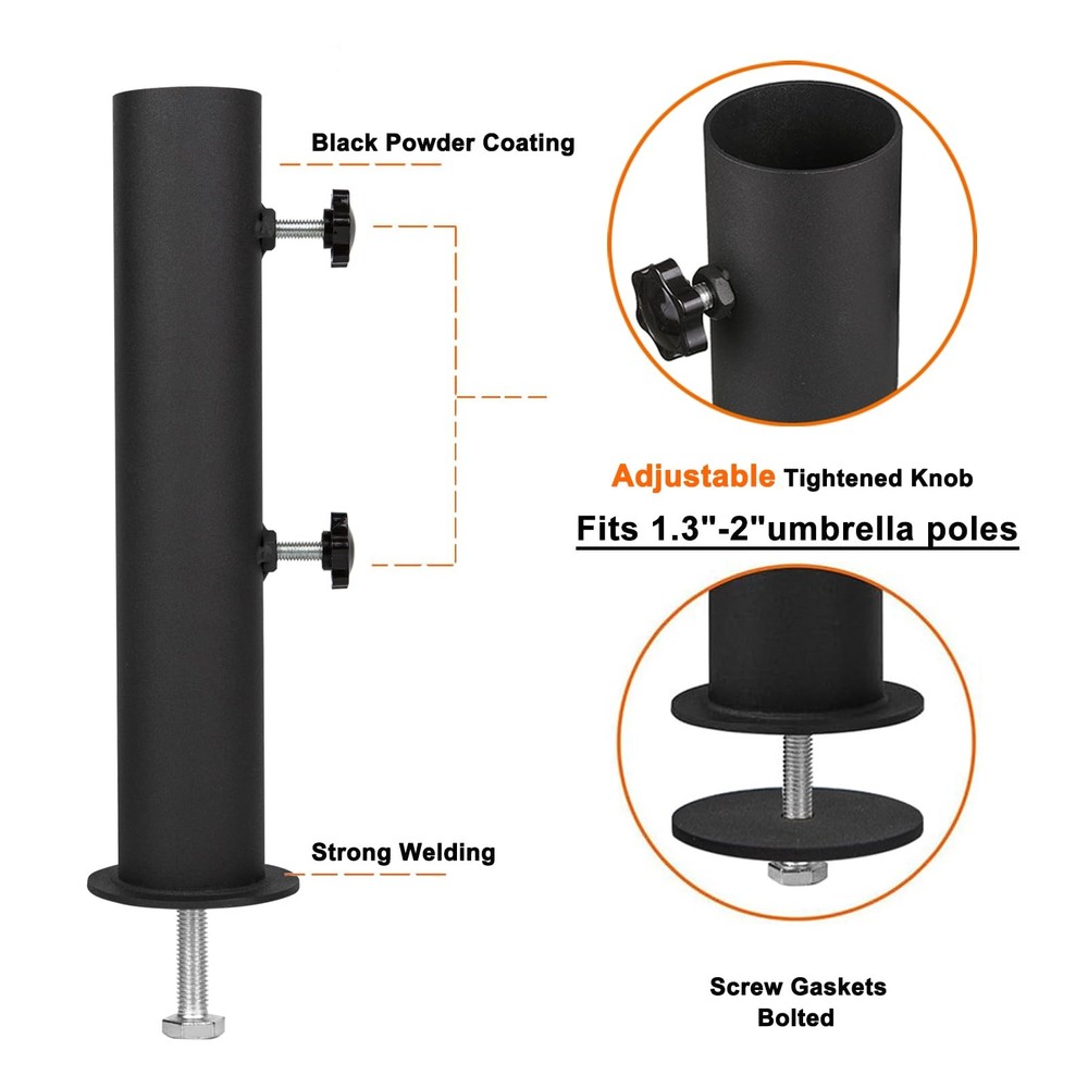 This adjustable stone umbrella base can be adjusted according to the thickness of the umbrella post.Umbrella adjustable post diameter range: 1.3"-2",the base attached to the granite provides greater stability, ensuring that the umbrella frame remains stable and does not tip over easily, even in strong winds or adverse weather conditions.Our heavy duty granite umbrella stand tube made of well materials and surface fully covered black powder coating, strong and stable for a long lasting time ,the base strong welding no easy to break and it can safely hold your patio umbrella. 【Adjustment Range】Universal granite umbrella stand can be adjusted according to the thickness of the umbrella post.Umbrella adjustable post diameter range: 1.3"-2",the umbrella pole mount stand parts set attached to the granite provides greater stability, ensuring that the umbrella frame remains stable and does not tip over easily, even in strong winds or adverse weather conditions. 【Durable and Reliable】Our heavy duty umbrella stand base made of well materials and surface fully covered black powder coating, strong and stable for a long lasting time ,the base strong welding no easy to break and it can safely hold your patio umbrella. 【Wide Application】Patio umbrella stand parts suitable be installed on granite boards, iron boards, cement boards,wooden table, slate, marble slab and can freedom of movement thatwell for outdoor use ,can provide protection from sun or rain and cover for those under the umbrella, so the granite umbrella stand tube are reliable companions for everyday life! 【Easy to Install】Umbrella stand parts set has a screw hole on the underside, you can place the metal flag pole holder on a granite slab with a spacer underneath and can instantly put the bolt through the screw hole on the underside of the table umbrella tube. (Note: Granite slabs not included) 【Product Specification】 Adjustable stone umbrella base comes with Granite umbrella base *1, bolts*1, hand-turn fastening knobs*2, ring*1.