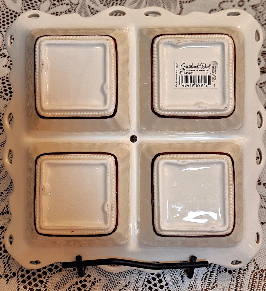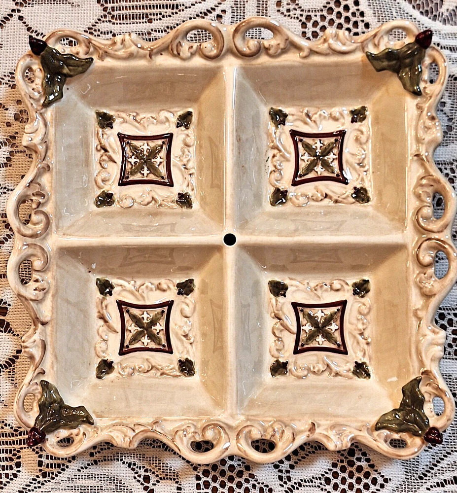 Add a touch of seasonal charm to your dining table with this 4-section ceramic condiment serving dish from Grasslands Road. The dish features a festive design of Christmas Holly in each corner and a lace edge, perfect for the holiday season. Measuring approximately 9.25 inches in length and width, and 1.5 inches in height, this dish is made of high-quality ceramic material that is easy to clean with a damp cloth. Ideal for adults, this condiment dish is a great addition to your kitchen or dining room décor. The dish is designed to serve condiments, dips, or other small dishes and is perfect for Christmas gatherings or any other seasonal occasion. This item does not require any additional parts and is ready to use. In Excellent condition. No chips or cracks. Preowned. Please see photos. Disclaimer : Many of the items I sell are vintage, antique or used, and may not be in perfect condition. They may have age-related wear, imperfections or a minor chip here and there. You may also see air bubbles in crystal items, which are naturally occurring. I will point out any and all of these to the best of my ability. Please review the photos provided carefully, read the description, and judge accordingly. All items are insured for the purchase price in case of damage due to shipping, so please do not throw away any of the original packing materials, the shipping box, or the broken item as these will have to be returned to Memory Lane Treasure in order to file an insurance claim for reimbursement of the item. The buyer is responsible for return shipping costs and reimbursement to the Buyer will not take place until the Seller has received all of the above. Please feel free to contact me with any and all questions you may have before purchasing an item—I am happy to assist. Thank you for visiting Memory Lane Treasure! Shipping and Handling : The misnomer regarding Shipping is that the amount charged only covers what it costs to ship an item by its weight. Shipping covers more than just the weight of an item, it also includes logistics costs such as packing supplies, inventory storage, transportation, and delivery. Due to the rising costs in our economy, Memory Lane Treasure has had to start charging for shipping; however, to keep the total cost as low as possible for our customers, Memory Lane Treasure has not yet started to charge a Handling fee, which is the cost of labor. Also note, that depending on the destination of the purchased item, eBay may calculate a different Shipping from what was listed by Memory Lane Treasure. Should that occur, it is not something done by our facility and Memory Lane Treasure should not be held responsible. 100% Customer Satisfaction is Memory Lane Treasure’s ultimate standard. Should a customer have any questions or concerns, they are always encouraged to contact Memory Lane Treasure before purchasing an item—I am happy to assist.