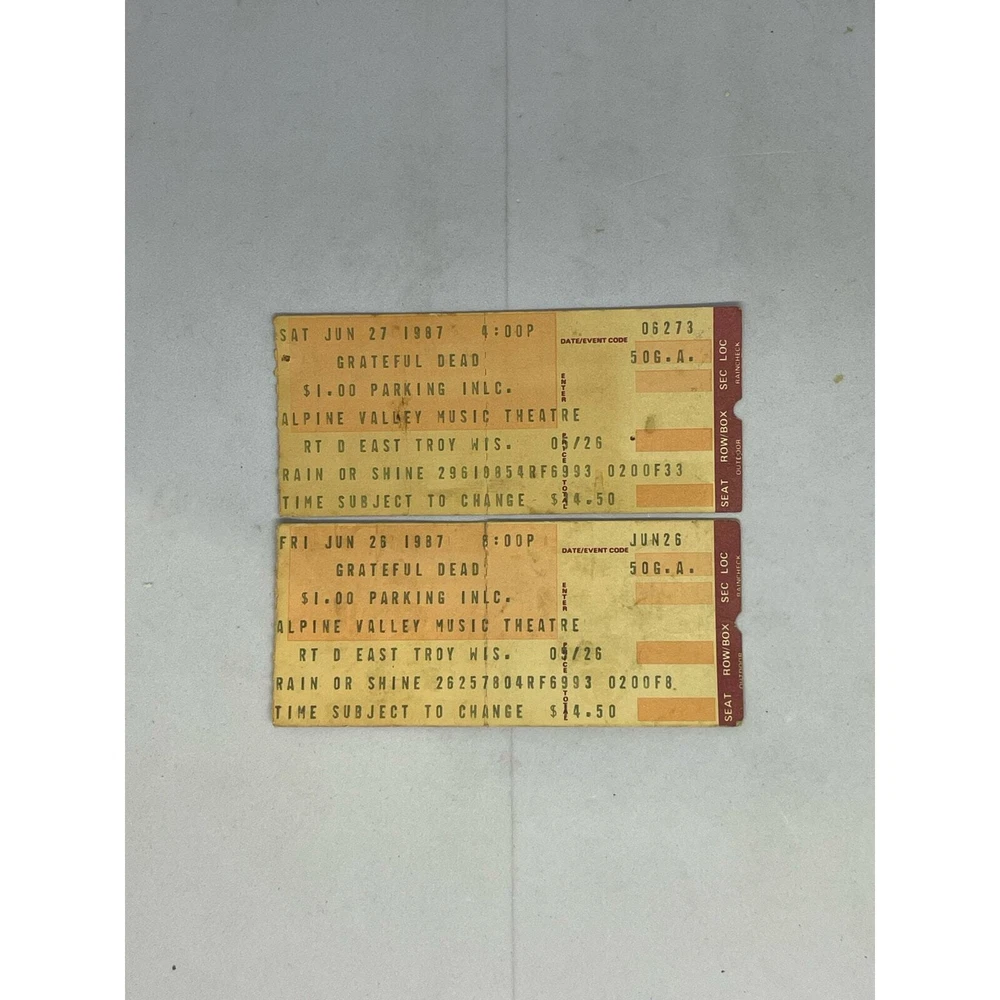 For sale is this lot of 2 Grateful Dead concert tickets. Vintage, dated June 26, 1987. Location was the Alpine Valley Music Theater, East Troy, Wisconsin. Ticketron. Good condition, minor wear consistent with age and use. See photos.