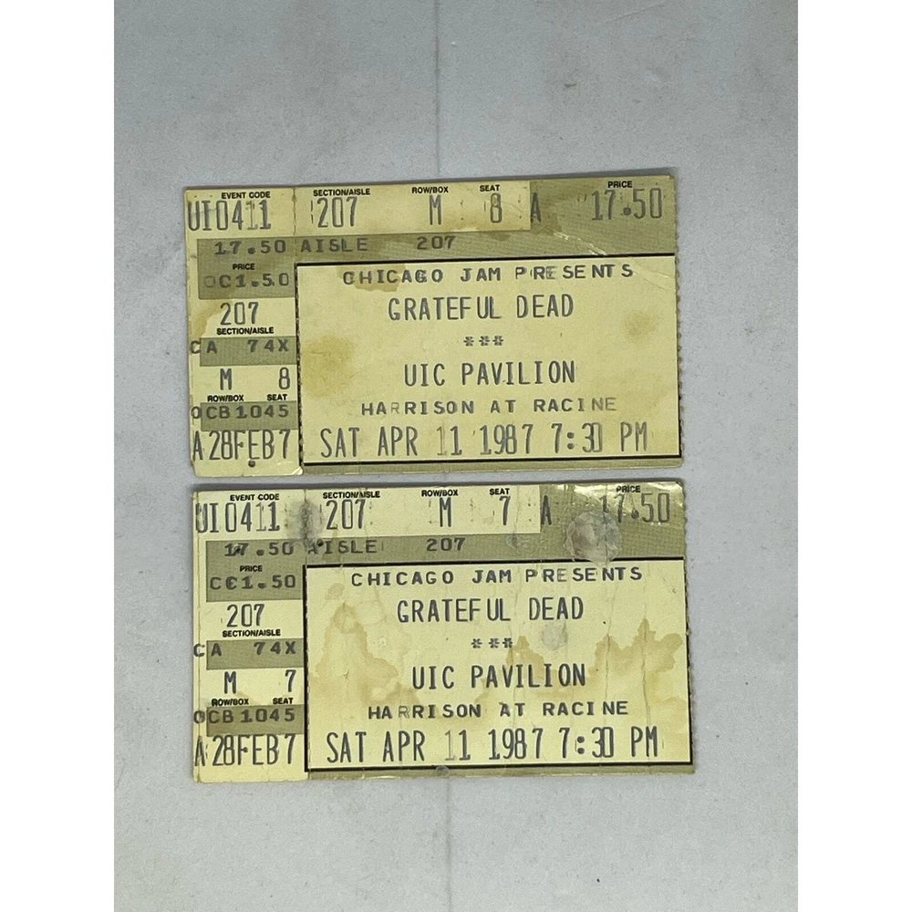 For sale is this lot of 2 Grateful Dead concert tickets. Vintage, dated April 11, 1987. UIC Pavilion (now the Credit Union 1 Arena), Chicago, Illinois. Budweiser advertising on reverse. Good condition, minor wear consistent with age and use. See photos.