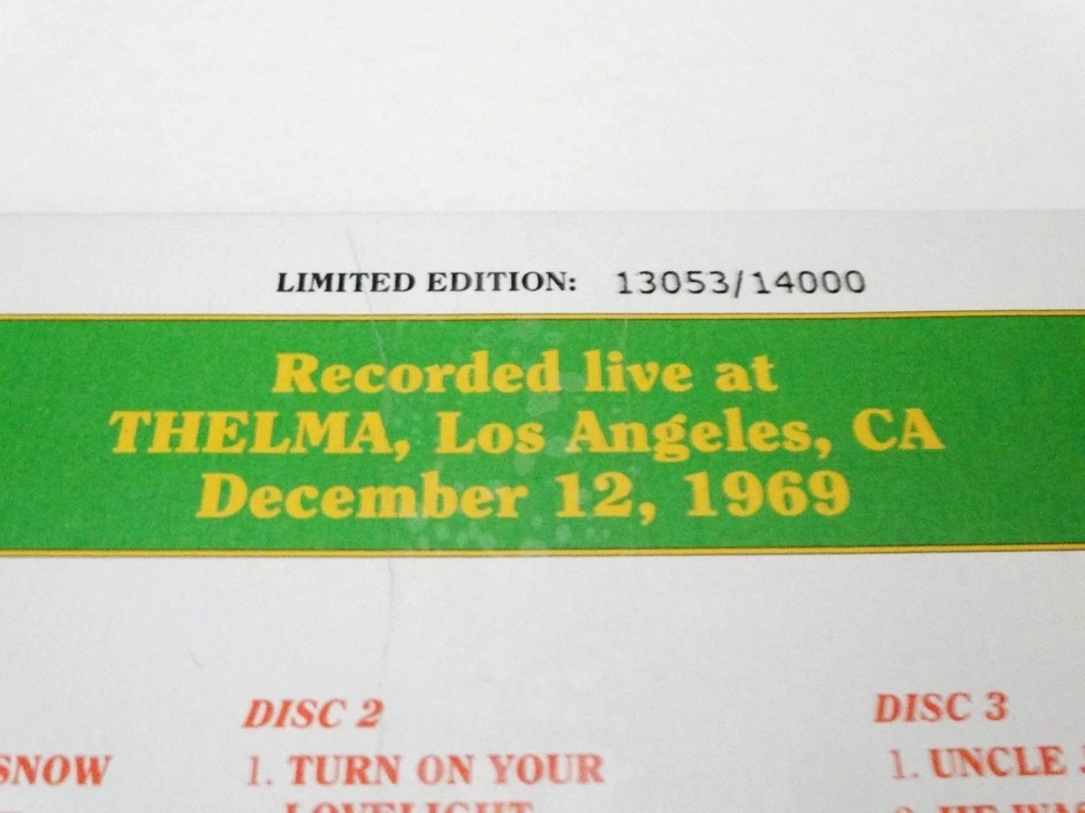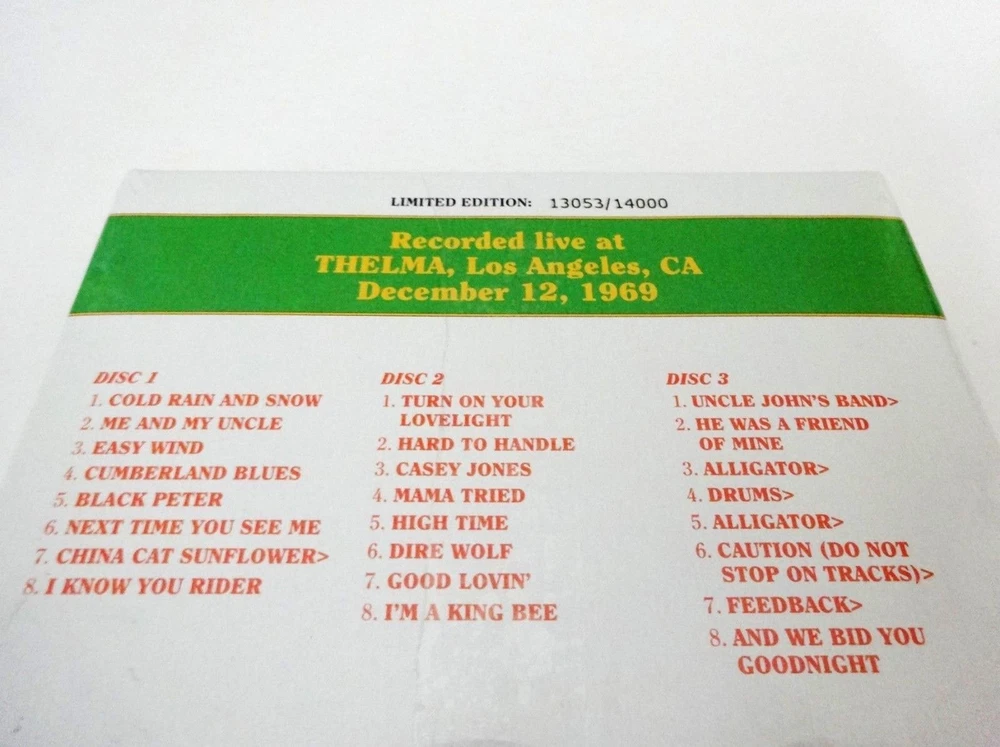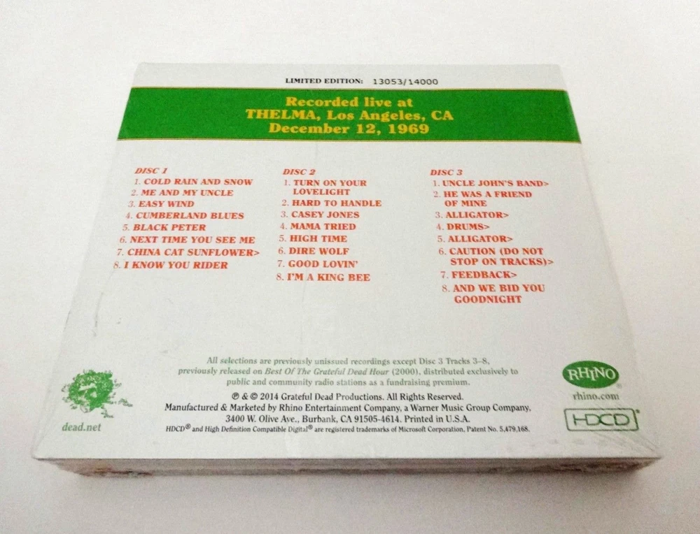 Grateful Dead - Dave's Picks 10 Volume Ten - Thelma - Los Angeles, California ( CA ) - December 12, 1969 ( 12/12/1969 ) - 3 CD - 2014 Grateful Dead Productions / Rhino (1969/2014) - R2-541134 - Limited Edition # 13053 / 14000 1969 Grateful Dead ( Jerry Garcia / Ron Pigpen McKernan / Bob Weir / Bill Kreutzmann / Phil Lesh / Tom Constanten ) - 12/12/69 December 12, 1969 ( 12/12/1969 ) - Thelma - Los Angeles, California ( CA ) Brand New / Factory Sealed - Limited Edition ( Individually Numbered 3-CD Set ) # 13053 of 14000