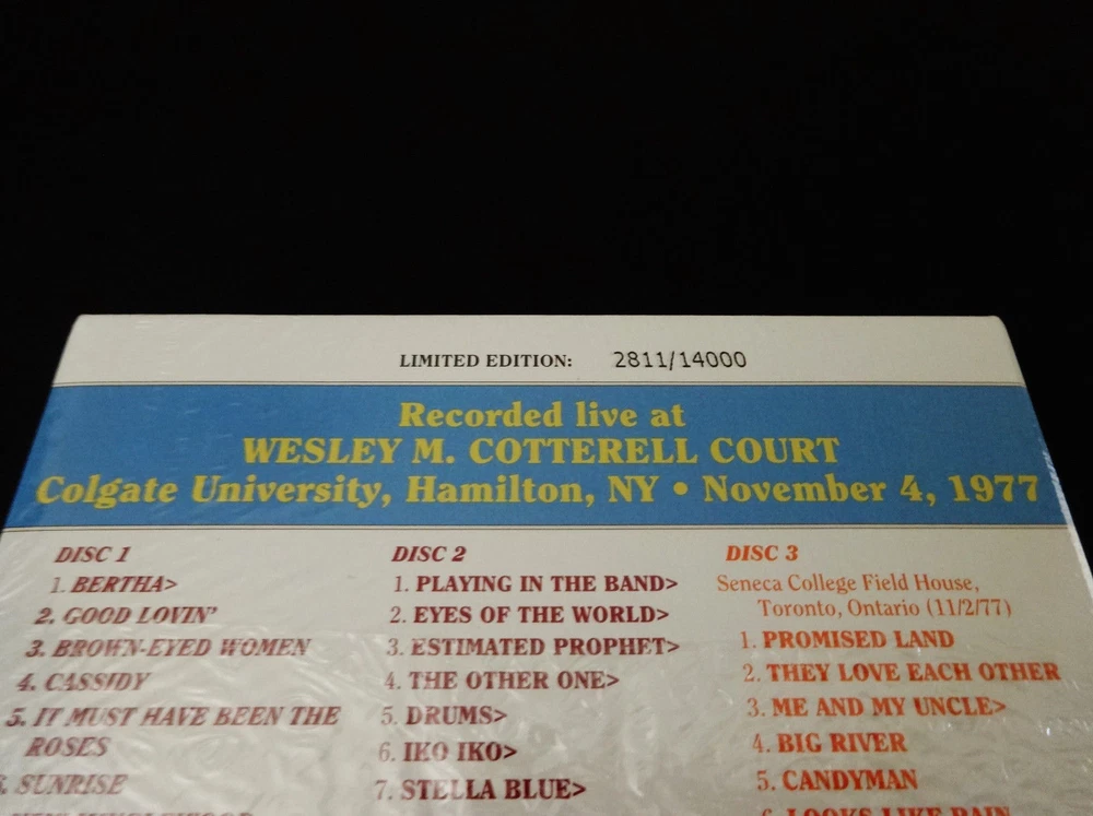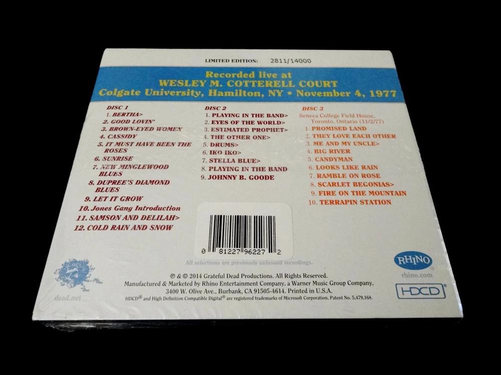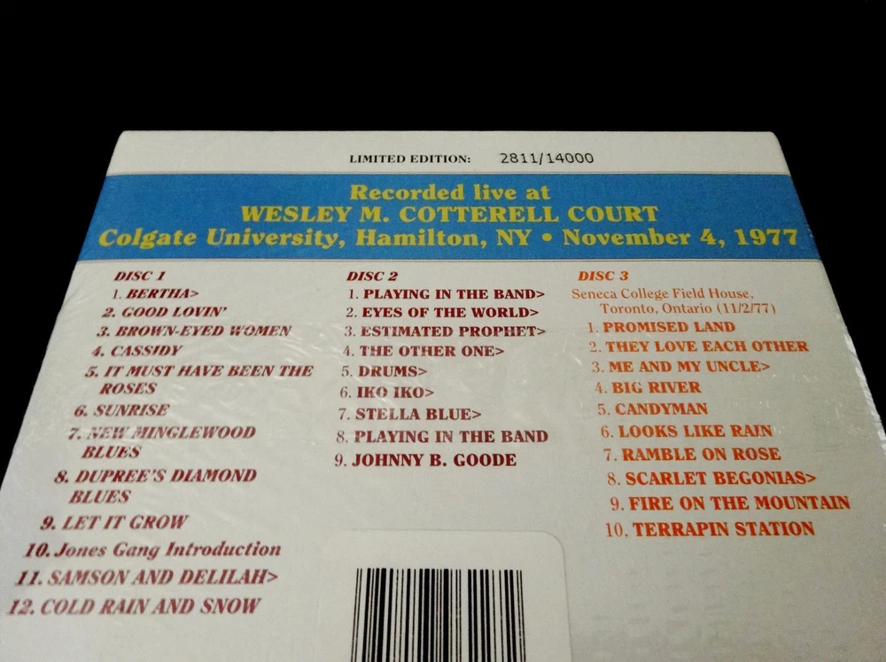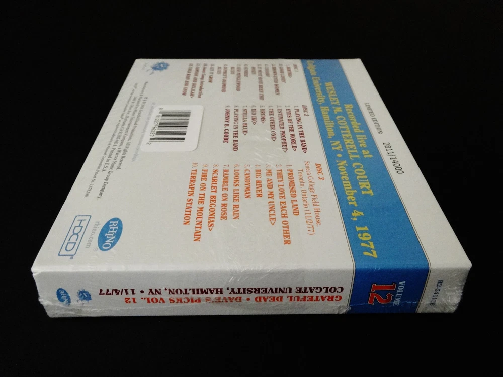 Grateful Dead : Dave's Picks 12 Volume Twelve : Colgate University - Hamilton, New York ( NY ) : November 4, 1977 ( 11/4/1977 ) : Colgate University Raiders 1977 Homecoming Dance !!! + November 2, 1977 ( 11/2/1977 ) Seneca College Field House - Toronto Ontario Canada ( CAN ) !! : G.D. Fall Tour '77 !!! : 2014 (1977/2014) Grateful Dead Productions, Inc. / Rhino ( GDP / Rhino ) - R2 541136 : 3 CD : Limited Edition Individually-Numbered ( of # 14,000 ) : Spring Tour '77 Live-Dead !! ... at Colgate U. !!! An Amazing ! installment of Grateful Dead " 1977 " Live Rock & Roll History - in a bottle !!! - and this time ... taking place at the 1977 Colgate University ' Red Raiders ' Homecoming Dance !!!!! '77 Fall Tour - Live-Dead !!! ... Wow !!!!! 11/4/1977 !!!!!!! Grateful Dead Fans !!! Yes indeed, as it has indeed arrived - and just about 37-Years after it 1st went down Live ! ... at Colgate U. !!! Pristinely Re-Mastered ! with cream of the crop Digital Sound !! Certainly nothing ' unreleasable ' about these Reels ... Whoa !!! Three shouts out to the ( lack ! ) of Ravages-of-Time, with this Audio Beauty ! Wow ... But, before we start talking G.D. here, it is of course of the utmost importance to give a Massive ! shout-out to the 1977 Colgate University Student Body ! Yep ... because believe it or not - they were indeed ! successful in making the Good Ol' Grateful Dead ( right in their '77 Prime ! ) the ' Official ' Colgate University " Dance Band " for their '77 Homecoming Weekend !!! Yes !!!!! The Colgate Raiders managing to convince the power-that-be ( or were in '77 ! ) to actually allow the Grateful Dead ... and obviously, the Grateful Dead Touring Fan Faithful ! to descend, or in some cases - even Land ! from places elsewhere ( & likely from 11/2/1977 Toronto ! ) right smack-Dead ! on the Colgate University Campus ... at Wesley M. Cotterell Court ! - the Proud Home of the Colgate University Raiders !!! And, as far as on 11/4/77 goes ... the Proud Home of a Rippin' !!! '77 Dead Show - Live & In-Action !!!!! Dang ... Wow. So yes, all of you other ' Student Bodies ' out there have quite a bit to live up to ... to be just like, and as Cool ! as the Colgate U. Class Of '77 was -- able to draw the Grateful Dead for their School Homecoming Dance ! Simply-Amazing ... And Musically ?? Oh my goodness, as where do I even contemplate-beginning to start with this one ?!? 1977 ? Check ! A Grateful Dead Prime Era ? Check ! A New York region High-Energy Show ? Check ! A Childhood Favorite ! Tape of Myself & Many ! Dead Fans ? Check ! Garcia & Co. Feelin'-Groovy ? Check ! And ... just 2-Days before 11/6/1977 Binghamton ?? Check !!!!! I guess I could just stop there, right ? Nahhh ... as there is just too-much G.D. Live-Heat ! on this very-very Hot ! Colgate U. Homecoming " Dance ". Hey, I mean you wanted a Dance ... and You-Got ! a Dance !!! Being '77 Fall, and all ... the Band is just Silky-Smooth ! - just like you'd well expect, but all throughout this Show - song-by-song... the little extra " Umphhhs !! " appear. And seriously, it happens to the point - where it looks like they are personally challenging themselves as a collective unit to leave no vocal or jam-pocket stone unturned !! Little vocal-extras, treble-twangs & accents in the ' right ' spots, backing vocals, rhythm playing - from the Guitar, Keys & Bass ! spots ... just all-of-the-above ! And Vocally ? - wow ... do our Heroes sound great here -- and, I can't help but saying it ( again, as usual ) ... but, Garcia's Vocals specifically - just sound Exceptional !!! There is tone-bliss all over the place & Everywhere ! all throughout both of these 11/4/77 Sets ... Spectacular ! And, saying up front that Phil's little " Jones Gang " thing is totally fun & funny ... Ha ! -- but, after that salute ... it just gets tough -- Really-Tough ! to pick personal favorites from this Show ?!? Wow ... well, for me, I'd have to say that the Let It Grow ! - Other One ! - the Iko > Stella ! are probably my personal " Noteworthys " from this fluid, tight & Stellar ! G.D. '77 Fall performance. And ... if your aren't already ' in the know ' - well, this wasn't the longest Dead Show ever ... though still way-up-there in ' Quality ' - But ! It even actually fits entirely on the 1st Two ( 2 ) Discs on this 3-CD Set ! So, that means that You ! are indeed treated to a 3rd CD Surprise !!! And, that surprise ... is indeed the ' Show-Before ' !!! 1st & 2nd Set hand-picked selections from the also Legendary '77 Tour 11/2/1977 Seneca College Field House Show - in Toronto, Ontario !!! A Show with not only tip-top Beautiful ! '77 tempo versions of T.L.E.O. & Ramble On Rose from Set I ... but also one of ' The ' Exploratory ! versions of Scarlet > Fire !!!!! in Set II! And, a Terrapin Station too - that offers all of the '77 build-up that you might expect ... almost approaching its 1st Birthday ! Wow, and what a G.D. year to be born-in ! ... 1977 !!! When I first caught word that word that this '77 Seneca / Toronto Show was going to be the little ... or, as I should say - the Huge !!! Extra - I was sure psyched. It Definitely ! made my Dead Fan day ... and as if 11/4/77 just isn't enough by itself !?! Wow ... so here indeed is the conclusion that I've ' very-quickly ' made --- 11/4/77 + 11/2/77 = Dead Fan " Must Have ! " Ha !! Now, just go & imagine that. Enjoy !!!!! TRACK LISTING >>> Grateful Dead recorded ' Live ' at Colgate University ( Wesley M. Cotterell Court ) in Hamilton, New York ( NY ) on November 4, 1977 ( 11/4/1977 ) : Disc 1 : Bertha > Good Lovin' Brown-Eyed Women Cassidy It Must Have Been The Roses Sunrise New Minglewood Blues Dupree's Diamond Blues Let It Grow Jones Gang Introduction Samson & Delilah > Cold Rain & Snow Disc 2 : Playing In The Band > Eyes Of The World > Estimated Prophet > The Other One > Drums > Iko Iko > Stella Blue > Playing In The Band Johnny B. Goode Grateful Dead recorded ' Live ' at Seneca College Field House in Toronto, Ontario ( ONT ) on Nov