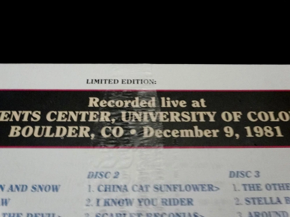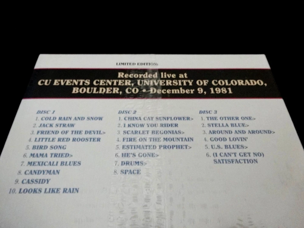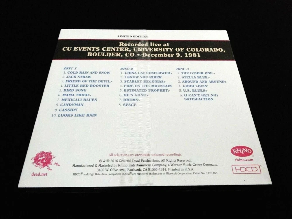 Grateful Dead : Dave's Picks 20 Volume Twenty : CU Events Center - University of Colorado - Boulder, Colorado ( CO ) : December 9, 1981 ( 12/9/1981 ) : 3 CD : 2016 (1981/2016) Grateful Dead Productions, Inc. / Rhino ( GDP / Rhino ) - R2 552292 : Unnumbered ' Promo ' Set ! : Brand New / Factory Sealed ! : Rare !! Only the " 2nd Taste ! " of '80's Grateful Dead !! ... " Early '80's " G.D. !!! ... delivered by the Limited Edition " Dave's Picks " Series ... straight from the University of Colorado - in Boulder, Colorado !! ... on the Winter Tour '81 !!! Mean !! Garcia !!!!! Dead Fans !!! Now we are talkin', right ? Three Cheers for '80's G.D. !!! ... the Official " 2nd " Installment of '80's-Dead ! from the Dave's Picks Series !! And too, even a little " Nastier ! " than the 11/30/80 Atlanta ( Dave's Picks 8 ) release as well - at least to my humble Dead Fan ears. Ha ! Well-post the " Go To Heaven " Era - and Garcia is just a little bit more in that one & only ... down & dirty " Jerry Guitar ! Zone " !!! Which, he lived in mostly ( & so-Thankfully ! ) in that Mesmerizing !! Late '70's / Early '80's to Spring 1986 " Fret Board " Focused ! G.D. Rock & Roll Era !!! Wow !! As That ! indeed is the Ballpark that this-here Dead Fans just-loves to play in. And this ' Pick ' - I must admit ... it Completely !?! caught me a bit by surprise ! And, a Real-Pleasant-Surprise ! at that. How this one got out on pro-release before the 1980 ( ' Un-Official ' 15th Anniversary ) CU Boulder Shows is beyond me ... but wow - as I'm So-Incredibly Grateful ! I mean here you go Dead Fans !! ... and most-likely too - Fans of CU !!! Well-over 40-Years Ago ! ... on the '81 G.D. Winter Tour !! ... as the Good Ol' " '80's " Grateful Dead Absolutely Rock & Rolled !!! the CU Events Center - on the Proud Home-Turf ! of the Colorado Buffaloes !!! The Glorious ! December 3, 1981 ( 12/3/1981 ) Show Pro-released as a part of the Dave's Picks Series ( Dave's Picks Volume 20 ! ) at the University of Colorado Events Center - in Boulder, Colorado ( CO ) !!! This Tour Stop in Boulder was the Final-Night of a short 6-Show Winter Tour run in the Mid-West / West ! ... and a Hot ! one at-that !! Grateful Dead ' Winter ' Tour in '81 - with likely the greatest-importance being ... " So Boys, Just How-Was that Europe Tour !!?! " So do you catch my drift on this one ? There were only really Six ( 6 ) ' immediate ' changes to hear how things were sounding for the Band, after a fairly-sizable - and significantly-underrated ! " Europe '81 " Tour ! - a sort of " Home at ( instead of ' Winterland ' ) - University of Illinois > Madison, Wisconsin > Market Square in Indiana > the Rosemont Horizon in Illinois > Des Moines, IA > University of Colorado - at Boulder ! " Well, you know - not quite ' Home ' -- but still definitely " back-home " in the U.S.A. ... with the U.S. Dead Fans !!! I believe the 1st taste I ever did score on tape of this '81 mini-Tour was from the 12/5/81 Market Square Show, and ... I kind of did a bit of a double-take, because I really was short on '81 G.D. following the Europe Tour ?!? Well, I fixed that ... real-fast - with the Dane County ( 12/3/81 ) show being the next, and then this Smoker ! of a 12/9/81 Boulder Show, and then the U of Illinois Show too - right after. In the '80's, Soundboards from this run were indeed few & far between - as most Folks I knew at the time were circulating Audiences - and, very-nice ones at that. Everybody seemed to want these Shows dialed - as the Band was So-Hot ! ... plenty Fast & Quick ! too often, on tempo & timing ... Challenging themselves & the Audience too ! - in a Grate-way ... I mean " how hard can you Dance " !!? Ha ! Some of the Prime / Primary days of the " Lay It All Out " '80's G.D. Attitude, with copious-chances being taken ... which often equal = G.D. Live-Magic !!! Another source of the popularity of this run, is that it indeed included a few College Town Shows - and, if the Show wasn't actually " at " the College, there was one not too far away, around the corner ! With, this 12/9/1981 Show right in Boulder ! on Campus !! being no-exception - and really being the norm as of late, in fact in 1980 / 1981. As the Band also choose to deliver a Red-Hot !! 2-Show run on Summer Tour '80 at CU Folsom Field ... as the Official / ( Un-official ) / Official !!! " 15th Anniversary Shows " of The Grateful Dead !!!!! Why not in Boulder, right ? One-of the Prettiest ! Towns in the U.S.A. ... and in the Early-1980's ?! Wow !!! And here in '81 these were really still the days where a 12-Song 1st Set was a possibility, while at this Show - the Band delivered one, and delivered it very-nicely !! Cold Rain > Jack Straw to Open ! Denver-Man ... Yeah ! A hot Rooster, and a way-exploratory Bird Song ! One of ' those ' Bird Songs that almost needs to be played in an ' Indoor ' Venue ... so-delicate. The Cassidy was Weir / Garcia Lightning ! ... and, saving the best of last naturally in Set I ..... China > Rider !!! in the 11/12 spot ! Killer !!! Scarlet > Fire ! opened Set II - and, a lengthy & juicy one at-that ! The Other One Smoked !!! And, Bobby brought some serious-action in the Good Lovin' - 1981 ... the emergence of Bob Weir !! - Love-it. U.S. Blues > Satisfaction ( Hot !! ) for the Encore, and that was all she wrote for this little " Huge ! " '81 Winter Tour - with only a small handful of California dates to follow. Wow ... and check this out too Fans --- as this 12/9/81 Show was actually the Very-Last & Final ! Grateful Dead Show ' Ever ' in Boulder, Colorado !!!?! Dang though, did CU Boulder ever get a toe-to-toe '81 G.D. Heater right here !!! A Fantastic Dead Show ! ... Incredible ! Audio-Sound !! ... and a Very-Fine ! Audio & ' Artistic ' Piece of G.D. & CU Boulder Colorado History !!! Enjoy !!!!! TRACK LISTING >>> Grateful Dead ' Live ' at University of Colorado - Boulder ( CU Events Center ) – Boulder, Colorado ( CO ) - December 9, 1981 ( 12/9/1981 ) : Disc 1 : Set I : Jack Straw