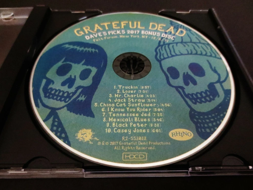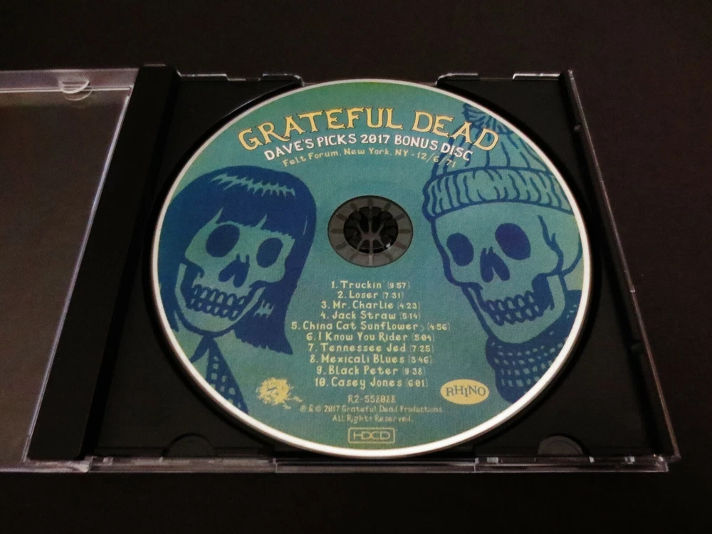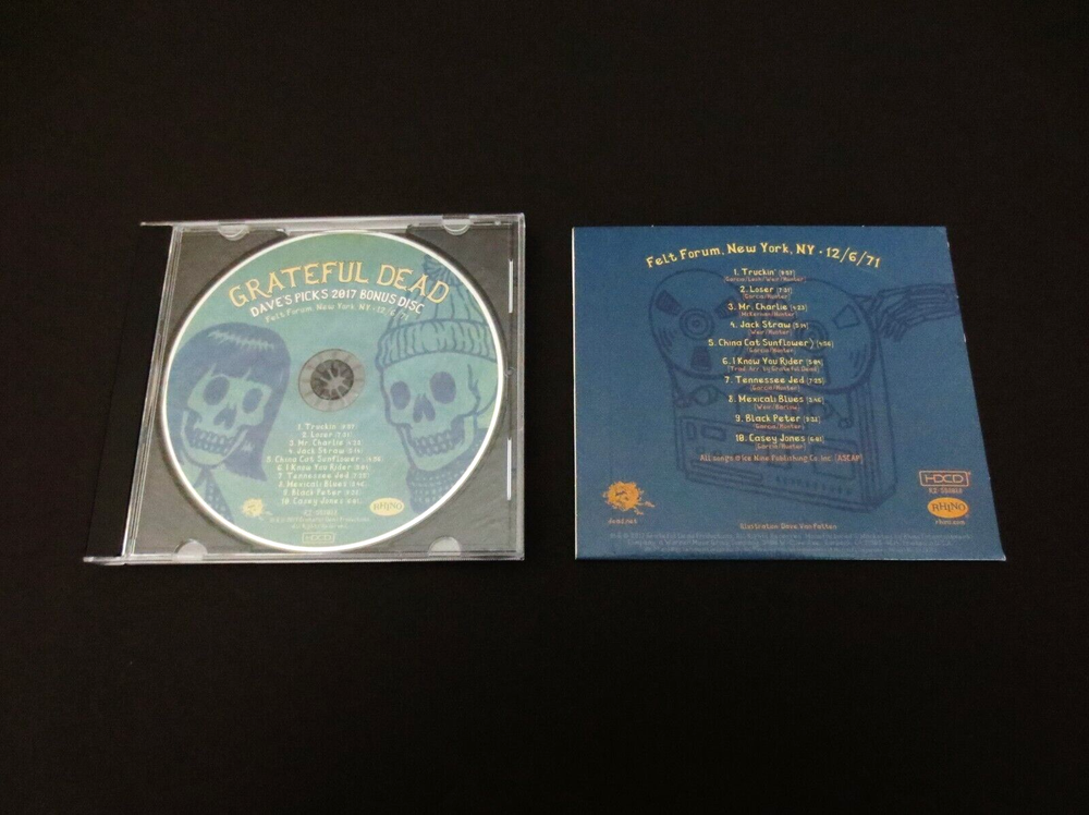 Grateful Dead : Dave's Picks 2017 Bonus Disc : Felt Forum - New York, New York ( NY ) : December 6, 1971 ( 12/6/1971 ) : ' Bonus Disc CD ! ' 1-CD ( from Grateful Dead Dave's Picks Volume 22 ( 2017 ) release ) : 2017 (1971/2017) Grateful Dead Productions, Inc. / Rhino ( GDP / Rhino ) : Limited Edition Annual-Subscription ' Only ! ' Bonus Disc CD : Winter Tour '71 ... at ' The Felt !! ' : Very Rare ! The Amazing !!! 1971 " Good Ol' Grateful Dead " at the Felt Forum ! - from Winter Tour '71 !! ... and to our Collective & Delightful " Grateful-Amazement " ! - it's not from the 12/4/1971 Show, or even the 12/5/1971 Show - but instead ... from the 12/6/1971 Show !!! Wow ... as isn't Life ' Still ' just chocked Full ! of Grateful Dead " Surprises " !! - even-in 2017 !!! Hurrah ! & Cheers !! to some Rockin' ! & Rollin' !! Late '71 Live-Dead !!! ... straight from " The G.D. Vault " !!!!! It is time indeed ... for all of those " Good Ol' " Grateful Dead Fans !! out there to ' Fall-In ' for the Dave's Picks 2017 Bonus Disc CD !!! What a Call ! from that oh-so Precious ! G.D. Vault ! for certain - as the very-first second I saw that this '71 Felt Forum Shows run would be included on the " Dave's Picks 2017 Bonus Disc CD " - I found myself pondering in sheer Amazement ! ... & naturally too ... serious Excitement !!! As hey, let's face it - at least as far as the " Last Millennium " went - if you wanted a Sweet-Taste ! of G.D. Live Power & Precision on '71 Winter Tour at the Felt Forum ... you really had no choice but to go for either 12/4/1971 or 12/5/1971 ( Shows # 1 & # 2 ( of 4 ) ). As the true fact & reality of the matter was ( for, what pretty much what seemed like ' Ever ' ) that tapes from this 12/6/1971 Show were simply not available, or really ... attainable - at least as far as I knew. Because trust me ... I combed Trader's list after lists, after lists hunting for this 12/6/71 Show ( & the 12/7/71 Show too - from the Dave's Picks 22 release ) - for years ... and the hunt was always to no avail. In fact, I even distinctly remember having conversations with some real serious Tapers & Tape-Traders too ( back, in those Glorious ! " Analog " Daze ... ) - and, the simple word on the street was that no-one had, or had even ' heard ' the ' Other ' Shows from this Huge ! Winter 1971 Fall Tour stand at the Felt Forum. I mean ... to put it bluntly, just go & track down the 12/5/71 " Dark Star " ( you'll be glad you did ! ) - as it speaks very loudly & very clearly why this is an Absolute ! Dead-run, where you Absolutely-Must ! hear It-All !!! My guess initially ( like, well over 25-years ago ... ) was that the available 12/4/71 Show circulated fast ( mainly ) because of the " Run Rudolph Run " played, and the 12/5/71 Show circulated ( obviously ... ) because it was an FM Broadcast ! Live & Direct from WNEW-New York - if, my memory does serve me correctly. So, the only question left was for sure the obvious one ... " What about some Live-Dead action from this 12/6/71 Shows ? " from this Red-Hot ! G.D. 1971 Winter Tour run !!!? Well, Three-Cheers !!! to 2017 ... because Now ! & Finally !! --- Here You Go !!! And my oh my ... was it Ever ! worth the Ride !! ... & " The Wait " !!! As Yes ! my fellow Dead-Loving-Fans ... the Truckin' ! - Loser ! - Mr. Charlie ! - Jack Straw ! - China > Rider !! - Tennessee Jed ! - Mexicali Blues ! - Black Peter ! ... & Casey Jones !! - are All ! on this G.D. Dave's Picks 2017 " Bonus Disc CD " !!! Wow ..... as this truly is one of the Gems ! from this G.D. release series - and especially... for all of the " Good Ol' " Grateful Dead Fans. In fact, I'm not so sure a better call from the Vault in all of " 1971 " could even be made ?!! Well, you know - either that ... or I'm just So ! Personally-Gleaming ! from ear-to-ear ( with a Grateful Grin ! ) that some more of this '71 Felt ! run has Finally !! been ... ' Set Free ' !!! - or, " Free As You " as it was once so-well said ... in Rock & Roll !! All of that Deliciously-Twangy ! Garcia Guitar work that your Dead Fan Heart ! could ever desire. And too ... just less than 6-months as well before - Europe '72 ! - the '72 Academy Of Music ! run, and all of that other Grate ! '71/'72 Live stuff. And, as a final note too to sum up my overall thoughts on this one, as far as G.D. modern digital pro-releases go ... I Loved ! the Austin & TCU ( Road Trips ) release from Fall Tour '71 - and in listening to This ! '71 Felt Forum release ?! ... it was much of that same ( awesome ! ) warm fuzzy feeling - and honestly, maybe even more-so ... considering that this is a solid chunk of the 12/6/71 Felt Forum " New York " Show that we are talking about here. My goodness ... & just Nothing ! short - of Glorious !!! Enjoy !!!!! TRACK LISTING >>> Recorded ' Live ' at the Felt Forum in New York ( NY ) on December 6, 1971 ( 12/6/1971 ) : Dave's Picks 2017 Bonus Disc CD ( Disc 4 / Bonus Disc ) / December 6, 1971 ( 12/6/1971 ) ) : December 6, 1971 ( 12/6/1971 ) >>> Truckin' Loser Mr. Charlie Jack Straw China Cat Sunflower > I Know You Rider Tennessee Jed Mexicali Blues Black Peter Casey Jones Item Condition : This Rare ! ( 2017 GDP / Rhino release ) Grateful Dead Dave's Picks 2017 Bonus Disc ( Felt Forum - New York, New York ( NY ) - December 6, 1971 ( 12/6/1971 ) ) CD ( 1-CD ) is in Very Good condition - close to Very Good/Like New overall. CD is in Very Good condition with very light marks/scratches on the playing surface (please see photos). CD Case ( ' Artistic ' Single-Sleeve ) is in Very Good condition - close to Very Good/Like New, with very light corner indentations (please see photos). This 2017 Bonus Disc CD has been carefully stored inside protective plastic in my professional CD rack. CD will also be sent inside a brand new CD Jewel Case for proper protection & safe storage as shown in photos provided. Please see all photos provided. Photos included are of the actual item you will receive. Winter Tour '71 ! - in New York !! - 12/6/71 !!! - 
