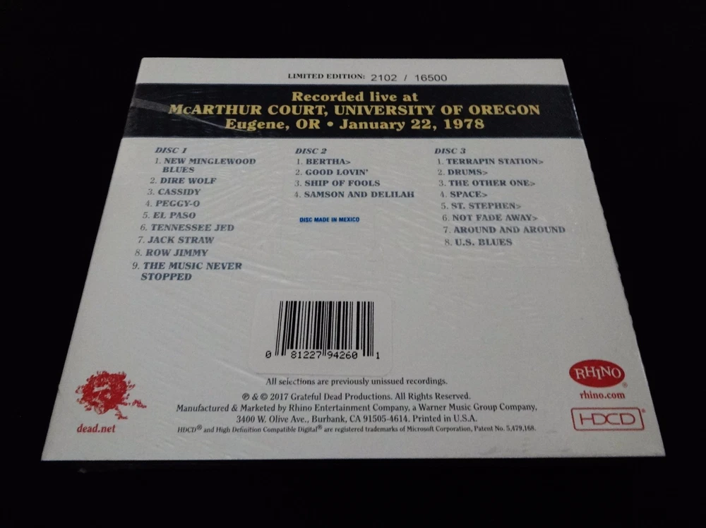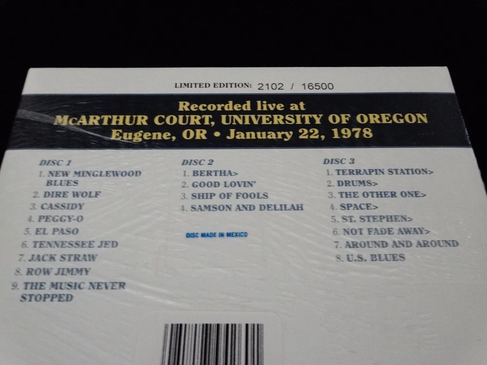 Grateful Dead : Dave's Picks 23 Volume Twenty Three : Mac Court ! – " The Pit !! " ( aka. ' McArthur Court ' ) – University of Oregon ( Duck U. !!! ) – Eugene, Oregon ( OR ) : January 22, 1978 ( 1/22/1978 ) : 3 CD : 2017 (1978/2017) Grateful Dead Productions, Inc. / Rhino ( GDP, Inc. / Rhino ) - R2 557455 : Limited Edition Individually Numbered ( of # 16500 ) : Brand New / Factory-Sealed ! : " The Dead At Duck U. !!! " " The Legendary " … Mac Court ! – Duck U. !! – 1/22/78 Show !!! - in " The Pit !!!! " … Featuring one of the Most-Creative ! – Mind-Melting !! – & Life-Altering !!! Grateful Dead ' Segue-Transitions ' of All-Time ! … Close Encounters Of The Third Kind !!! > St. Stephen !!!!! Indoors at the Very-Proud Home ! of the Mighty Oregon Fighting Ducks !! … on a Sunny ! ( just kidding -- Rainy !! ) Sunday Night … in Good Ol’ Eu~gene !!! Holy !!! – Grateful !!!!! - Dead !!!!!!! Oh Wow ........ Ahhhhh, well – I guess my life is now ... Officially " Complete " ? Sure wasn’t expecting This ! here in 2017 ?!? My spine is tingling just even ' thinking ' about this-one, and I haven’t even listened to it recently either – at least over the last few ... Hours !? Ha !! – as I’ll betcha my own ' personal-count tally ' on This-Show ! might-just break the meter ? Smmmmaaash … I haven’t been able to ' properly-describe ' This-Show for like 30-years now – and should I even try ?? Just wasted words ??? Dang, I just don’t know … Duck U. ! – Mac Court !! ( " The Pit !!! " ) – 1/22/78 !!!! – a completely-intimidating task, for all those who are already well " in the know " on This ! " Monster-Dead-Show !!! ". Alright … so, Is This " The Best " Dead Show Ever ? ... probably not. Does this Show offer " The Best " Garcia Axe work of All-Time ? ... probably not. Hmmm, a bit of a dicey-start ? But ….. is this " The Best " Dead Show from 1978 ? ... yes. Does this Show offer one of the Hottest !!! Live-Dead ' Segue-Transitions ' of All-Time ? ... yes. And … is there any better-place to see The Grateful Dead ' Live ' on Planet Earth – other than ... on " Planet Eugene " ??? ... No ! And … is this my own personal-favorite Dead Show of All-Time ? ... yep ( well, you know … this ' and ' 6/30/85 MPP !!! – Ha ! ) No … but with all-seriousness ( well, you know – as much as I’m actually capable of ) --- This-Show !!!? .. .. .. " It " single-handedly derailed my Entire Life ( well, you know … ' derailed ' meant in a ' Grate-Way ' – Ha ! – Grate ! like " The-Euge !! " ) And, I’m not kidding at all on this either - not-a-bit ... The 90 Minute Analog Cassette Tape ( Maxell XL-II S ! ) I acquired way-back in the '80's – of this 1/22/78 Mac Court ! Show ? … It Forever-Changed My Life ( ahhh, yes … " Dead Tour !!! " ). Or, to be a little bit more-specific here … " This-Show ! " was actually how I picked - " My College ! " ( Duck U. !! – " Quack " !!! ) – well, you know … that, and of course " Animal House " ! – Ha !! Naturally-though ... right ?! A " True-Story ", and I’m most-definitely sure you'll also remember The-Shirt quite well --- “ COLLEGE “. I mean … Whoa !?! I used to go to Duck Hoops Games ( even when they stunk ! ) – just-so I could ' Look ' at where Garcia did " It ". I used to even play hoops in there ( " The Pit ! " ) – just so I could go & stand right-where Jerry did It. Hell, I used to even go & ' clean-up ' Mac Court after Ducks Hoops Games with the Oregon Ducks Lax Team – just so I could sit in all of the different le