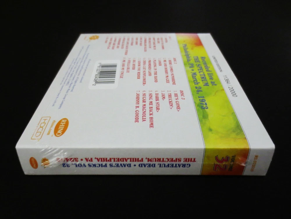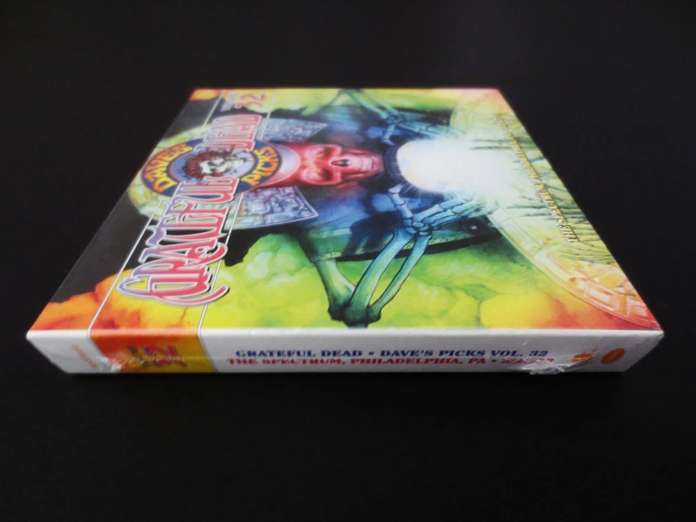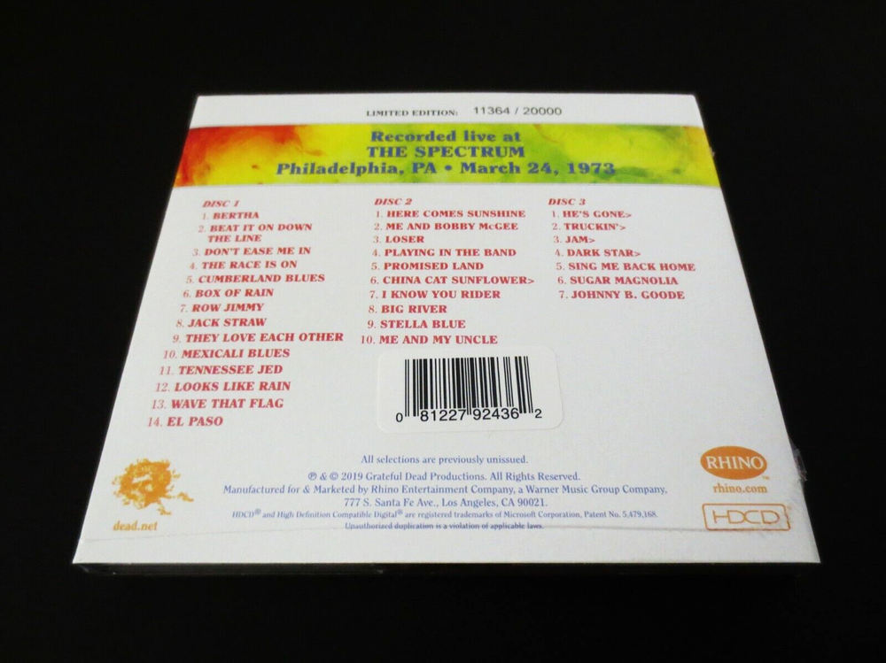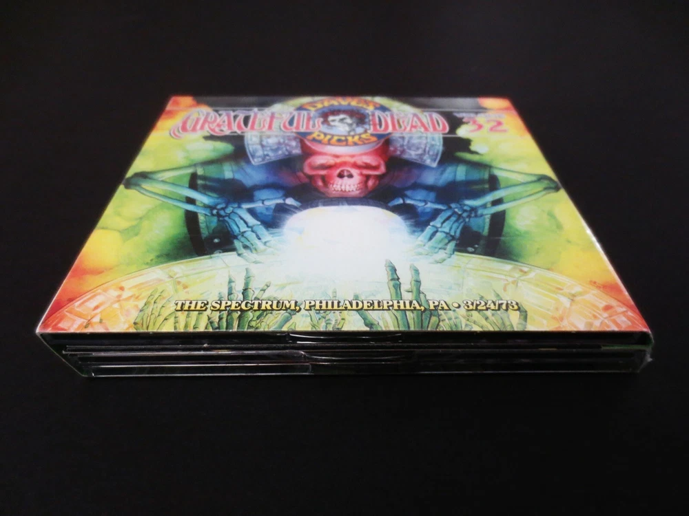 Grateful Dead : Dave's Picks 32 Volume Thirty Two : The Spectrum - Philadelphia, Pennsylvania ( PA ) - March 24, 1973 ( 3/24/73 : 3/24/1973 ) : 3 CD : 2019 (1973/2019) Grateful Dead Productions, Inc. / Rhino ( GDP / Rhino ) - R2 573510 : Limited Edition ' Individually-Numbered ' Set ( of # 20,000 ) : G.D. Spring Tour '73 !! - at The Spectrum !!! The Classic ! Spring Tour '73 ( 3/24/73 ! ) Dead Show !! - in Philly ! - at The Spectrum !!! ... Amazing ! ( " Breathtaking !! " ) '73 Prime-Era Grateful Dead ' Live ' in one of their many ' Key ' Prime-Eras ! - at a Good Ol' Hockey & Hoops Rink - which they more-than " Respected " ... and ' always ' treated with a little-extra ' Umph ! ' ... & " Brotherly-Love !! ". Whoa !?!?! ... 3/24/73 ! - on Spring Tour '73 ! - at " The-Spectrum ! " ..... " Dark~Star !!!!! ". Dead Fans ! ... '73 Live-Dead Fans !! ... & " Spectrum-Heads !!! " - as you-betcha ... We ' All ' know what That-Means !! Oh yeah, and too ( naturally ... ) ... 3/24/73 !!!!! ... " Finally !!! ". I mean ... " Thank You ! Vault !! " - as if you're just some name-less / face-less mechanical monster - that just ' happens ' to kinda kick-down a " MONSTER~SHOW !!! " every once-in-a-while ... Ha ! And, I just gotta say straight-up & first and foremost - if 1973 Live-Dead is one-of your own personal Favorite ! bag of tricks - or, it's perhaps your " Favorite " bag of Dead-Tricks ! ... then You ! are in for one heck of a ride ! - or better said ... a Spring Tour '73 " Mystical ! " Grateful Dead Journey ! with This-One !! And yeah ... as " Monster " is even a little bit of an ' understatement ' ... and what I really-mean is " MoNsTeR !!! ". Jerry, Bobby, Phil, BK, Keith & Donna Jean ... in the true " Finest-Form ! " of this Winter '71 to Fall '74 " Uni-Drummer " Dead Unit ! In other words ... the ' Mick-Free ' years - but, you already know all about that. And ... so yeah & getting right-back here to " 1973 " - the one-question just ' still-remains ' - and, I have to imagine that it always-really-will ... as it's indeed true-fact that the " Opinion(s) " are just always ( and always have-been ) all-across-the-board on ' What ? ' is Truly " The-Best ?? ". And ... may that be ... " Spring '73 ? " - " Summer '73 ? " - or " Winter '73 ? " - clearly one-of the Grateful Dead " Prime-Era " Years - that is indeed ' beyond-worthy ' of that degree of vitally-important ' dissection '. And I'll say it loud & clear that my vote has always traditionally been pulling on the " Winter '73 " lever ( for almost the last 30-years, myself ) - but, my steadfast commitment to headphones ( like ... almost a " headphones-only " type of commitment ) over the last near-decade ( not to mention the " so-many-killer-'73-releases " that have newly surfaced ! ) ... has really-truly-began to ' tilt ' my eyes, ears, and mind - in the direction of " Spring Tour '73 ! ". And I mean hey - to just put it bluntly ... it's ' earlier ' - and I think at least in the vital-case of analyzing " Jerry " - it matters all the more. I mean it's kind of like the similar impossible ' pick ' of ... " Strat ? " or " Wolf ? " ... as that's almost something-like " Who's a better British Rock Band ? " - " The Beatles ? or The Stones ? " ( Ha ! ). But, it's just like this ... '71 > '73 Garcia-Live is arguably the " Mastery-Point " of getting the Most ! out of ' Single-Coil ' Pick-Ups ... and also even laying-down the earlier Mid/Late-'60's Gibson(s) ! - to do-it !!? ... to truly ' Achieve ' it ! One of the " Most " critically-altering ' Decisions ' in really ' All ' of Rock & Roll which Jerry made here in this Live-Dead Period & Era ! And, at least to my ears ... I'm sure damn-glad he did it ! Just think of the differences in sheer Gain ! & Tone !! that this period would have ' faced ' ( Forever ! ) if Garcia played it with say ... an SG ! - or a Les Paul ! But instead ... he chose to rifle This-Era ( This " Magical ! " Live-Dead-Era ! ) with the choice of " Clean-Tone !! ". And, then the more I listen ( and believe-me - I listen a-lot ) ... I'm almost starting to get hung-up on " Spring Tour '73 " being really the " Pinnacle-Flagship " of this Single-Coil Pick-Ups " Clean-Tone " Era ! It's So-Incredibly ' Brisk ' that it almost " Snaps ! " - and even ' with ' what one might call " unity-gain-buffing ! ". And with the sheer " Timing " of Bobby playing a Gibby Double-Cut ( 336 ? ), BK on the Stickkks ! - and Phil-a-Thumpin' !?! ... there are Moments that both border & also truly-achieve ' Crystal-Clean ' Live ! Rock & Roll " Perfection !! ". And, I have to say ( & ' admit ' ) too that I'm ' Extra ' Head-Over-Heals with this 3/24/73 Spectrum release - because I only ' ever ' owned a roughly 90-minute ( or ' less ' ) portion of This-Show ! I got it in the '80's from Metal Tape ( Cassette ) and Recorded it ( " Carefully ! " ) to Chrome Tape ( Cassette ) - and could never track down the other ' portion ' of this Show ( like ' Most ' of this Show ! ) - simply because I just could-not find the proper & respectable Sound-Quality in which it rightfully deserved to be archived. And so - just for fun ... " This " is all that I-Ever-Had ! ( as I'm kind of even embarrassed to say - but ... I-Did-Try-Hard ! ) - and so, with no further adieu ... ( kind of funny ( really-funny ) to think about this ' now ' ( like 30-Years ! later ) - Ha !! ) >>> Big River - Stella Blue - Me & My Uncle - He's Gone > Truckin' > Jam ( Cut / " Flip ! " ... Ouch ! ) ... Jam > Dark Star > Sing Me Back Home > Sugar Mag - Encore : Johnny B. Goode ! And so Yes ! - you get the point, and can now also feel ( & hear ) what I am Feelin' ! & Hearin ' !! ... the ' Other ' Missing ! " 21-Tracks !!! " All-Before ... the ' Big River ! '. And, I mean ... I just gotta-say ... This ! Feels-Like-Magic !! And, at least in my ' Rack ' it's Better-Than the Nassau '73 & Springfield '73 Shows that both ' border ' this " Tape ". And, from a say " Dave's Picks " perspective ? ... it's not fair to call this UCLA '7