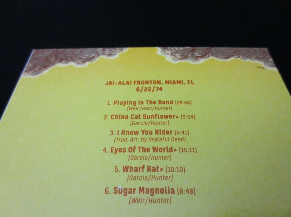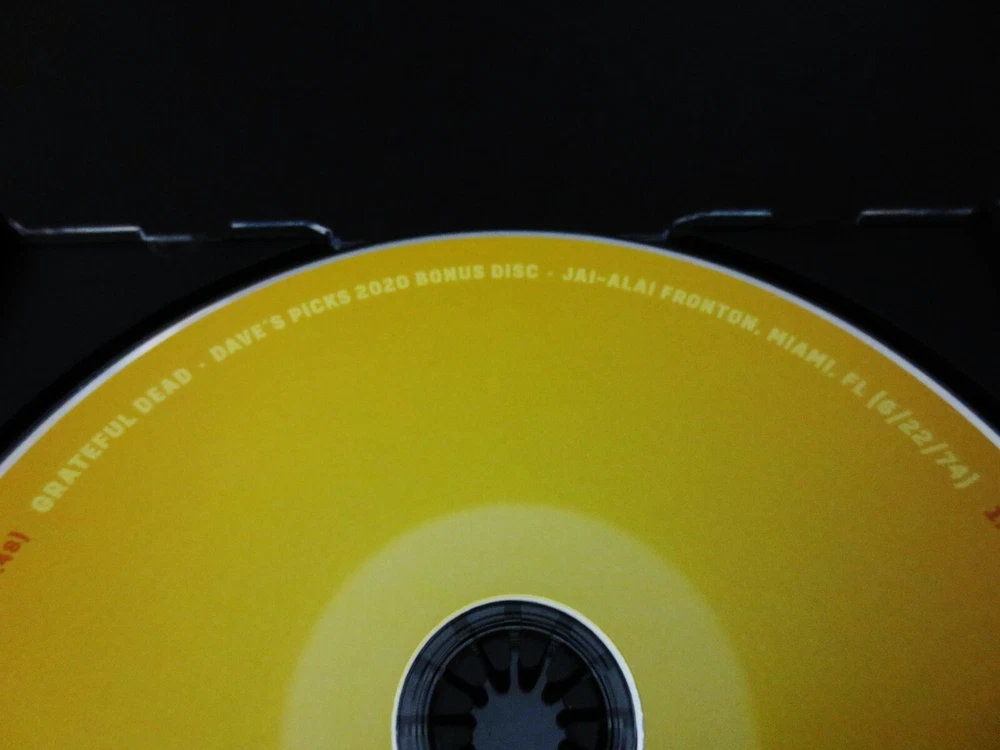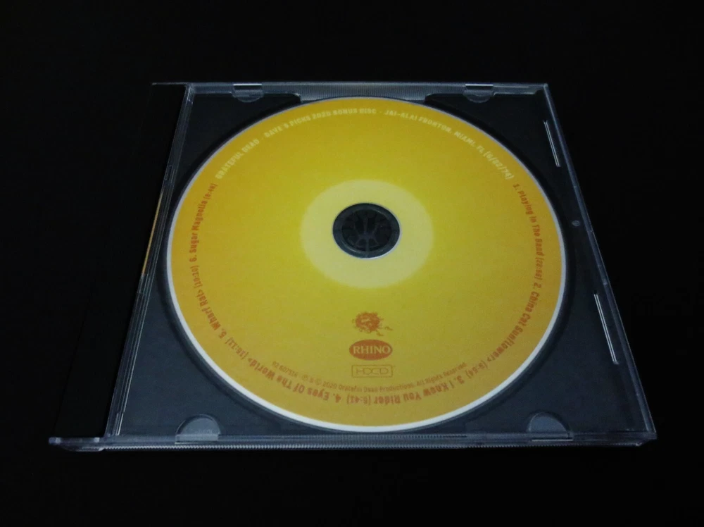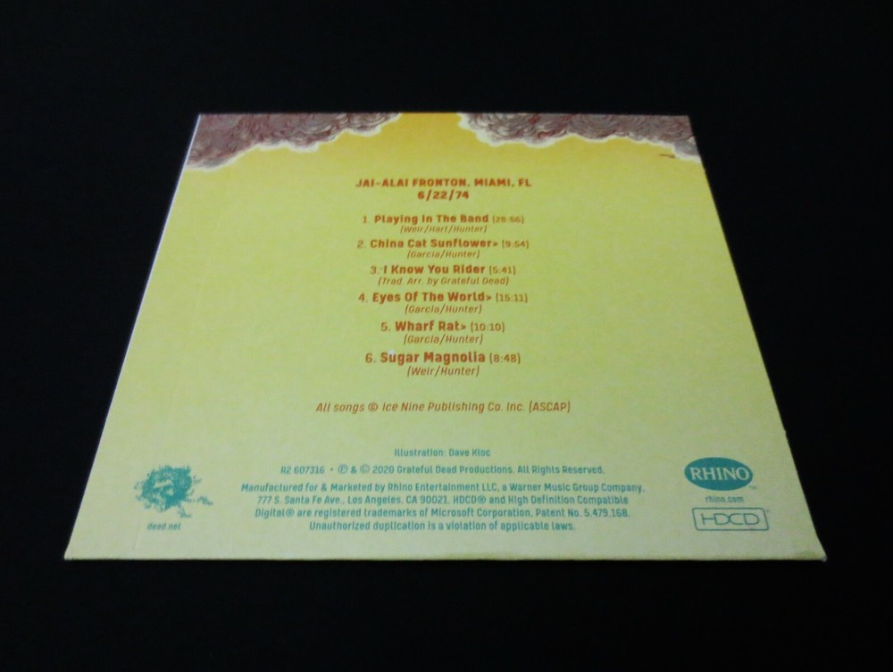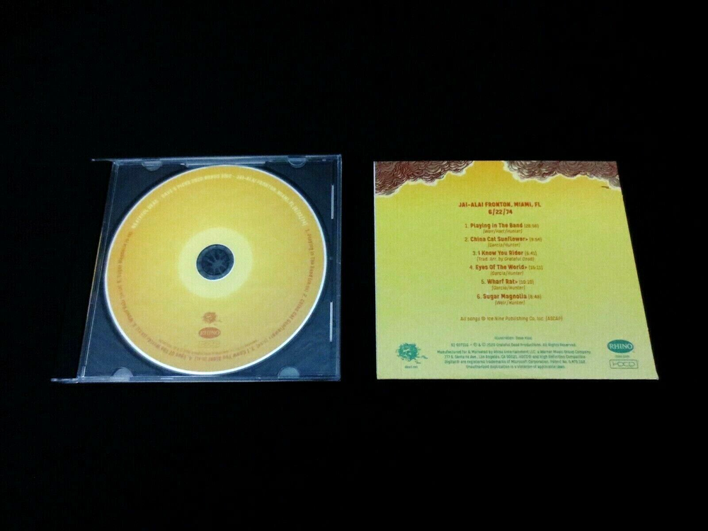 Grateful Dead : Dave's Picks 2020 Bonus Disc ( from Dave's Picks 34 Volume Thirty Four - 2020 release ) : Jai-Alai Fronton - Miami, Florida ( FL ) : June 22, 1974 ( 6/22/74 : 6/22/1974 ) : " Bonus Disc CD " : 1-CD : 2020 (1974/2020) Grateful Dead Productions, Inc. / Rhino ( GDP / Rhino ) : The Rare ! Annual Subscription Only ! " Bonus Disc CD " - for 2020 ! The Mid-1970's Era Grateful Dead " Return-To-Florida ! " - following the '73 Fall Tour ' Curtis Hixon Convention Center ' Shows !! ( best-knows as - ' Dick's Picks Volume 1 ' ! ) - and ... " Return ! " They-Did !! ... " Return to - The-Hot-Zone !! " ... " Wall Of Sound !!! " - in ' The Sunshine~State ! ' ... Eyes Of The World !! > Wharf Rat ! - Sugar Mag ! - China > Rider !!! - and ... Playing In The Band !!!! " Miami-Nice ! " - In-deed !!! And, with very fair consideration of both the The Era & ' The-Times ! ' ... " Miami-Vice !! " sure works well too - though still a full-10-years before ' Crockett & Tubbs ' fully hit the scene - Ha ! " The ! " Miami ( Efff ! - Elll ! - Aaaa ! ) Florida-Stop !! - 6/22/74 ( " Night #1 " ) Tracks ! - on Grateful Dead '74 Summer Tour !!! Known-best ( I'd safely-say ! ) as ' The ! ' Summer Tour of ... " The Wall-Of-Sound !!! ". And, oh my gosh ... does This-One ! bring back some ' Fond ' Grateful Dead Memories for me ! I mean - let's put it this way ... a Decade-after - and almost close to 15-years after - I remember making a close to 2-hour " Spur of the Moment ! " Road Trip ! to just Go & Hear " Jai-Alai Fronton ! " Miami '74 !! And, this drive was ' specifically ' to ... get into the Car - drive 2-hours into the City - just to ' Listen-To ! ' this freshly-acquired Summer Tour '74 Miami-Dead ! - " On-Tape !! ". Sounds Crazy ? - Right ? Or ... maybe-not ?! Not-at-All !!! As the simple-fact then was - both me & a Dead Tour Buddy of mine could ' no-longer-wait ' to hear the Analog Cassette Soundboard Tapes ! - of '74 - Jai Alai - Miami !!! And, that was ( obviously ) like a " Youthful-Love ! " thing to do - for any young Deadhead ! But, what we really ended up finding-out on that Trip ! - ended up being far-more-important in the long-run. As basically ... our other Tour Buddy ! ( R.I.P. ) - had just delivered & ' introduced ' this '74 - Jai-Alai Fronton - Miami ! " Wall Of Sound !! " Dead-Stand !!! into our " Lives & Minds " ... for ' Time-to-Come !! ' & essentially ... " Forever !!! " >>> with the Playin' !! - China > Rider !! - Eyes ! > Wharf Rat ! > Sugar Mag ! - being the Huge ! " Miami-Goods " on this 6/22/74 " Jai Alai Fronton ! " - Bonus Disc CD !! Featuring ( naturally ... ) - Garcia's 2nd to Last-Tour with " Wolf !! " - the " Phil-Zone ! " going ' Quadraphonic !! ' - Weir headed towards some of the ' Last-Days ' of Gibson !! Guitars - B.K. just " Delivering !! " as the sole ' Uni-Drummer ! ' - Donna ! pretty much in her ' Prime ! ' - and Keith ! carrying the Keys-load with consistent Style & Fashion ! I mean People ! ... & " Deadheads !! " ... This ! is Miami !! on the Summer '74 " Wall Of Sound ! " Tour !! On the same '74 ' Caliber ' ( and at-times even arguably maybe-even-better ?!?! ) then many of the other " Historic '74 Shows " - say ... the likes of Louisville ( 6/18 ) ! - Des Moines ( 6/16 ) ! - Boston ( 6/28 ) ! - Providence ( 6/26 ) ! - U of W " Fuskie-U. " ( 5/21 ) - Portland ( 5/19 ) ! - Winterland ( 2/24 ) ! - Roanoke ( 7/27 ) ! - Cap Centre ( 7/29 ) ! - Hartford ( 7/31 ) ! - London ( Sept. '74 ) ! - Winterland ( Oct. '74 - " The Last One(s) " ) !! - etc., etc.. Point here being ... " The ' Big ! ' Stuff ". And ... the simple-fact is that this brand of " 1974 " Live-Dead Improvisational-Playing ! can go head-to-head ( with-ease ! ) - against many, and really ' any ' of the 1974 Touring-Year " Moments-Of-Magic !!! ". As from-here ? - it's pretty much like - you know - just to each, their own - or - " pick your poison ! " ... because a 32-year-young ! - Jerry Garcia !! is brewing-up this fresh & very-special batch of Live-Dead-Magic ! - stirring it up, and yeah ... even also even handing out the cups !! Dang, I mean ... I'll have 2-Please !! - Wow ... And, as I have to say here too - I always found it very interesting that when you get " deep-into " those sometimes sticky, yet so-awesome Dead-Circles ( Touring, Tape Trading & such ) - that 1974 can take a bit of a bad-rap ( at times ) for the 1st-Half of the 1970's Era - much like the similar ( & sometimes exact-same-way ) that 1978 can take a bit ( more ) of a bad-rap ( & even more-often ) for the 2nd-Half of the 1970's Era. Where really ? - in true-truth ?? ... it's just so all really-about ' Zeroing-In ! ' ( & " Zoning-In !! " ) on the Nights and/or Moments when it is " Truly-On ". Because 1974 ( and even 1978 - in comparison ) are Both !! in-true-reality just " Drenched !!! " in those-type of " Magic ! " Dead-Moments - the ones we all Love ! & might even also Live-For ! - where it's ' The-Music ! ' that-plays " The Band !! " - and it's 100% Full-On & " All-Systems ! " Go !! ". And, as far as the ' Fun-Facts ' go - here indeed is " AnOther-One ! " for you here - on the ' Miami ' & " Florida " Region thing here - where ... Watchful ! Deadhead-Eyes always keep ' Eyes-On ! ' since the Band had a Nice ! ( what - say 25-Year ?! ) " History " of just Bringing-The-Heat !! in the Good Ol' " Sunshine-State ! ". As now that " Jai Alai - Miami - '74 ! " has been ' Let-Loose ! ' - from a ( ' Pro-Released ' ) " Miami and/or Florida " perspective ... since 12/19/73 Curtis Hixon ! ( Tampa ) kind of started it all ( Right !?! - DP #1 !! ) ... 5/22/77 Sportatorium ( Pembroke~Pines !! - WoW !!?!! - DP #3 !!! ) followed ... then 11/28/80 ( Lakeland !! - 30-Trips ! ) ... then 10/26/89 ( Miami Arena !!! - 30-Trips !! - Whoa !!? ) ... for all of you interested in the essential " Florida-Dead ! " Stats ! - per se. With I guess my question here now being - something like ... " Time-Now-For " >>> '78 Jai-Alai ! & Curtis Hixon ! ( 12/12 & 12/13 ) - '80 " All