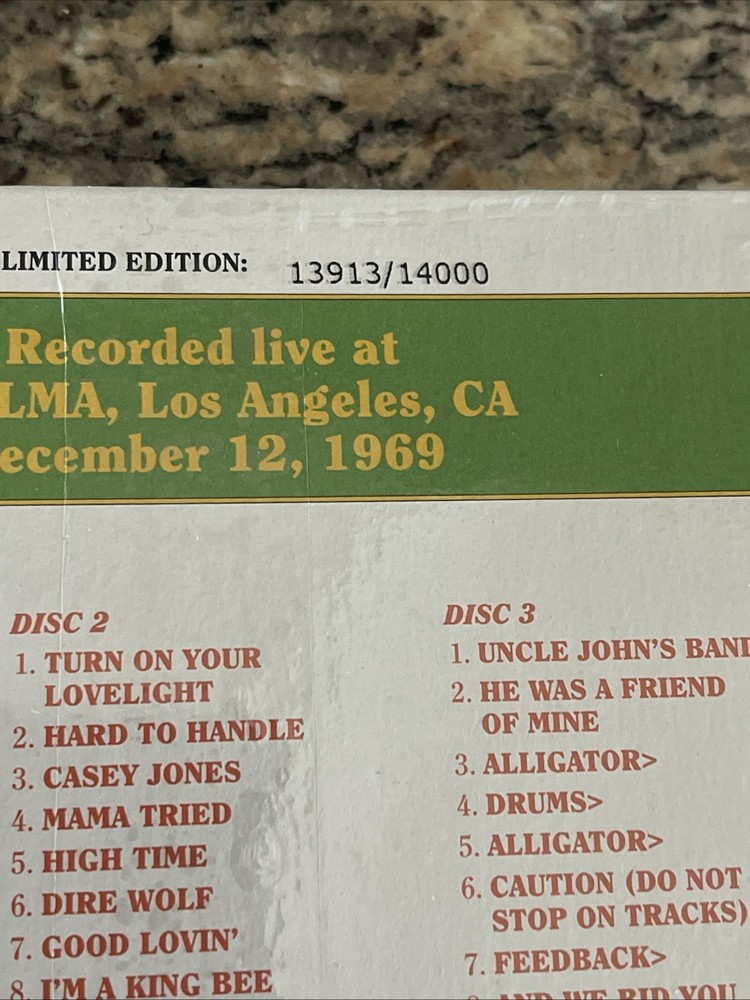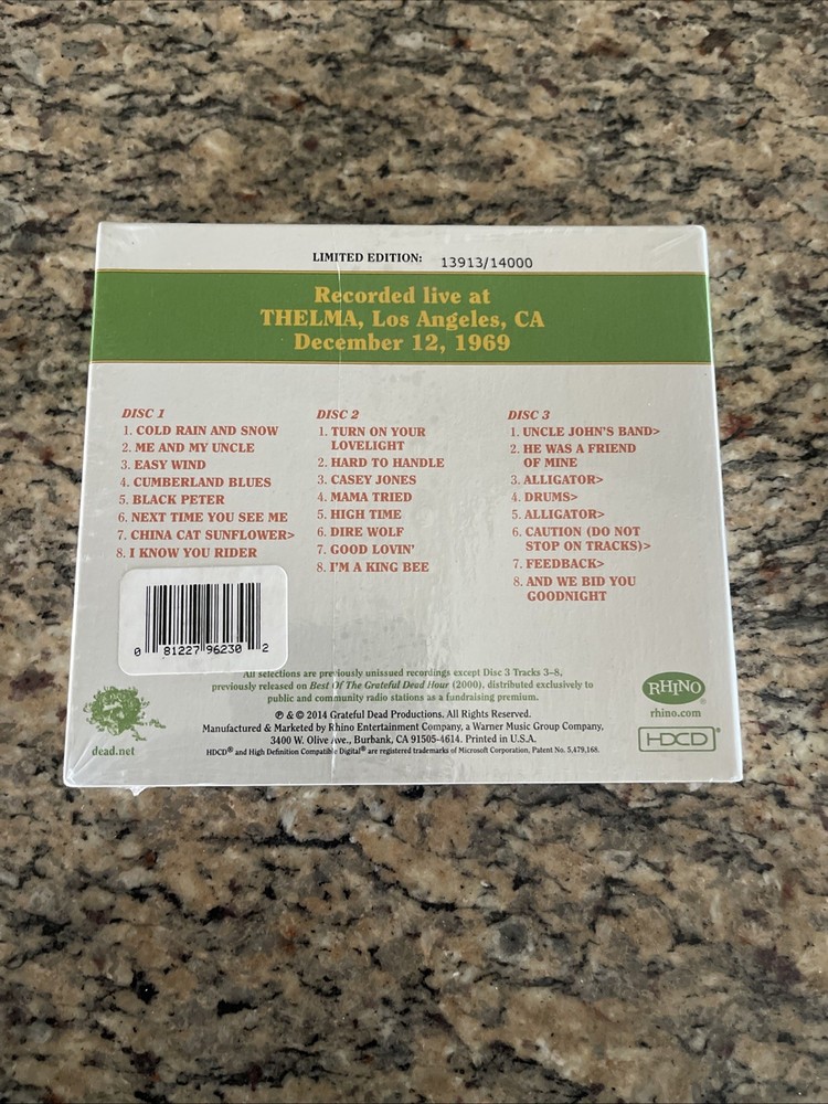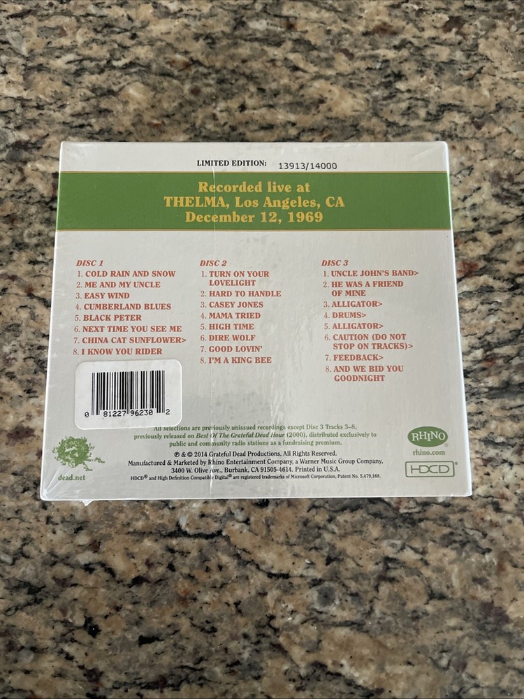 Grateful Dead Dave's Picks 10 Volume Ten Thelma Los Angeles 12/12/69 3 CD is a limited edition live recording album by The Grateful Dead, featuring performances from December 12, 1969. The 3 CD set includes music from legendary artists like Jerry Garcia, Grateful Dead, and other members of the band. This collector's edition release by Grateful Dead Productions and Rhino is a must-have for fans of rock, folk, blues, funk, psychedelic, progressive, and jazz music from the 1960s era. With mint condition packaging and a unique catalog number, this album is a valuable addition to any music collection. , New sealed quick shipping always check out all our other Dave’s picks