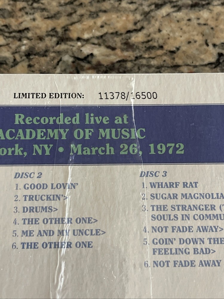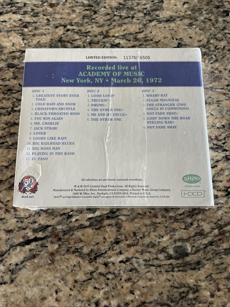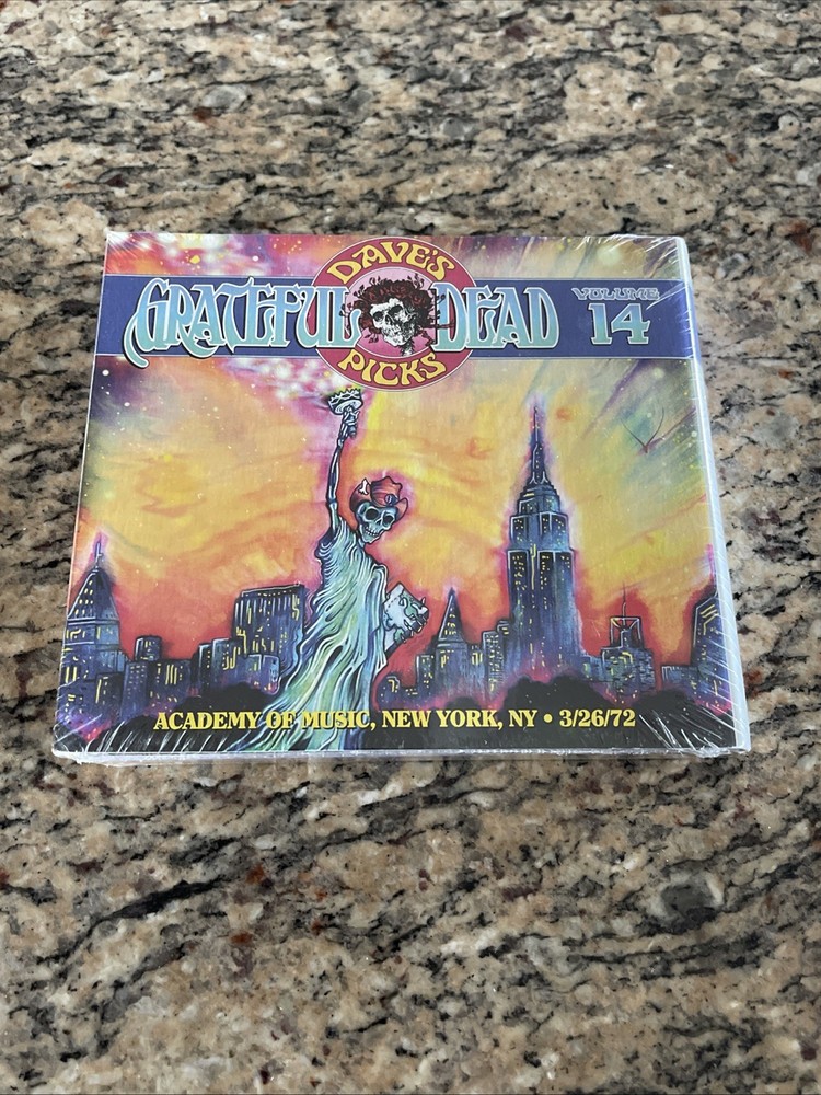 The product is a sealed, limited edition CD set titled "Dave's Picks Volume 14" by the Grateful Dead, recorded at the Academy of Music in New York on March 26, 1972. Released by Rhino in 2015, this 3-disc set features live recordings in English, spanning various rock genres including indie, experimental, blues, psychedelic, and more. The multicolored CDs are numbered and include features like HDCD technology, making it a highly sought-after collectible for fans of the band and collectors of rock music.