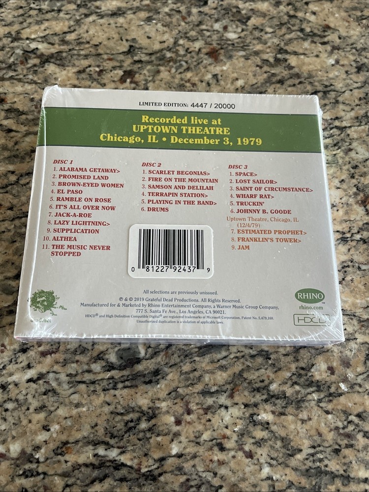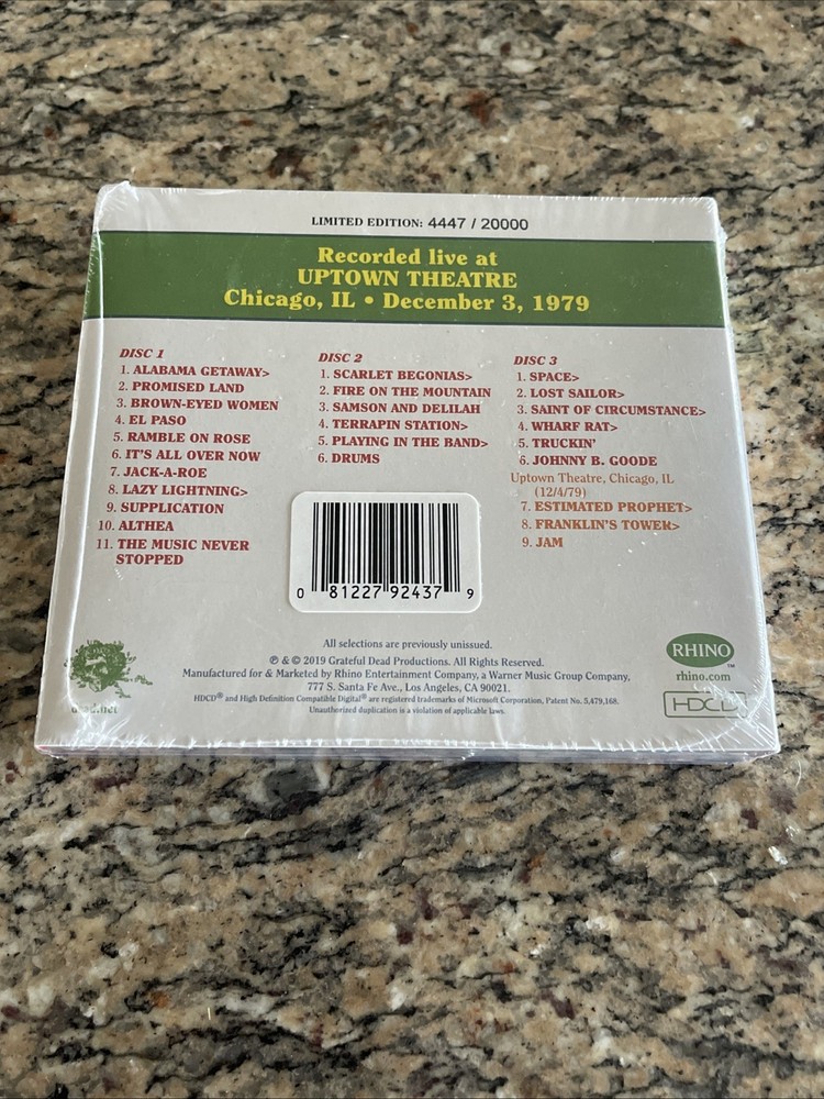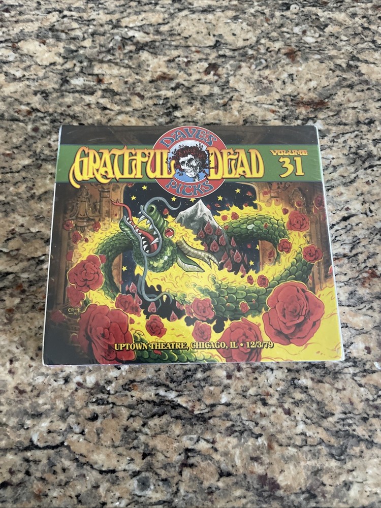 The Grateful Dead Dave's Picks 31 Volume Thirty One is a 3 CD album featuring a live recording by the Grateful Dead from December 3, 1979 at the Uptown Theatre in Chicago, IL. This collector's edition release by Rhino Records is mint condition and comes in a cardboard case with plastic disc trays. The album showcases a blend of experimental rock, electric folk, jazz rock, and psychedelic rock, with instrumental highlights on guitar, keyboard, percussion, bass guitar, electric guitar, and drums. A must-have for fans of Grateful Dead concert recordings from the 1970s. New sealed check out all our other Dave’s picks quick shipping always