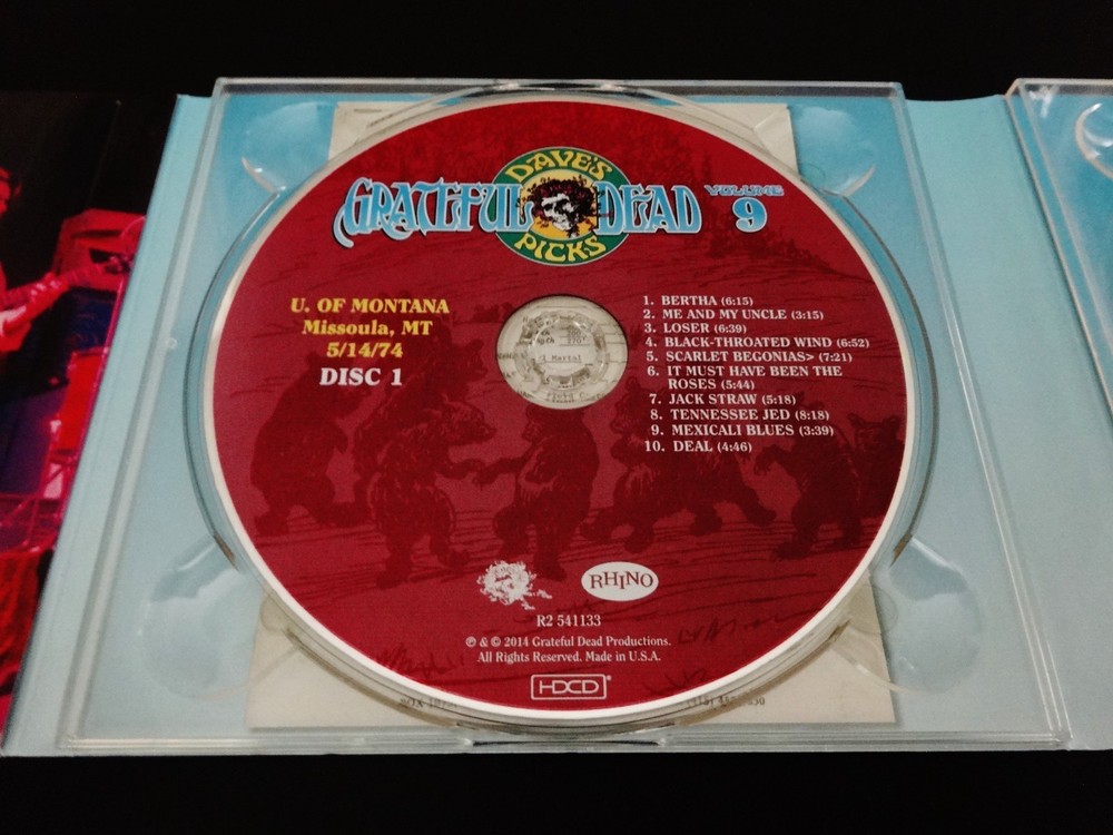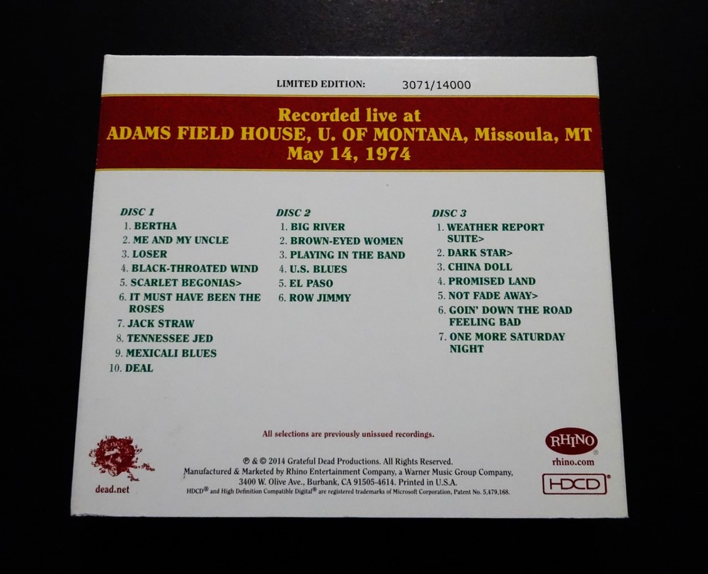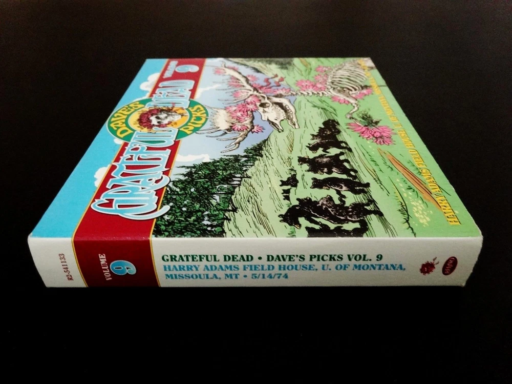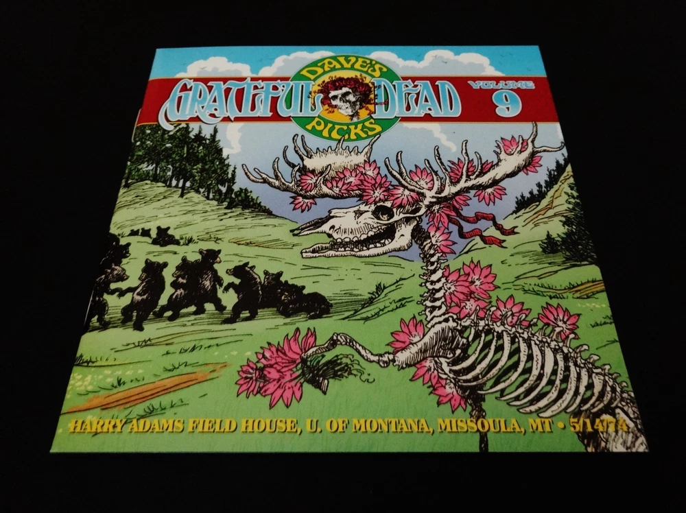 Grateful Dead : Dave's Picks 9 Volume Nine : Harry Adams Field House - University of Montana - Missoula, Montana ( MT ) : May 14, 1974 ( 5/14/74 ) : 3 CD Set : Limited Edition ' Individually-Numbered ' Set ( of # 14,000 ) : 2014 (1974/2014) Grateful Dead Productions, Inc. / Rhino ( GDP / Rhino ) - R2 541133 : Proud Home of the Montana Grizzlies ! : Skeleton Moose ! - Bears !! - & Bitteroots !!! Cover Art !!!! The Grateful Dead Dave's Picks Series returns Proudly ! to 1974 !! ... recorded ' Live ' on 5/14/74 in Missoula, Montana !!! - to the Proud Home of the Montana Grizzlies !!!!! The ' Only ! ' Grateful Dead Show Ever ! - in the Grate ! State of Montana !!! Wow !!!!! Fellow G.D. Fans !!! Yep, you betcha ... it's time - yet again to clear some space in that ' Rack ' ! The CD Rack, that is ... and that's not coming from me - it's coming from the " Skeleton Moose " !!! right on the Front-Cover ! of this '74 Grateful Dead release audio Beauty ! And, as you can tell ... this Moose definitely means business - but doesn't necessarily want to use his Rack to do any damage to anyone - or anything ... because " It Must Have Been The ' Bitterroots ' !!! ". Very-nice !! This Skeleton-Moose is proudly sporting the Montana State Flower ! - and I should say Flower(s) !! ... because there are lots ! Getting ready to do some Dancin' with the Dancin' Montana Grizzly Bears ! - or so it seems ... just before they all go & do some serious Dancin' inside the University of Montana Grizzlies Field House !!! - time to Boogie Down to some Mid-'74 G.D. in the MT !!!!! Wow ... is this Cover what the Scene looked like on 5/14/74 in Missoula ?!? Well then, no wonder this Dead Show was so darn good. Garcia & Co. getting after it on this hot-night - over 50-Years Ago !!! And all of you G.D. taping junkies out there ( like me ) ... now - you Know ! what I'm talkin' about when I refer to the Band chompin' Hard ! at the bit at this Missoula Show ... KaBoooom ! - I mean bring me back down from the Moon - why don'tcha ... Weather Report Suite !!! > Dark Star !!!!! > China Doll !!!!!!! Wow ... gettin' at it for certain - and in the Spaciest ! of Space-Fashions. This landing & transition segue into China Doll is just as Sweet as a Bitterroot !!! Indeed ... But wait, are those even Sweet ? Not really ' sounding ' that way ( ha ! ) ... but this Live-Dead Most-Definitely Is ! There is a little " time-keeping " fun right off the bat - before the Bertha opener - delivered by B.K. !!! And you can tell right away that Billy knows he's Out-West !!! It's quite clear that he's gonna put on his Cowboy Hat and push the Boys hard ! But, it's one of those nights when they don't need it - because they've All ! got the same plan up their collective-sleeves ... I mean everybody elbows - jives & musically-instigates - until this thing is flat-out Cookin' !!! It's like a game of Deadhead-Dominoes tonight ! ... and you bet the Skeleton-Moose is diggin' that ! I mean either Keith is a touch loud in the mix / remaster ? - or he is just completely Drivin' !! those Keys home ... big time. Phil is flat-out Pounding ! - with the Scarlet !! - being the proof right inside the Bitterroot ! And !!! Bobby Weir has got both volume & attack at his! mercy too ... as he almost has a Seek & Go Hide ( or visa-versa ! ) thing going - where he is almost band-leading by bopping everyone when they need a good musical boppin' - nudge - or push ! Pre-hiatus Purists - if you don't have this one - you need it ! The interplay is clean - near-flawless - inviting - and seems to always leave a clear canvas - for the next guy who is feelin' it to Paint ! And, just like I Always ! like to say ... " When Jerry's Wearin' Jeans ... It's Fine By Me " !!! Yep, I'm darn proud of coining that one ... as I did it like over 30 years ago - while listening to Freedom Hall '74 - as then I had the Vision ! Ha !! Garcia is scary-good - in not only his chops alone, but in the obvious fashion that you never know where he's going - but, when he does it ... you'll already be there in the Music-Mind ! But, as usual - this guy is always two-steps - or many more ahead. This is such a creative period for Garcia ... I mean it's not the most vicious - mean & nastiest stuff ( i.e. somewhere between '81 & '90 ( the stuff that I Live-for ! ) ) on the frets - tones - of the Boss !! - but, the creative element of ' what's comin' next ' is just pure-excitement ... and, especially in the loose & " Spacey-Zones ! " And, on that topic of " Zones " -- well, this release Must ! be acquired by all Phil Lovers ! - and ... not just because he's on the mark ! musically & pounding-away, but ... because there is a ridiculously !!! Hot ! close-up photo of him in the Liner Notes ... Whoa ! I've seen some Phil-Photos in my days ... but this one is Killer ! Yeah ! ... Phil it up in 1974 ! - that's what I say. And, one final note - there is a little paragraph segment inside these Liner Notes, from the local May '74 Missoula Newspaper - that reviewed this Show ... and, at least to me - it's a Complete-Classic ! >>> First, it follows a little bit of rap - about the Wall Of Sound ! ... and then this >>> " But, the musicians were the important ingredient, and Garcia is one of the best musicians there is. He nonchalantly stood onstage, bracing himself on one leg as the other rose and fell with the tempo of the music. Garcia was at his peak in the Dead's half-hour ' Playing In The Band ' jam, when he took a foray into rock, jazz and finally an electric neverness that left the crowd spellbound. " Wow ....... Well fellow Fans, that was said by Steve Shirley back in '74 - after coming down from This ! Show - well, then again ... maybe he never did come down from it ? After seeing that !?! Anyone whoever saw Garcia in that ' Zone ' live - in one form or another - one venue / city or another - or at any place or Space ! in time ... I mean do you really ever forget it ? So, here we have it ... just Pristine !!! 5/14/74 in Missoula