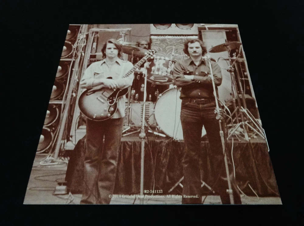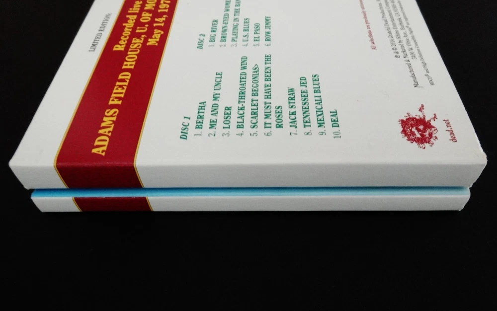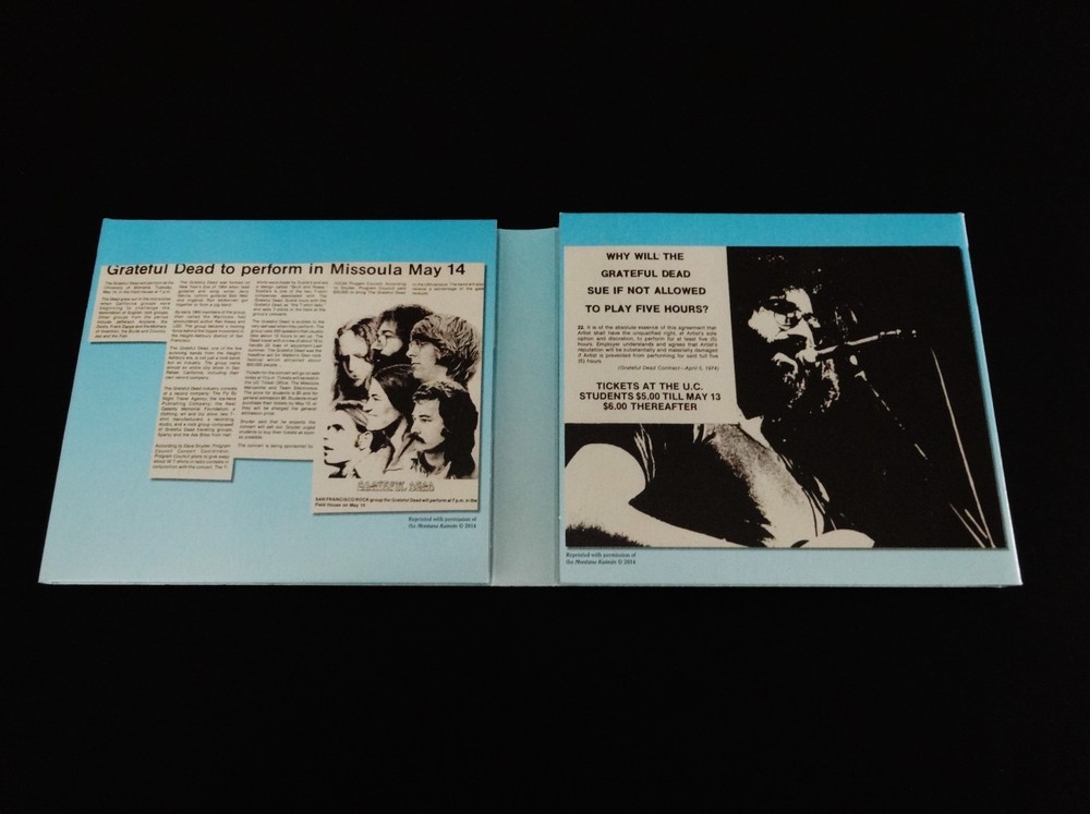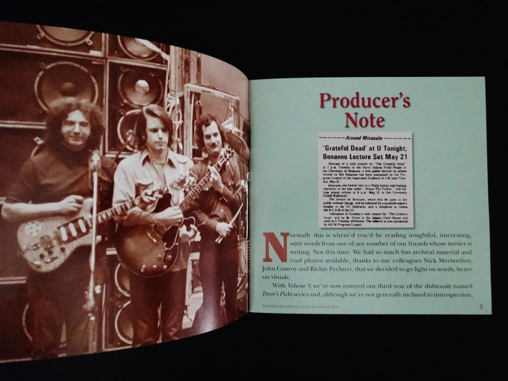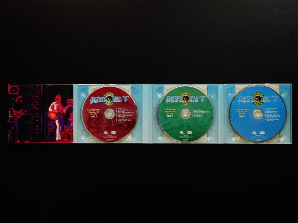 Grateful Dead : Dave's Picks 9 Volume Nine : Harry Adams Field House - University of Montana - Missoula, Montana ( MT ) : May 14, 1974 ( 5/14/74 ) : 3 CD Set : Limited Edition ' Individually-Numbered ' Set ( of # 14,000 ) : 2014 (1974/2014) Grateful Dead Productions, Inc. / Rhino ( GDP / Rhino ) - R2 541133 : Proud Home of the Montana Grizzlies ! : Skeleton Moose ! - Bears !! - & Bitteroots !!! Cover Art !!!! The Grateful Dead Dave's Picks Series returns Proudly ! to 1974 !! ... recorded ' Live ' on 5/14/74 in Missoula, Montana !!! - to the Proud Home of the Montana Grizzlies !!!!! The ' Only ! ' Grateful Dead Show Ever ! - in the Grate ! State of Montana !!! Wow !!!!! Fellow G.D. Fans !!! Yep, you betcha ... it's time - yet again to clear some space in that ' Rack ' ! The CD Rack, that is ... and that's not coming from me - it's coming from the " Skeleton Moose " !!! right on the Front-Cover ! of this '74 Grateful Dead release audio Beauty ! And, as you can tell ... this Moose definitely means business - but doesn't necessarily want to use his Rack to do any damage to anyone - or anything ... because " It Must Have Been The ' Bitterroots ' !!! ". Very-nice !! This Skeleton-Moose is proudly sporting the Montana State Flower ! - and I should say Flower(s) !! ... because there are lots ! Getting ready to do some Dancin' with the Dancin' Montana Grizzly Bears ! - or so it seems ... just before they all go & do some serious Dancin' inside the University of Montana Grizzlies Field House !!! - time to Boogie Down to some Mid-'74 G.D. in the MT !!!!! Wow ... is this Cover what the Scene looked like on 5/14/74 in Missoula ?!? Well then, no wonder this Dead Show was so darn good. Garcia & Co. getting after it on this hot-night - over 50-Years Ago !!! And all of you G.D. taping junkies out there ( like me ) ... now - you Know ! what I'm talkin' about when I refer to the Band chompin' Hard ! at the bit at this Missoula Show ... KaBoooom ! - I mean bring me back down from the Moon - why don'tcha ... Weather Report Suite !!! > Dark Star !!!!! > China Doll !!!!!!! Wow ... gettin' at it for certain - and in the Spaciest ! of Space-Fashions. This landing & transition segue into China Doll is just as Sweet as a Bitterroot !!! Indeed ... But wait, are those even Sweet ? Not really ' sounding ' that way ( ha ! ) ... but this Live-Dead Most-Definitely Is ! There is a little " time-keeping " fun right off the bat - before the Bertha opener - delivered by B.K. !!! And you can tell right away that Billy knows he's Out-West !!! It's quite clear that he's gonna put on his Cowboy Hat and push the Boys hard ! But, it's one of those nights when they don't need it - because they've All ! got the same plan up their collective-sleeves ... I mean everybody elbows - jives & musically-instigates - until this thing is flat-out Cookin' !!! It's like a game of Deadhead-Dominoes tonight ! ... and you bet the Skeleton-Moose is diggin' that ! I mean either Keith is a touch loud in the mix / remaster ? - or he is just completely Drivin' !! those Keys home ... big time. Phil is flat-out Pounding ! - with the Scarlet !! - being the proof right inside the Bitterroot ! And !!! Bobby Weir has got both volume & attack at his! mercy too ... as he almost has a Seek & Go Hide ( or visa-versa ! ) thing going - where he is almost band-leading by bopping everyone when they need a good musical boppin' - nudge - or push ! Pre-hiatus Purists - if you don't have this one - you need it ! The interplay is clean - near-flawless - inviting - and seems to always leave a clear canvas - for the next guy who is feelin' it to Paint ! And, just like I Always ! like to say ... " When Jerry's Wearin' Jeans ... It's Fine By Me " !!! Yep, I'm darn proud of coining that one ... as I did it like over 30 years ago - while listening to Freedom Hall '74 - as then I had the Vision ! Ha !! Garcia is scary-good - in not only his chops alone, but in the obvious fashion that you never know where he's going - but, when he does it ... you'll already be there in the Music-Mind ! But, as usual - this guy is always two-steps - or many more ahead. This is such a creative period for Garcia ... I mean it's not the most vicious - mean & nastiest stuff ( i.e. somewhere between '81 & '90 ( the stuff that I Live-for ! ) ) on the frets - tones - of the Boss !! - but, the creative element of ' what's comin' next ' is just pure-excitement ... and, especially in the loose & " Spacey-Zones ! " And, on that topic of " Zones " -- well, this release Must ! be acquired by all Phil Lovers ! - and ... not just because he's on the mark ! musically & pounding-away, but ... because there is a ridiculously !!! Hot ! close-up photo of him in the Liner Notes ... Whoa ! I've seen some Phil-Photos in my days ... but this one is Killer ! Yeah ! ... Phil it up in 1974 ! - that's what I say. And, one final note - there is a little paragraph segment inside these Liner Notes, from the local May '74 Missoula Newspaper - that reviewed this Show ... and, at least to me - it's a Complete-Classic ! >>> First, it follows a little bit of rap - about the Wall Of Sound ! ... and then this >>> " But, the musicians were the important ingredient, and Garcia is one of the best musicians there is. He nonchalantly stood onstage, bracing himself on one leg as the other rose and fell with the tempo of the music. Garcia was at his peak in the Dead's half-hour ' Playing In The Band ' jam, when he took a foray into rock, jazz and finally an electric neverness that left the crowd spellbound. " Wow ....... Well fellow Fans, that was said by Steve Shirley back in '74 - after coming down from This ! Show - well, then again ... maybe he never did come down from it ? After seeing that !?! Anyone whoever saw Garcia in that ' Zone ' live - in one form or another - one venue / city or another - or at any place or Space ! in time ... I mean do you really ever forget it ? So, here we have it ... just Pristine !!! 5/14/74 in Missoula