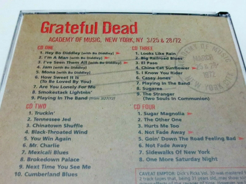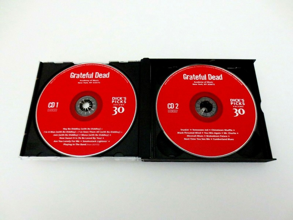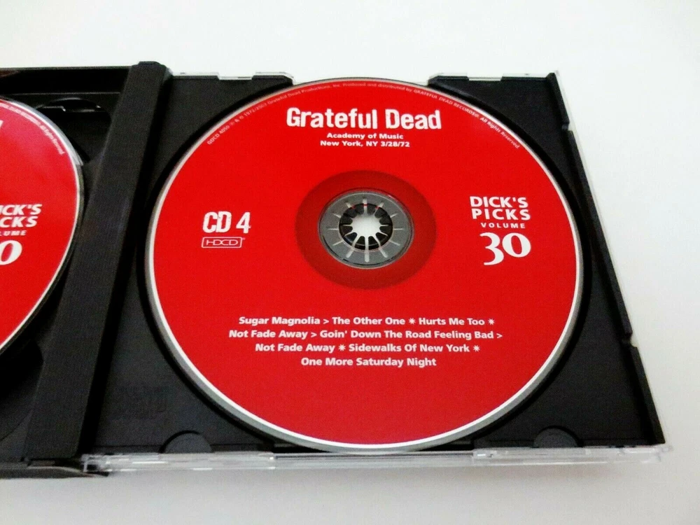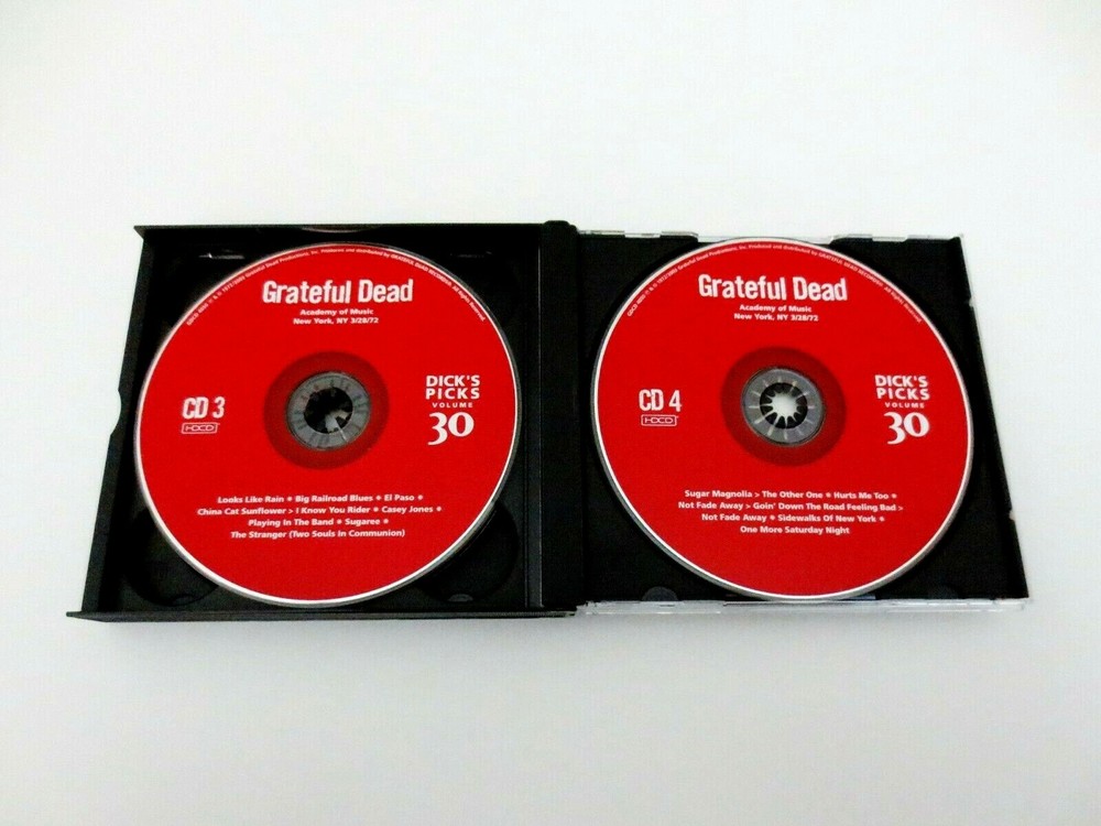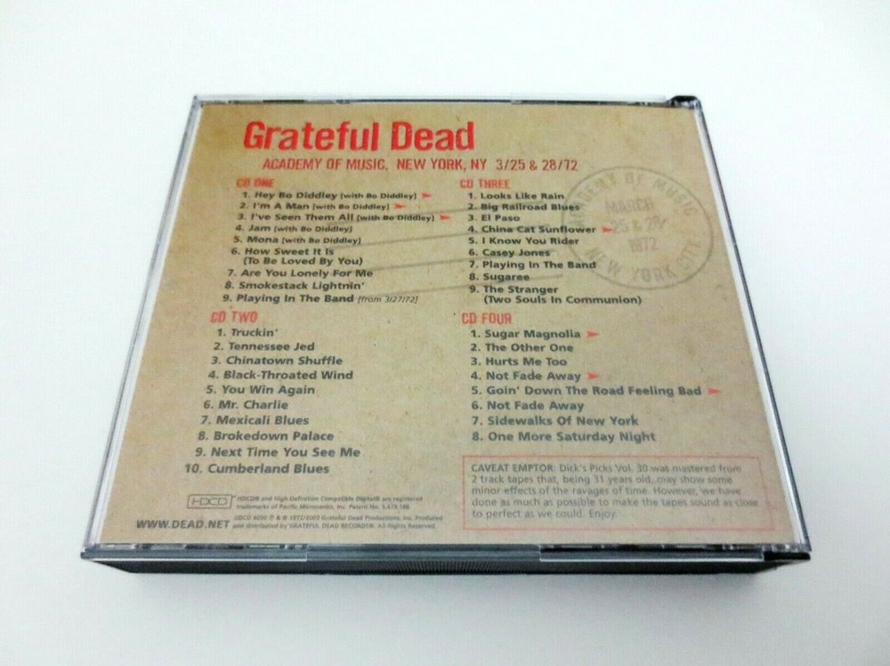 Grateful Dead - Dick's Picks 30 Volume Thirty - Academy of Music - New York City - New York, New York ( NY ) - March 25, 1972 ( 3/25/1972 ) & March 28, 1972 ( 3/28/1972 ) - 4 CD - 2003 Grateful Dead Productions (1972/2003) - GDCD 4050 ( 1st Edition ) - Original First Printing March 1972 to June 1972 Grateful Dead ( Jerry Garcia / Ron Pigpen McKernan / Bob Weir / Phil Lesh / Bill Kreutzmann / Keith Godchaux / Donna Jean Godchaux ) - Spring Tour 1972 ( 3/25/1972 & 3/28/1972 - New York, NY ) March 25, 1972 ( 3/25/1972 ) - Academy of Music - New York City - New York, New York ( NY ) March 28, 1972 ( 3/28/1972 ) - Academy of Music - New York City - New York, New York ( NY ) + 1-Track ( ' Playing In The Band ' ) from 3/27/1972 - Academy of Music - New York City - New York, New York ( NY ) The 3/25/1972 Show was a Party Booked by ' The Hell's Angels ! ' - Billed as ... " Jerry Garcia & Friends " Includes 5-Tracks with Bo Diddley !! Very Good condition - near Very Good/Like New ( very light marks on CD's ( very good/like new - near like new ) / light indentations on liner notes / light fading on outer spine ( front/back insert cards ) / near mint-mint CD case )