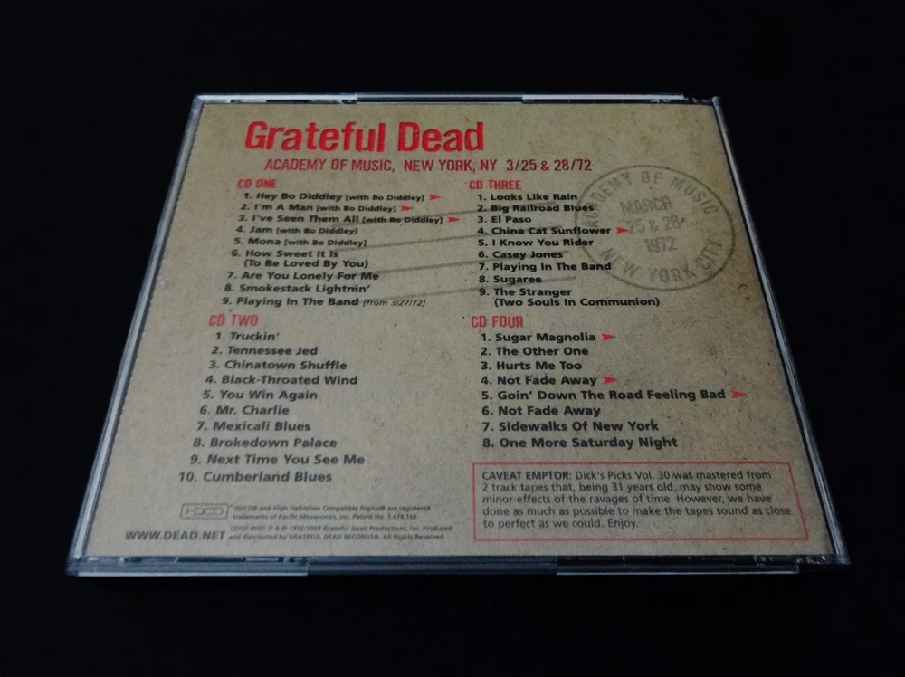 Grateful Dead : Dick's Picks 30 Volume Thirty : Academy Of Music 3/25,28/1972 : March 25 & 28, 1972 ( + March 27, 1972 ) - 3/25/1972 - 3/27/1972 - 3/28/1972 - Academy Of Music - New York, New York ( NY ) : 4 CD : 2003 (1972/2003) Grateful Dead Productions, Inc. ( GDP ) - GDCD 4050 : Original ! First ( 1st ! ) Printing ! - Very-Rare !!!! Smokin' Hot ! '72 Grateful Dead !! + Grateful Dead Playin' the Blues ! with Bo Diddley !!! ... ' Original ' 1st GDCD Printing ! - One of Rarest ! & Best !! of the ' Dick's Picks ' Thirty-Six ( 36 ) Volume Series !!!!! Hey Bo Diddley Dee !!!?! This Very-Rare ! ( 2003 GDP, Inc. Original 1st Printing ! ) Dick's Picks 30 4-CD Set captures an Amazing & Historic ! event in both Grateful Dead ! & Rock 'n Roll ! History !! Also considered to be the live & on-stage " tune-up " for the Legendary ! Europe '72 Tour, this Seven ( 7 ) Night U.S. run at New York City's Academy of Music is well-preserved in this official release by offering the goodness ( and probably the very-best ) of the 3/25 & 3/28 ( + 3/27 ) Shows from this run. Outside of the stand alone magic that '72 Dead nearly always delivers, this release offers Pigpen at his late best - still vocally strong, and giving it all he's got ! And the real treat ( and probably the true reason for this CD Set being so rare ), is that they are even joined on stage by Bo Diddley for Five ( 5 ) Songs on CD 1. This is one of the most-unique Dick's Picks ever, in the fact that a special guest is featured ' Playing in the Band ' with the Dead !!! And if that's not cool enough, I mean it's Bo Diddley we're talkin' about here !?! This is powerful & historic stuff ... indeed. My guess is that any music collector that loves either The Grateful Dead and/or " just the blues " has to have this one, simply because it is so downright awesome. Killer Grateful Dead ( with a Friend too ! ) in their Pre-Europe Tour 1972 Prime !!!!! A definite must-have here folks, indeed. Enjoy !!!!! TRACK LISTING >>> Grateful Dead ' Live ' at the Academy of Music in New York, New York ( NY ) on March 25 & 28, 1972 ( 3/25/1972 & 3/28/1972 ) : CD ONE : Hey Bo Diddley ( with Bo Diddley ) > I'm A Man I've Seen Them All Jam Mona How Sweet It Is ( To Be Loved By You ) Are You Lonely For Me Smokestack Lightnin' Playing In The Band ( from 3/27/72 ) CD TWO : Truckin' Tennessee Jed Chinatown Shuffle Black-Throated Wind You Win Again Mr. Charlie Mexicali Blues Brokedown Palace Next Time You See Me Cumberland Blues CD THREE : Looks Like Rain Big Railroad Blues El Paso China Cat Sunflower > I Know You Rider Casey Jones Playing In The Band Sugaree The Stranger ( Two Souls In Communion ) CD FOUR : Sugar Magnolia > The Other One Hurts Me Too Not Fade Away > Goin' Down The Road Feeling Bad > Not Fade Away Sidewalks Of New York One More Saturday Night Item Condition : This Very-Rare ! Out of Print ( 2003 GDP release ) Grateful Dead Dick's Picks Volume 30 Thirty ( Academy Of Music - New York, NY - 3/25 & 28/1972 ) Original ( 1st ! ) Printing 4-CD Disc Set ( GDCD 4050 ) is in Like New condition. CD's ( Disc 1, Disc 2, Disc 3, Disc 4 ) are in Like New (Near Mint/Mint!) condition (please see photos). Liner Notes ( 6-Page Booklet & Front/Back Inserts ) are in Like New (Near Mint/Mint!) condition (please see photos). CD Case ( 4-CD ) is in Like New (Near Mint/Mint!) condition (please see photos). This CD Set was purchased brand new/factory-sealed upon it's initial 2003 release, was played very carefully only one-time - and has been very carefully stored inside protective plastic in my professional CD rack. Please see all photos provided. Photos included are of the actual item you will receive. DP # 30 ! ... New York City !! - Academy Of Music !!! Wow !!!! Enjoy !!!!! Please Note : This is the Very Rare ! Genuine-Original First ( 1st ! ) Printing - 2003 Grateful Dead Productions ( GDCD 4050 ) !!! - Not the recent 2011 Real Gone / Razor & Tie Re-Issue / Re-Print ! ) Please ask any questions before bidding/buying & Best of Luck ! ( also ... please feel free to click the 'see other items' button above to check out my other related live listings - Thanks ! ) U.S. & International buyers welcome (additional shipping charges & delivery time will apply for international destinations). Shipping charges include delivery confirmation on every item. Returns accepted within 14 days of purchase if item is unused & undamaged (buyer pays return shipping). All items will be shipped as merchandise with the winning bid entered as item value (2023-2024).
