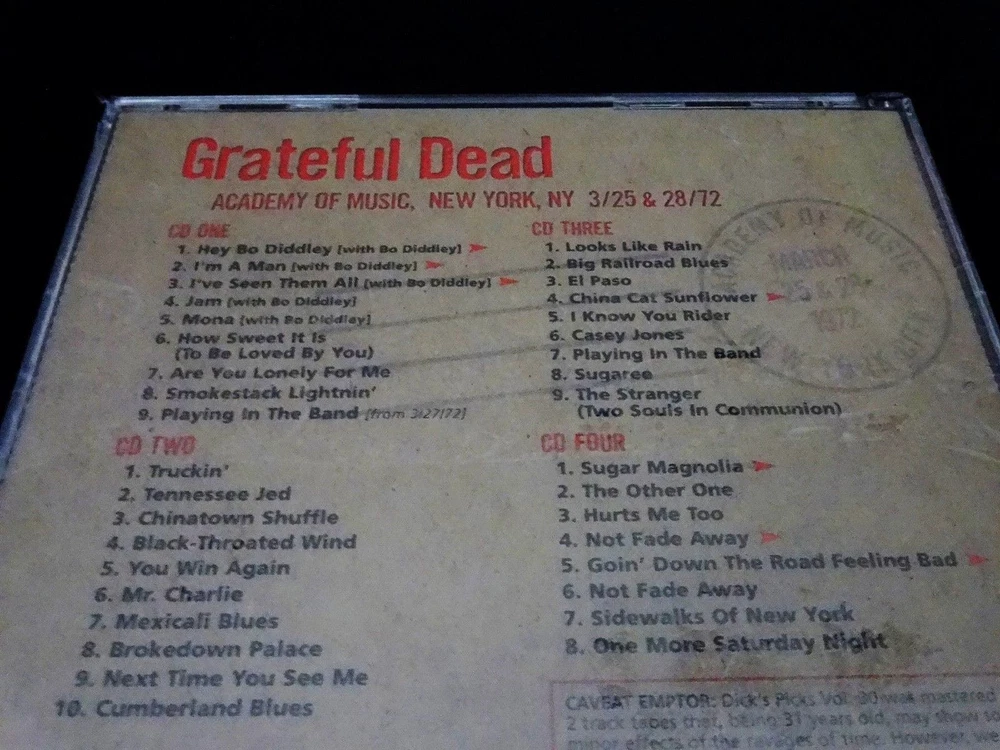 Grateful Dead : Dick's Picks 30 Volume Thirty : Academy Of Music 3/25,28/1972 : March 25 & 28, 1972 ( + March 27, 1972 ) - 3/25/1972 - 3/27/1972 - 3/28/1972 - Academy Of Music - New York, New York ( NY ) : Rare-Original ! First ( 1st ! ) Printing !! : 2003 (1972/2003) Grateful Dead Productions, Inc. ( GDP ) - GDCD 4050 : 4 CD : Brand New / Factory Sealed ! : Very-Rare !!!!! Smokin' Hot '72 Grateful Dead + Grateful Dead Playin' the Blues ! with Bo Diddley !!! ... Original 1st Printing ! - One of Rarest ! & Best !! of the Dick's Picks Thirty-Six ( 36 ) Volume Series !!!!! Hey Bo Diddley Dee !!!?! This Very-Rare ! ( 2003 GDP, Inc. Original 1st Printing ! ) Dick's Picks 30 4-CD Set captures an Amazing & Historic ! event in both Grateful Dead ! & Rock 'n Roll ! History !! Also considered to be the live & on-stage " tune-up " for the Legendary ! Europe '72 Tour, this Seven ( 7 ) Night U.S. run at New York City's Academy of Music is well-preserved in this official release by offering the goodness ( and probably the very-best ) of the 3/25 & 3/28 ( + 3/27 ) Shows from this run. Outside of the stand alone magic that '72 Dead nearly always delivers, this release offers Pigpen at his late best - still vocally strong, and giving it all he's got ! And the real treat ( and probably the true reason for this CD Set being so rare ), is that they are even joined on stage by Bo Diddley for Five ( 5 ) Songs on CD 1. This is one of the most-unique Dick's Picks ever, in the fact that a special guest is featured ' Playing in the Band ' with the Dead !!! And if that's not cool enough, I mean it's Bo Diddley we're talkin' about here !?! This is powerful & historic stuff ... indeed. My guess is that any music collector that loves either The Grateful Dead and/or " just the blues " has to have this one, simply because it is so downright awesome. Killer Grateful Dead ( with a Friend too ! ) in their Pre-Europe Tour 1972 Prime !!!!! A definite must-have here folks, indeed. Enjoy !!!!! TRACK LISTING >>> Grateful Dead ' Live ' at the Academy of Music in New York, New York ( NY ) on March 25 & 28, 1972 ( 3/25/1972 & 3/28/1972 ) : CD ONE : Hey Bo Diddley ( with Bo Diddley ) > I'm A Man I've Seen Them All Jam Mona How Sweet It Is ( To Be Loved By You ) Are You Lonely For Me Smokestack Lightnin' Playing In The Band ( from 3/27/72 ) CD TWO : Truckin' Tennessee Jed Chinatown Shuffle Black-Throated Wind You Win Again Mr. Charlie Mexicali Blues Brokedown Palace Next Time You See Me Cumberland Blues CD THREE : Looks Like Rain Big Railroad Blues El Paso China Cat Sunflower > I Know You Rider Casey Jones Playing In The Band Sugaree The Stranger ( Two Souls In Communion ) CD FOUR : Sugar Magnolia > The Other One Hurts Me Too Not Fade Away > Goin' Down The Road Feeling Bad > Not Fade Away Sidewalks Of New York One More Saturday Night Item Condition : This Very-Rare ! Out of Print ( 2003 GDP release - Original First ( 1st ! ) Printing - GDCD 4050 ) Grateful Dead Dick's Picks Volume 30 Thirty ( Academy Of Music - New York, NY - 3/25 & 28/1972 ) 4-CD Disc Set is in Brand New / Factory Sealed ! * Please Note * : The factory sealing shink wrap is lightly severed, as shown in the multiple photos provided ( please see photos ). Please see all photos provided. Photos included are of the actual item you will receive. DP # 30 ! ... New York City !! - Academy Of Music !!! Wow !!!! Enjoy !!!!! Please Note : This is the Very Rare ! Genuine-Original First ( 1st ! ) Printing - 2003 Grateful Dead Productions ( GDCD 4050 ) !!! ( This item is Not the recent 2011 Real Gone / Razor & Tie Re-Issue / Re-Print ! ) Please ask any questions before bidding/buying & Best of Luck ! ( also ... please feel free to click the 'see other items' button above to check out my other related live listings - Thanks ! ) U.S. & International buyers welcome (additional international shipping charges & delivery time will apply for international destinations). Shipping charges include delivery confirmation on every item. Returns accepted within 14 days of purchase if item is returned brand new / factory sealed (unopened with original factory-sealing shrink wrap in tact), unused & undamaged (buyer pays return shipping). All items will be shipped as merchandise with the winning bid entered as item value (2023-2024).