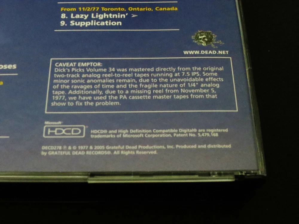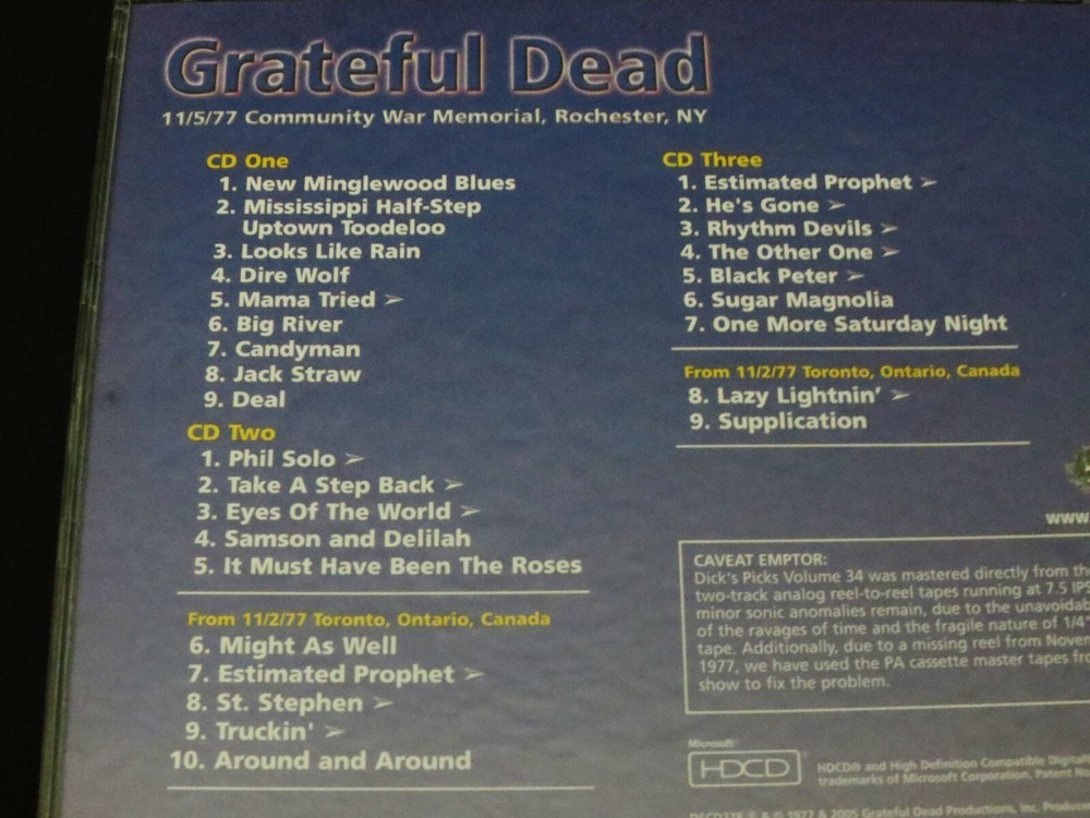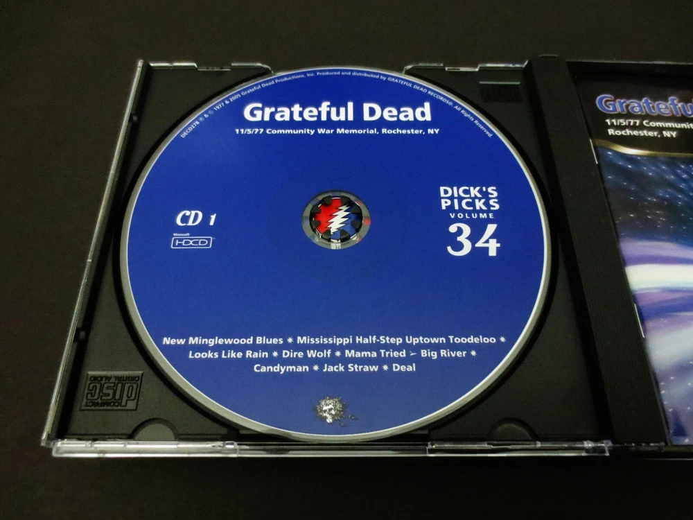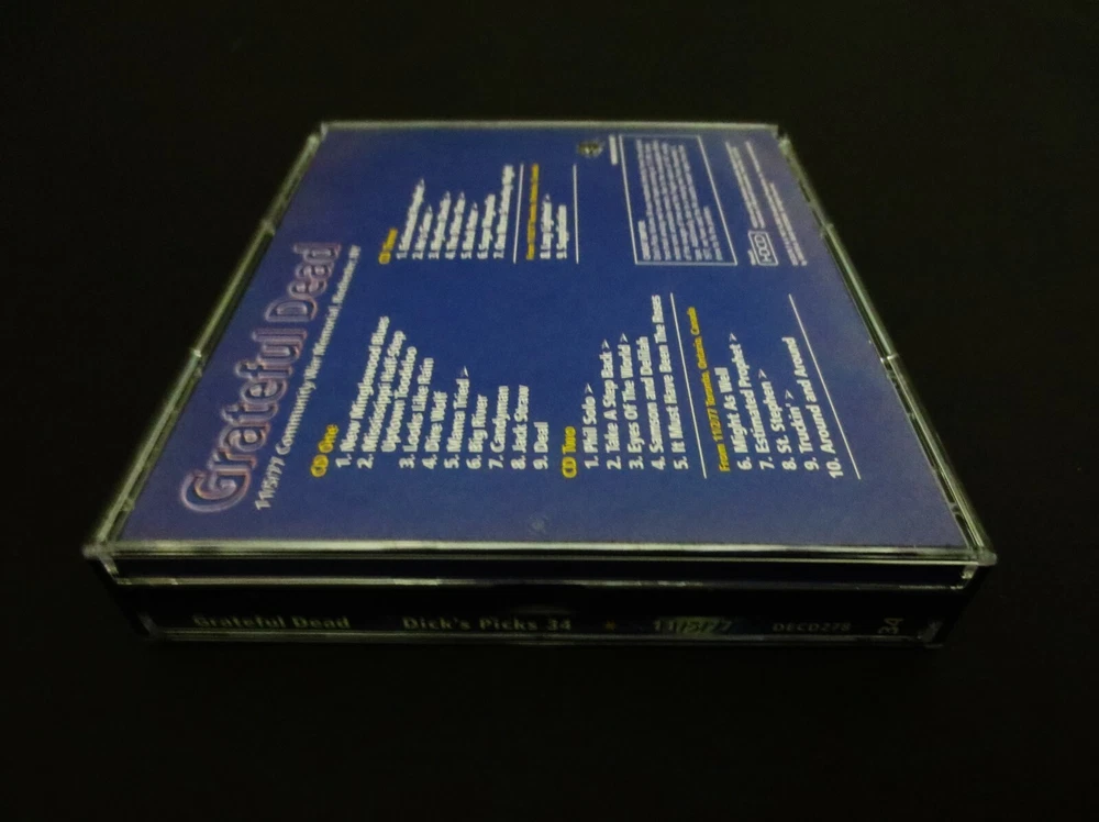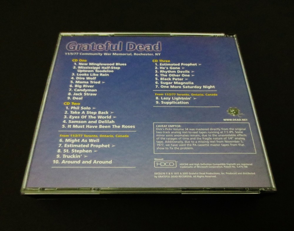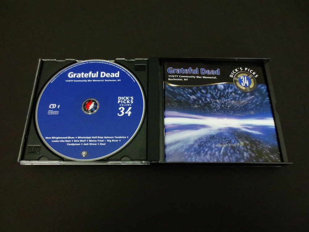 Grateful Dead : Dick's Picks 34 Volume Thirty Four : November 5, 1977 ( 11/5/1977 ) - Community War Memorial - Rochester, New York ( NY ) : 2005 (1977/2005) Grateful Dead Productions, Inc. ( GDP ) : Original ! First ( 1st ! ) Printing ( DECD 278 ) - Not the Real Gone ' Re-issue ' ! : 3 CD : Out of Print ! & Ultra-Rare !!!!! Grateful Dead '77 Fall Tour !!!!! ... and this-is indeed the " Original ! " G.D. ( 2005 Grateful Dead Productions, Inc. ) release DECD278 ( Not the Real Gone 2011 Re-Print / Re-Issue ) -- Fall Tour '77 New York Live-Dead !!! Wow ..... as this is a Seriously - High-Energy '77 Show !, where each disc gets better !, better !! & then ( you guessed it ... ) - Better !!! A True Grateful Dead " Gem "of a '77 performance!!! I hope you already know what I'm taking about here loyal Dead-Fans, because this one is an Amazing-Rocker ! This is a 3-CD Set, and you are also treated to Seven ( 7 ) Bonus Tracks from the 11/2/77 Toronto, Ontario Show just three ( 3 ) nights prior. This was " Dick's Last Pick from the '77 Well ", and in some ways he did indeed save some nuggets of the best stuff for last. As with much of '77 Dead, the percussion time-keeping is just immaculate - but this is indeed one of those more-so uptempo nights where the energy flows freely, and good timing leads to good vocals, to good stage charisma, and to pushing the envelopes when the pockets present themselves. Vocally, they're just on ! And Jerry ? Shows like this ( & Englishtown too ! ) make me wonder why he ever permanently parted with that MXR Distortion + and MXR Analog Delay ... with the Reticon Chip ! -- these things just Take-Charge ! on the Tone !! -- I mean turning Solos ! turn to So~Los !!! Ha ! But then again, it is Garcia driving them ... the King of Rock 'n Roll ! And nobody can do it just 'quite' like him. Hip, hip hurr~Ahhh for this 1977 Grateful Dead Dick ! Just plain " Thanks ". I mean what else can I say ? This release just barn-stormed my mind ... and then yes, that feeling too often in " Deadheadland ! " -- where in the world have You-been, all of my Life ??! Enjoy this Beauty ... as it's a Flat-Out '77 Heater !!!!!!! TRACK LISTING >>> Grateful Dead recorded ' Live ' at the Community War Memorial in Rochester, NY on November 11, 1977 ( 11/5/1977 ) - with Toronto, Ontario, Canada ( 11/2/77 ) Bonus Tracks included : CD 1 : New Minglewood Blues 1/2 Step Mississippi Looks Like Rain Dire Wolf Mama Tried > Big River Candyman Jack Straw Deal CD 2 : Phil Solo > Take A Step Back > Eyes Of The World > Samson & Delilah It Must Have Been The Roses From 11/2/1977 Toronto, Ontario, Canada : Might As Well Estimated Prophet > St. Stephen > Truckin' > Around & Around CD 3 : Estimated Prophet > He's Gone > Rhythm Devils > The Other One > Black Peter > Sugar Magnolia One More Saturday Night From 11/2/1977 Toronto, Ontario, Canada : Lazy Lightnin' > Supplication Item Condition : This Extremely-Rare ! " Original 1st Printing ! " Grateful Dead Dick's Picks 34 ( 11/5/77 - Community War Memorial - Rochester, New York ( 2005 ( DECD278 ) ) 3-CD Set is in Very Good/Like New condition - very-close to Like New (Near Mint!). CD's ( Disc 1, Disc 2, Disc 3 ) are in Very Good/Like New condition - close to Like New (Near Mint!), with very-light marks on the playing surfaces (please see photos). Liner Notes ( Inside Insert ( 16-Page Booklet ) & Front/Back Insert Cards ) are in Like New (Near Mint/Mint!) condition (please see photos). CD Case ( 3-CD Wide Jewel Case ) is in Like New (Near Mint/Mint!) condition (please see photos). Please see all photos provided. Photos included are of the actual item you will receive. '77 Fall Tour ... the DP # 34 Original 1st ! Printing !! ... Enjoy !!!!! ((( *** All serious Collector's of Grateful Dead Music ... This is the " Original ! " ( Genuine / Authentic ) 1st Printing ! issued in 2005 ( DECD278 ) - and is not the 2011 Real Gone Re-Issue ! *** ))) Please ask any questions before bidding/buying & Best of Luck ! ( also ... please feel free to click the 'see other items' button above to check out my other related live listings - Thanks ! ) U.S. & International buyers welcome (additional international shipping charges & delivery time will apply for international destinations). Shipping charges include delivery confirmation on every item. Returns accepted within 14 days of purchase if item is returned unused & undamaged (buyer pays return shipping). All items will be shipped as merchandise with the winning bid entered as item value (2025-2026).