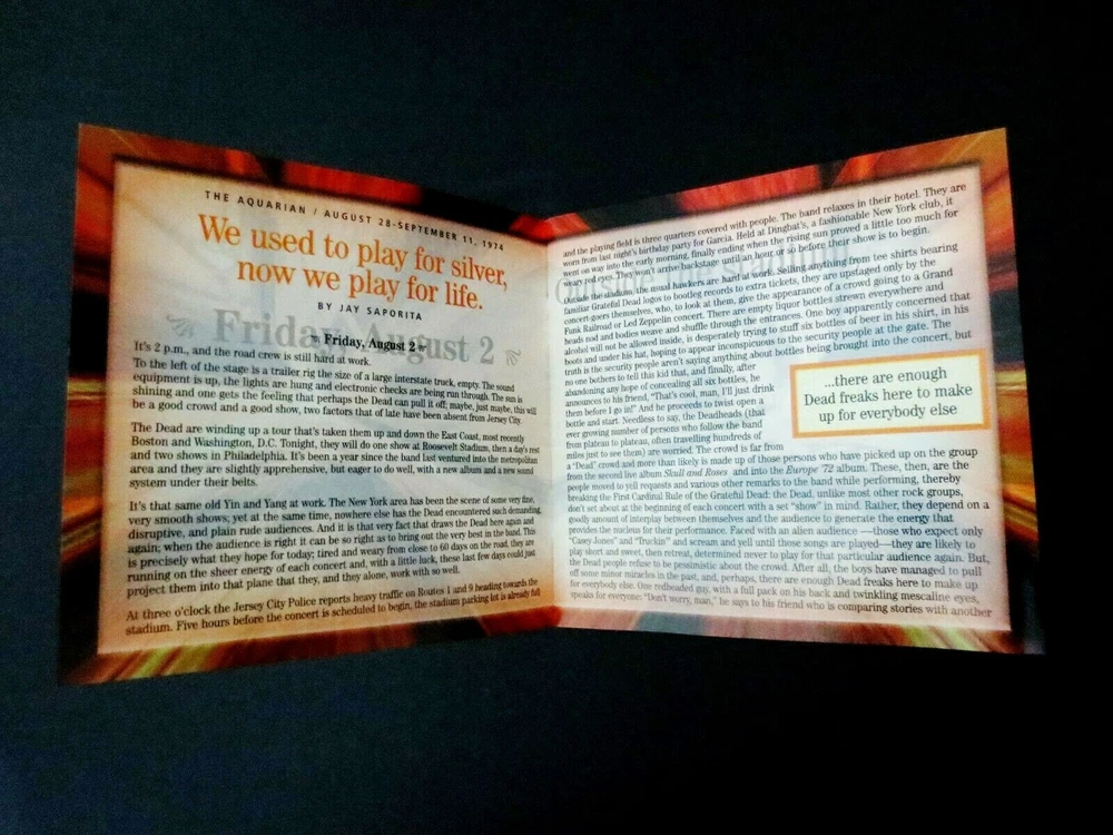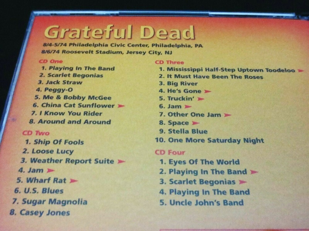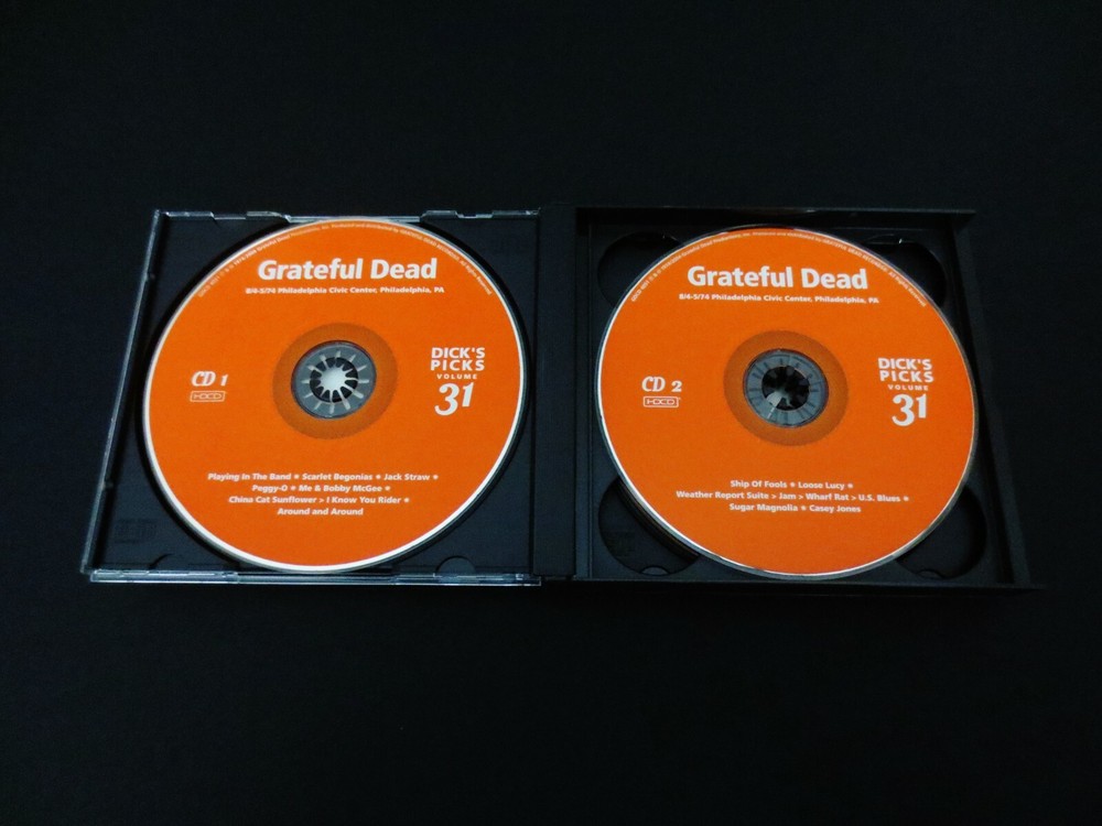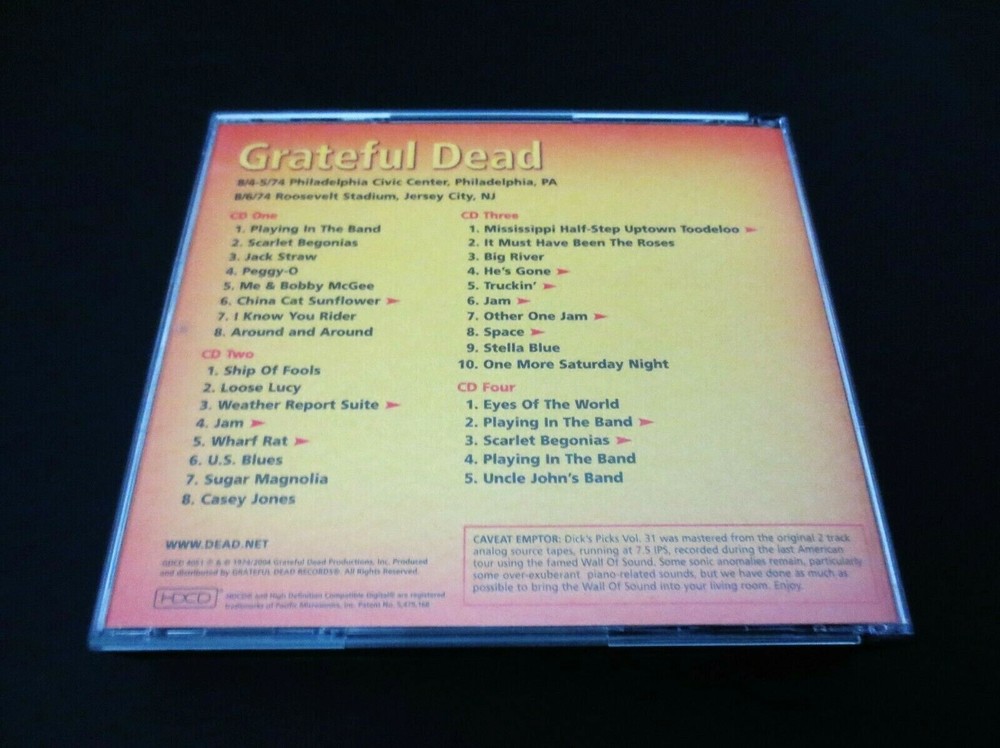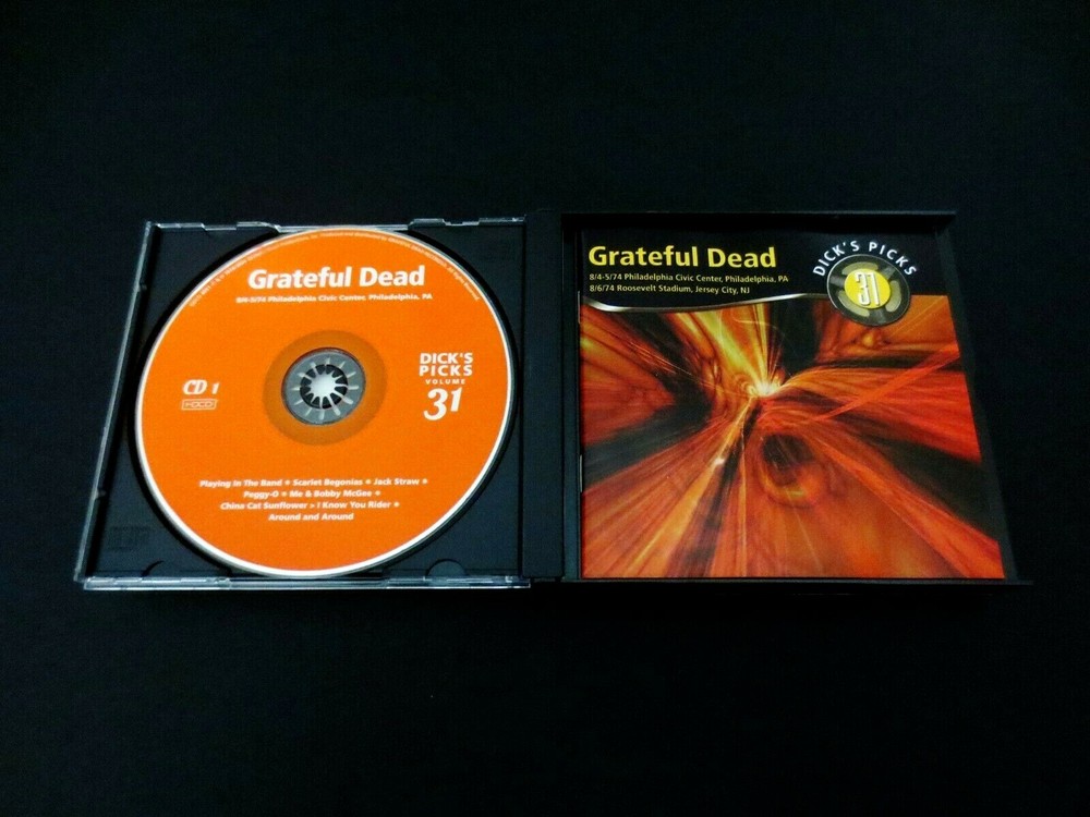 Grateful Dead : Dick's Picks 31 Volume Thirty One : August 4 & 5, 1974 ( 8/4/1974 & 8/5/1974 ) - 8/4-5/1974 Philadelphia, Pennsylvania ( PA ) & August 6, 1974 ( 8/6/1974 ) 8/6/74 - Jersey City, New Jersey ( NJ ): 2004 (1974/2004) Grateful Dead Productions, Inc. ( GDP ) - GDCD 4051 : " Original ! " First ( 1st ! ) Printing ! : 2004 release ( Not the 2012 Re-Issue / Re-Print ! ) : 4 CD Set : Very-Rare !!!! 4-CD Set >>>> Dick's Picks 31 from 1974 !!! : Philadelphia Civic Center - Philadelphia, PA ( 8/4-5/1974 ) - and - Roosevelt Stadium, Jersey City, NJ ( 8/6/1974 ) : Wall of Sound !!!!!!! *** Original First ( 1st ! ) Printing ! ..... Grateful Dead Productions, Inc. >>> GDCD 4051 !!! *** Alright ! Yes !!! I love it ... as it appears 1974 Grateful Dead is indeed fresh on the menu these days - and appears to be right back in Style ( as if it ever left ! ) as the recent-fashion of the day. A few of the newer releases from the G.D. Vault are fine performances from 1974 : '74 Dillon Stadium ( Hartford, CT ) release ( DP # 2 ) -- '74 Cap Centre ( Landover, MD ) - ( DP 2012 Bonus Disc ) -- and '74 University of Montana - Missoula, MT ( DP # 9 ) !!! And, as we already well know, these were the final glorious days of the monstrous & beautifully sounding " Wall of Sound " - the massive, and downright-genius Sound System of The Grateful Dead in 1974 ! It debuted in February '74, and delivered a pristine & unmatched live concert for Grateful Dead Fans like no other. Unfortunately, as the documented stories & proof goes - this beast of a system took a toll on the inner-Grateful Dead Family, both Band & Road Crew too ! As fine as it sounded it became a physical, logistical & large financial drain on our heroes ( yes, you too " Road Crew " are our heroes as well - as hopefully you already knew ! ). This system was one of many factors that lead to the darn-near disbanding of the band during the " hiatus " period at the end of 1974, following the October Winterland run. So, despite folks selling their souls - for the very good cause of amplified Rock 'n Roll sound, this system is a one of a kind - and it clearly shows in the tale of the tape : Six ( 6 ) Independent Sound Systems ( one each-unique for Vocals, Lead-Guitar, Rhythm-Guitar, Piano, Bass & Drums ) ! Eleven ( 11 ) separate Channels ! Forty-Eight ( 48 ) Amplifiers ! And yes ... Six-Hundred-Forty-One ( 641 ) Speakers !!! So with that - I'll inform you of the specific details of how the " Wall " does more than its fair-share on this treasure of a G.D. release ... Disc 1 offers a simply Must hear Playin', Scarlet & China Rider !!! Wow & that's just CD 1 !?! Disc 2 would probably pride itself on the Weather Report > Jam ! > Wharf Rat where band communication gets nice & spacey just how we like it ! Disc 3 & 4 really duke it out for the top stop, and here's how : CD Three delivers a He's Gone > Truckin' > Jam! > Other One Jam! > Space > Stella Blue that may be some of the finest musical notes & interplay that ever came out of the " Wall ". Then, if that's not enough Dead-for-Your-Head, then Disc 4 answers with this, and simply this : Eyes > Playin' > Scarlet > Playin' & Uncle John's Band. So, as it pretty much goes without saying -- this release is a Must-hear... & Must-own too for any serious fan who prides themselves on owning every professional release that captures those moments when the band is at their best. Hey up there Dick ! Thanks for springing this one on us, yet another hidden-gem from that gold-mine vault of treasures that we never knew existed. You ! are the absolute-best at these surprises & for that we Thank-You ! & are Forever Grateful !! Big-League '74 ! here fans ... I mean dig-in & Enjoy !!!! TRACK LISTING >>> Grateful Dead recorded ' Live ' at the Philadelphia Civic Center in Philadelphia, Pennsylvania ( PA ) on 8/4-5/1974 - and - at Roosevelt Stadium in Jersey City, New Jersey ( NJ ) on 8/6/1974 : CD 1 : Playing In The Band Scarlet Begonias Jack Straw Peggy-O Me & Bobby McGee China Cat Sunflower > I Know You Rider Around And Around CD 2 : Ship Of Fools Loose Lucy Weather Report Suite > Jam > Wharf Rat > U.S. Blues Sugar Magnolia Casey Jones CD 3 : Mississippi Hefl-Step Uptown Toodeloo > It Must Have Been The Roses Big River He's Gone > Truckin' > Jam > Other One Jam > Space > Stella Blue One More Saturday Night CD 4 : Eyes Of The World Playing In The Band > Scarlet Begonias > Playing In The Band Uncle John's Band Item Condition : This Very-Rare !! " Original ! " 1st Printing ! ( 2004 GDP release ( GDCD 4051 ) ) Grateful Dead Dick's Picks 31 ( 8/4-5/1974 Philadelphia Civic Center - Philadelphia, PA & 8/6/1974 Roosevelt Stadium - Jersey City, NJ ) 4-CD Set is in Very Good/Like New condition - close to Like New. CD's ( Disc 1, Disc 2, Disc 3, Disc 4 ) are in Very Good/Like New condition - close to Like New, with faint light marks on the playing surfaces (please see photos). Liner Notes ( Inside Insert ( 18-Page Booklet ) & Front/Back Insert Cards ) are in Very Good condition - close to Very Good/Like New (Near Mint) with very light indentations (please see photos). CD Case ( 4-CD Wide Jewel Case ) is in Like New (Near Mint/Mint!) condition (please see photos). This 4-CD Set has been very carefully stored inside protective plastic in my professional CD rack. Please see all photos provided. Photos included are of the actual items you will receive. '74 Summer Tour G.D. ! in the Mid-Atlantic !! ... Enjoy !!! Please Note : This Very-Rare ! 4-CD Set is the " Original 1st Printing ! " ( 2004 Grateful Dead Productions, Inc. ) release ( GDCD 4051 ), and is not the 2012 " Real Gone " brand re-released & later pressed ( ' Re-Printed ' ) version of this CD Set. This one here is the Genuine / Authentic Original GDP 1st Printing ! - from 2004 !! Please ask any questions before bidding/buying & Best of Luck ! ( also ... please feel free to click the 'see other items' button above to check out my other related live listings - Thanks ! ) U.S. & Interna