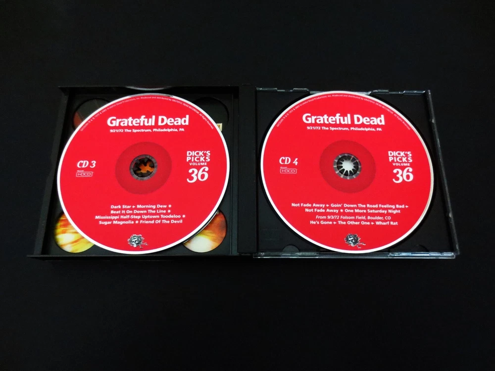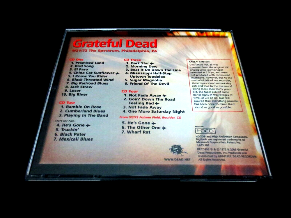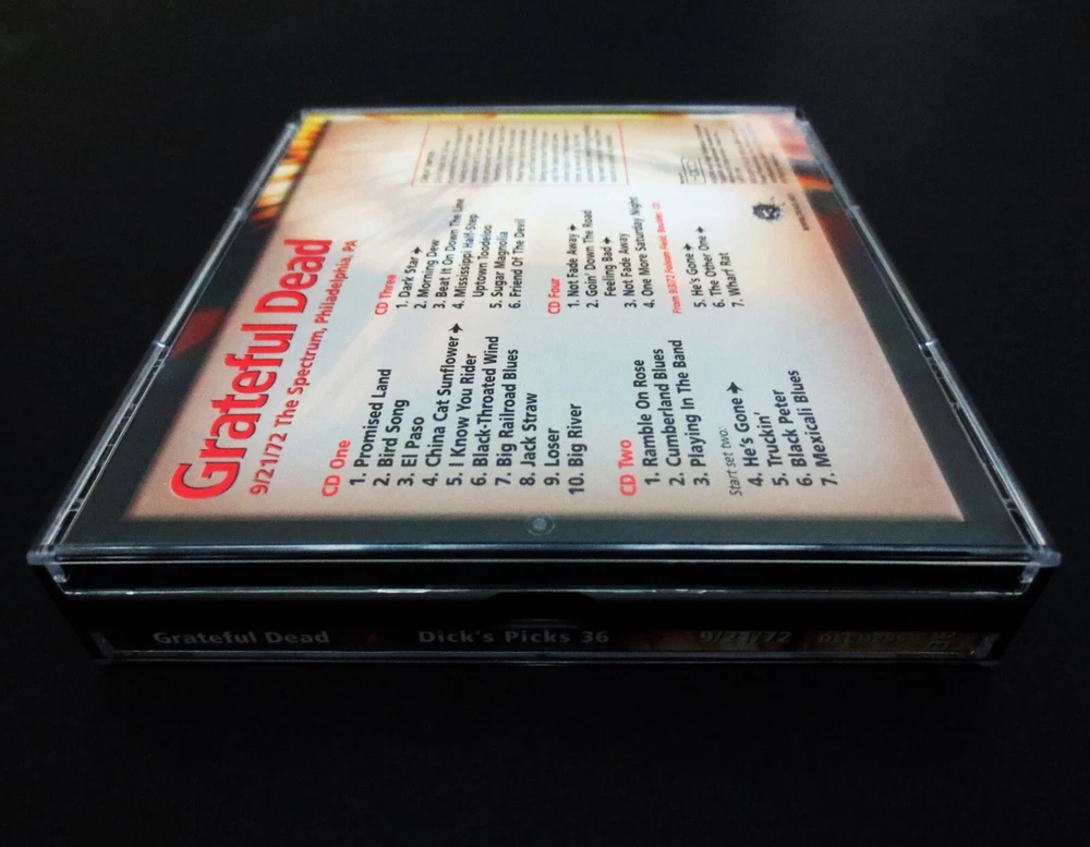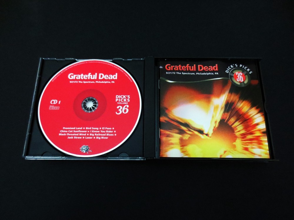 Grateful Dead : Dick's Picks 36 Volume Thirty Six : September 21, 1972 ( 9/21/1972 ) - The Spectrum - Philadelphia, Pennsylvania ( PA ) : 4 CD : 2005 (1972/2005) Grateful Dead Productions, Inc. ( GDP ) - DECD295 : ' Original ! ' First ( 1st ! ) Printing Issue : Out of Print ! - Very-Rare !!!!! The Last & Final ! " Dick's Picks Volume " in the Amazing !! Dick's Picks Series ... Dick's Picks # 36 ! - 1972 Fall Tour ... September 21, 1972 at The Spectrum !!! - Nothing-short of Amazing !!!!! ... Fall Tour 1972 Live-Dead !!! - at the Good Ol' Philly Spectrum !!!! Grateful Dead Fall Tour '72 ... at the Spectrum !!! Wow ... talk about G.D. that is so Incredibly Sweet ! to your Ears & Kind to your Mind !!!? This my fellow Fans, is n othing short of a Brilliant ! ' Prime-Era ' Grateful Dead performance, that is seamless, tight, and close to musical perfection. Just like we all know the Dead could do in this Era - and here, my goodness do they ever pull it off in Grand ! fashion. The cohesiveness between Band members in these 2-Sets ( 4-CD's ! ) basically lacks nothing. Vocals, Tone, Charge, Segue Transitions, Attack, and of course ... Magic ! This set is a prime-time example as to exactly why many fans not only love their ' pre-hiatus ' ( '74 ) Grateful Dead - but it also points with precision as to why '72 is pound-for-pound an overall favorite year to many, of our beloved Grateful Dead ! Talk about fresh, young, ripped, roaring & ready - this here is only the 2nd Show ever ! that the Band played at the infamous East Coast Venue - The Spectrum ! ... and as you probably well know, this is a Venue that the Band delivered its mighty-magic to over 50-Times ! Starting in 1968, all the way through their last & final touring year in 1995. And, unlike nearly all of those Spectrum Shows - Garcia is not playing a Fender Strat, but here ... that is indeed his weapon of choice, and my oh my does he make the most of that twangy-tonality - yet another wonderful audible staple of this initial '70's era especially trademarked in '72. Set wise, there is nothing really missing from the Band's song rotation in this night, as they deliver the Bird Song - China > Rider - B.T. Wind - Loser - Ramble On - Cumberland - Playin' - He's Gone - Truckin' - Dark Star > Dew ! - 1/2 Step Mississippi - Sugar Magnolia - NFA - GDTRFB - and ... even if you were about to think that the Other One was missing ? Well, you are correct - nice Eagle Eye! But, not in entirety ... as there is also a three ( 3 ) song segment added ! to this set, which is included on CD 4 from Folsom Field in Boulder, Colorado ( 9/3/1972 ) - delightfully including He's Gone > Other One ! > Wharf Rat. So, if this song selection was almost perfection, well you know Dick ... as he took care of the rest - as I certainly assume it was him that so perfectly added this fine ' filler '. And last, but most certainly not least ... this here was obviously the Last/Final installment of the beloved Dick's Picks Series which was delivered to the Dead Fans like clockwork from 1993 through 2005. I don't think it's any secret that there was a little " let's make the last one, a Grate ! one " going on here. At least that is my view, because this 9/21/72 Spectrum night is one that could most definitely hold its own, against not only any other Show from this Era - but really ... any other Show ! This one ? It's just that good ... Crystal-clean Grateful Dead Live ! - at near, or just plain Good Ol' Perfection !!! And being the " last " of the Dick's Picks Series, the Band had another fantastic trick up their collective sleeves in this release ... and it is indeed an Amazing ! one. Not only is the Liner Notes Booklet ( 28-Pages ! ) filled with incredible-photos ... but, it also includes a detailed 7-page dialogue by none other than the great Owsley " Bear " Stanley himself ! ... Bear !!!!! And you might ask what his topic of discussion is here ? Well, you likely have already guessed it ... ' Sound ' !!! Or, better said by Bear himself : " Notes : On Sound, My Theories And Techniques ". Yeah, exactly ... Wow ! This essay / inclusion was written on 9/26/2005 - by Bear himself, and he goes into delightful detail on the actual audio-recording of this Amazing-Show ! Sharing in detail his techniques, challenges, theories, the process, the equipment, etc.. For any serious G.D. Audiophile, this is very special & privileged information - that is so incredibly rich in knowledge. For me personally, I actually read this booklet - ' after ' listening to this Show for the very 1st time, like I often do - and in this case, I was pretty-much blown-back ... almost like " Whoa !!?! " - this final-installment of the Dick's Picks Series just got even better yet !?! Which prior, I really didn't really think was a possibility. Dick's Picks # 36 ... the Last ! And all that is really left to say, is the obvious ... Thank You Dick ! And of course, Thank You Grateful Dead !!! A truly-Truly ! Amazing !! & Historic !!! Series ..... TRACK LISTING >>> Grateful Dead recorded ' Live ' by Owsley " Bear " Stanley at The Spectrum in Philadelphia, Pennsylvania ( PA ) on September 21, 1972 ( 9/21/1972 ) : CD 1 : Promised Land Bird Song El Paso China Cat Sunflower > I Know You Rider Black-Throated Wind Big Railroad Blues Jack Straw Loser Big River CD 2 : Ramble On Rose Cumberland Blues Playing In The Band Start Set Two : He's Gone > Truckin' Black Peter Mexicali Blues CD 3 : Dark Star > Morning Dew Beat It On Down The Line Mississippi Half Step Uptown Toodeloo Sugar Magnolia Friend Of The Devil CD 4 : Not Fade Away > Goin' Down The Road Feeling Bad > Not Fade Away One More Saturday Night From 9/3/72 Folson Field, Boulder, CO : He's Gone > The Other One > Wharf Rat Item Condition : This Very-Rare ! Grateful Dead Dick's Picks 36 - Original ! 2005 GDP release DECD295 ( 9/21/1972 The Spectrum, Philadelphia, Pennsylvania ( PA ) ) 4-CD Set is in Very Good condition - close to Very Good/Like New overall. CD's (Disc 1, Disc 2