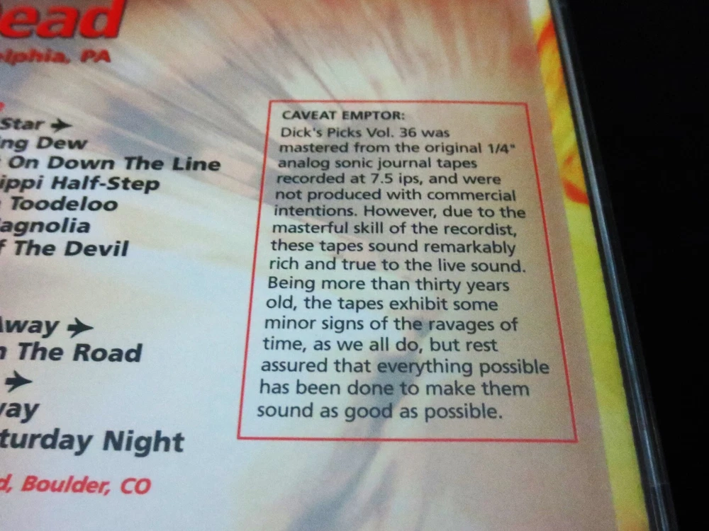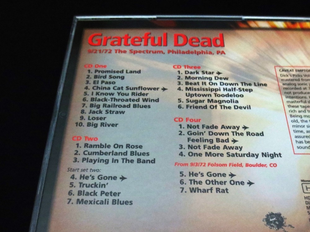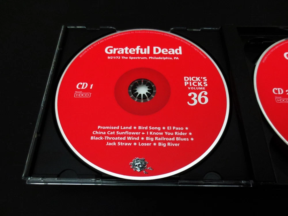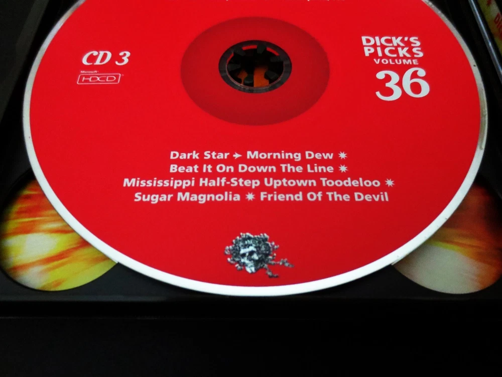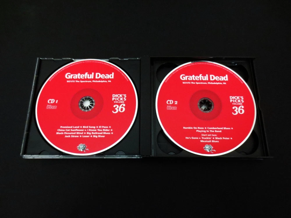 Grateful Dead : Dick's Picks 36 Volume Thirty Six : September 21, 1972 ( 9/21/1972 ) - The Spectrum - Philadelphia, Pennsylvania ( PA ) : 4 CD : 2005 (1972/2005) Grateful Dead Productions, Inc. ( GDP ) - DECD295 : ' Original ! ' First ( 1st ! ) Printing Issue : Out of Print ! - Very-Rare !!!!! The Last & Final ! " Dick's Picks Volume " in the Amazing !! Dick's Picks Series ... Dick's Picks # 36 ! - 1972 Fall Tour ... September 21, 1972 at The Spectrum !!! - Nothing-short of Amazing !!!!! ... Fall Tour 1972 Live-Dead !!! - at the Good Ol' Philly Spectrum !!!! Grateful Dead Fall Tour '72 ... at the Spectrum !!! Wow ... talk about G.D. that is so Incredibly Sweet ! to your Ears & Kind to your Mind !!!? This my fellow Fans, is n othing short of a Brilliant ! ' Prime-Era ' Grateful Dead performance, that is seamless, tight, and close to musical perfection. Just like we all know the Dead could do in this Era - and here, my goodness do they ever pull it off in Grand ! fashion. The cohesiveness between Band members in these 2-Sets ( 4-CD's ! ) basically lacks nothing. Vocals, Tone, Charge, Segue Transitions, Attack, and of course ... Magic ! This set is a prime-time example as to exactly why many fans not only love their ' pre-hiatus ' ( '74 ) Grateful Dead - but it also points with precision as to why '72 is pound-for-pound an overall favorite year to many, of our beloved Grateful Dead ! Talk about fresh, young, ripped, roaring & ready - this here is only the 2nd Show ever ! that the Band played at the infamous East Coast Venue - The Spectrum ! ... and as you probably well know, this is a Venue that the Band delivered its mighty-magic to over 50-Times ! Starting in 1968, all the way through their last & final touring year in 1995. And, unlike nearly all of those Spectrum Shows - Garcia is not playing a Fender Strat, but here ... that is indeed his weapon of choice, and my oh my does he make the most of that twangy-tonality - yet another wonderful audible staple of this initial '70's era especially trademarked in '72. Set wise, there is nothing really missing from the Band's song rotation in this night, as they deliver the Bird Song - China > Rider - B.T. Wind - Loser - Ramble On - Cumberland - Playin' - He's Gone - Truckin' - Dark Star > Dew ! - 1/2 Step Mississippi - Sugar Magnolia - NFA - GDTRFB - and ... even if you were about to think that the Other One was missing ? Well, you are correct - nice Eagle Eye! But, not in entirety ... as there is also a three ( 3 ) song segment added ! to this set, which is included on CD 4 from Folsom Field in Boulder, Colorado ( 9/3/1972 ) - delightfully including He's Gone > Other One ! > Wharf Rat. So, if this song selection was almost perfection, well you know Dick ... as he took care of the rest - as I certainly assume it was him that so perfectly added this fine ' filler '. And last, but most certainly not least ... this here was obviously the Last/Final installment of the beloved Dick's Picks Series which was delivered to the Dead Fans like clockwork from 1993 through 2005. I don't think it's any secret that there was a little " let's make the last one, a Grate ! one " going on here. At least that is my view, because this 9/21/72 Spectrum night is one that could most definitely hold its own, against not only any other Show from this Era - but really ... any other Show ! This one ? It's just that good ... Crystal-clean Grateful Dead Live ! - at near, or just plain Good Ol' Perfection !!! And being the " last " of the Dick's Picks Series, the Band had another fantastic trick up their collective sleeves in this release ... and it is indeed an Amazing ! one. Not only is the Liner Notes Booklet ( 28-Pages ! ) filled with incredible-photos ... but, it also includes a detailed 7-page dialogue by none other than the great Owsley " Bear " Stanley himself ! ... Bear !!!!! And you might ask what his topic of discussion is here ? Well, you likely have already guessed it ... ' Sound ' !!! Or, better said by Bear himself : " Notes : On Sound, My Theories And Techniques ". Yeah, exactly ... Wow ! This essay / inclusion was written on 9/26/2005 - by Bear himself, and he goes into delightful detail on the actual audio-recording of this Amazing-Show ! Sharing in detail his techniques, challenges, theories, the process, the equipment, etc.. For any serious G.D. Audiophile, this is very special & privileged information - that is so incredibly rich in knowledge. For me personally, I actually read this booklet - ' after ' listening to this Show for the very 1st time, like I often do - and in this case, I was pretty-much blown-back ... almost like " Whoa !!?! " - this final-installment of the Dick's Picks Series just got even better yet !?! Which prior, I really didn't really think was a possibility. Dick's Picks # 36 ... the Last ! And all that is really left to say, is the obvious ... Thank You Dick ! And of course, Thank You Grateful Dead !!! A truly-Truly ! Amazing !! & Historic !!! Series ..... TRACK LISTING >>> Grateful Dead recorded ' Live ' by Owsley " Bear " Stanley at The Spectrum in Philadelphia, Pennsylvania ( PA ) on September 21, 1972 ( 9/21/1972 ) : CD 1 : Promised Land Bird Song El Paso China Cat Sunflower > I Know You Rider Black-Throated Wind Big Railroad Blues Jack Straw Loser Big River CD 2 : Ramble On Rose Cumberland Blues Playing In The Band Start Set Two : He's Gone > Truckin' Black Peter Mexicali Blues CD 3 : Dark Star > Morning Dew Beat It On Down The Line Mississippi Half Step Uptown Toodeloo Sugar Magnolia Friend Of The Devil CD 4 : Not Fade Away > Goin' Down The Road Feeling Bad > Not Fade Away One More Saturday Night From 9/3/72 Folson Field, Boulder, CO : He's Gone > The Other One > Wharf Rat Item Condition : This Very-Rare ! Grateful Dead Dick's Picks 36 - Original ! 2005 GDP release DECD295 ( 9/21/1972 The Spectrum, Philadelphia, Pennsylvania ( PA ) ) 4-CD Set is in Very Good condition - close to Very Good/Like New overall. CD's (Disc 1, Disc 2