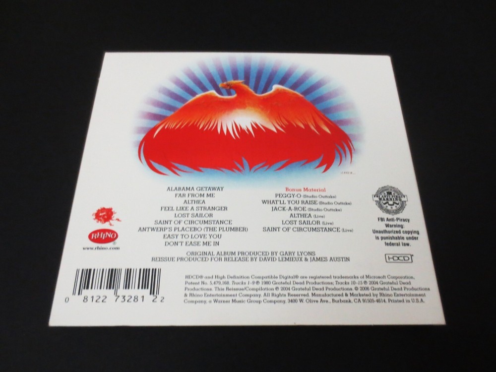 Grateful Dead : Go To Heaven : 19 80 : 2004 Remastered ( 2006 GDP / Rhino ' Individual' Issue Remaster ! ) with Six ( 6 ) Studio Outtakes ! & Live !! Bonus Material Tracks !!! : 1-CD : Grateful Dead ' Band Front Cover Photo ' ( + ' alternate ' internal Liner Notes Photos ) - by Bob Seidemann ... & ' Phoenix Rising ' Back Cover Art - by Stanley Mouse ! : '80's DEAD !!!!! Dead Fans !! ... & " 80's Dead Heads !!! ". Offered here is the Grateful Dead 2004 " Remastered " ( 2006 GDP / Rhino ' Individually ' Issued ) CD ... " Go To Heaven " !! ! The 19 80 Studio Masterpiece ! by The Good Ol' ( '80's ! ) Grateful Dead !! ... commonly-known as the G.D. " Gateway " to the 1980's !!! ... & also ( naturally ... ) - " The Brent-Era !!!!! ". Yum !!! As t his 19 80 Album is nothing - short of Absolutely-Amazing !!... as for me personally - I've always kind of thought that this Album is actually the most ' underrated ' Grateful Dead Studio Album of All-Time ! It got some serious respect upon it's April '80 release and all - and, of course after too. But, it just never reached the ' Historic ' level which I wholeheartedly feel that it deserves, and that it truly has earned. In fact, I remember reading a story long-ago - something about how Clive Davis ( from Arista Records ) actually asked Brent is he would change a ' lyric ' in " Easy To Love You " ?! And, really ... my point being - would he have asked that of Jerry ? I'd at least hope to think not. But ... Brent was indeed the ' new guy ' in the Band, and what was always kind of sad to me ... is that it seemed like he still always ' felt ' like the new guy in the Band ... even up to & during the Massive ! ( & Beyond-Legendary ! ) 1989 & 1990 G rateful Dead Tours - even ' after ' singing a very-impressive Four ( 4 ) ! of the Songs on the Built To Last Album !?! So yeah ... Brent's in the Band for ' over ' 10-years, and still ( at least ' kinda ' ) always felt like the new guy. And ... to me, it's just wrong. It was never any fault of his Band mates, but ... it kind of was the fault of some Fans. This guy was delivering all he had in his heart, night after night, and Show after Show ... and so-often you had to be in the Dead Parking Lot while on Tour, hearing someone ( basically ' incorrectly ' ) downing Brent. I mean hey ... I totally understand that many Deadheads do not like change & all - and ... that's cool - I'm even one of them too, in general. I mean it just can't be '69, '72, '73, '76 & '77 forever though, right ? I just remember being on the Spring '90 Tour, and the Band was-just-Hot !! ... like Red-Hot !!! ( just think ... 3/14/90 ! ) and some guy in the lot was telling me that he thought he might just tour with this new band at the time called Phish - because he was tired of listening to Brent sing. And man ... I have to tell you - " What " on Earth was this guy hearing ? - or listening to ?! Because we walked out of the exact same Cap Centre Show that day - and Brent just helped delivered the Hottest ! Earth-shattering Dear Mr. Fantasy I had ever even seen , or heard ?!? It was just an opinion that would float around a lot in that era, and I just didn't get it ... as for me ? The ' Brent ' action was a main part of what I was looking forward to - and I think Jerry & the Boys all felt like I did !?! I mean this-guy had more soul in his little pinky, then most musicians could ever even dream of. And thankfully Brent kept-at-it, loved the encouragement he did received - from those who matter ... and he was really-really ' key ' in not only making the Dead's final album ' Built to Last ' a great one, but ... he could also completely Smoke ! 100K+ Stadium Crowds - practically all on his Own ! ( when needed ). Just him! ... & that Soul ! - the B-3, the Beard, the Gold Rolex, and even sometimes too ( if you're really lucky ) ... that " Live Free Or Die ! " Harley Davidson Shirt !!! Yeah ! As That's ! ... Rock & Roll !!! No doubt, that Brent did do his best ... to Live Free ! But, don't we all though ... right ? I mean let's put it this way too ... on this Album " Go To Heaven " - as a Guitar Player myself, this is the Album I think I might even go to the Most ?! - if I want to hear something, learn-something, or play along with something that has that solid Grate ! tone & style. It's so " Easy To Love You " Brent ... and that comes from deep-down, when I say it ... as I mean it. So yeah ... this ' Officially ' marked the pro-release " Brent-Era ", and his tone & st yle is heavily present. So-many 1980's G.D. Set staples on here too ... Alabama Getaway - Far From Me - Althea - Lost Sailor - Saint of Circumstance - Easy To Love You - and even... Don't Ease Me In !!! And, as for the " Bonus Material " ( Six ( 6 ) Tracks ! ) ... just Awesome !!! >>> Studio Outtakes of Peggy-O ! - Jack-A-Roe - and too ... the rarity " What'll You Raise " ! And, even Three ( 3 ) ' Live ' Tracks as well ... Althea - Lost Sailor - & Saint !!! A ll offered Sweetly ! on this 2004 " R emastered " version( ' Individually ' issued in 2006 - with an ( Awesome ! ) " Liner Notes " Booklet ! I mean this Remaster is worth its weight in Grateful Dead '80's ! A udio-Gold !! just-for these ( 6) rare bonus material tracks alone ... but, they are With ! " Go To Heaven " - Completely - Remastered !!! Even featuring a Classic !!! Cover Photo(s!) of the Band ! - and ... Stanley Mouse Back Album Cover Art too - in the form of the " Phoenix Rising !!! " . An Absolute! Dead Head ' Must-Have ! '. And, as I always ! like to say ... " Hail ! " to Good Ol' 80's!!! Grateful Dead !!! -- Enjoy !!!!! Grateful Dead : Go To Heaven : 19 80 : ( 2004 Remaster / 2006 ' Individual ' Issue ! ) Alabama Getaway Far From Me Althea Feel Like A Stranger Lost Sailor Saint Of Circumstance Antwerp's Placebo ( The Plumber ) Easy To Love You Don't Ease Me In Bonus Material : Peggy-O ( Studio Outtake ) What'll You Raise ( Studio Outtake ) Jack-A-Roe ( Studio Outtake ) Althea ( Live ) Lost Sailor ( Live ) Saint Of Circu