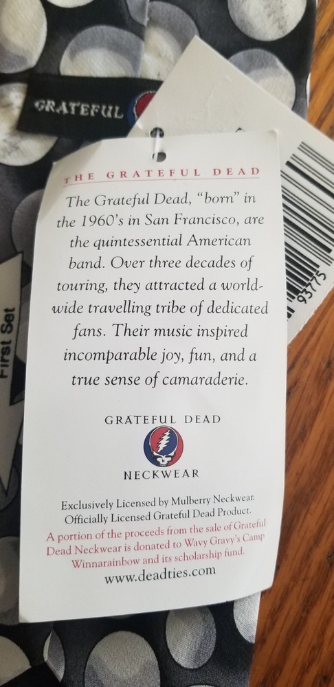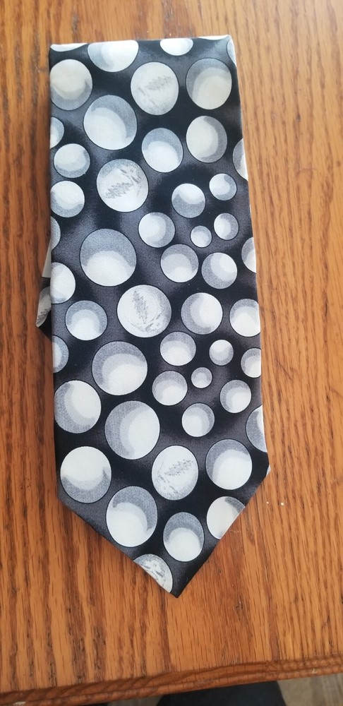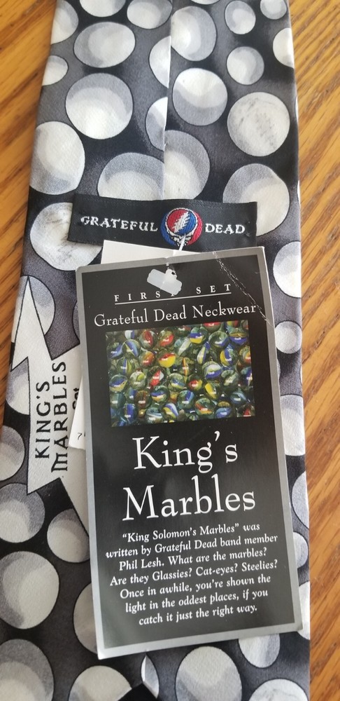 This Grateful Dead Men's Silk Novelty Neck Tie features a unique King's Marbles First Set design, perfect for fans of the band. The tie is made of 100% silk in black and gray colors, with a wide width and classic length. This vintage tie is a designer piece, reflecting the music theme of the Grateful Dead. Made in the United States, it is a stylish accessory for any man looking to add a touch of rock 'n' roll flair to their outfit.