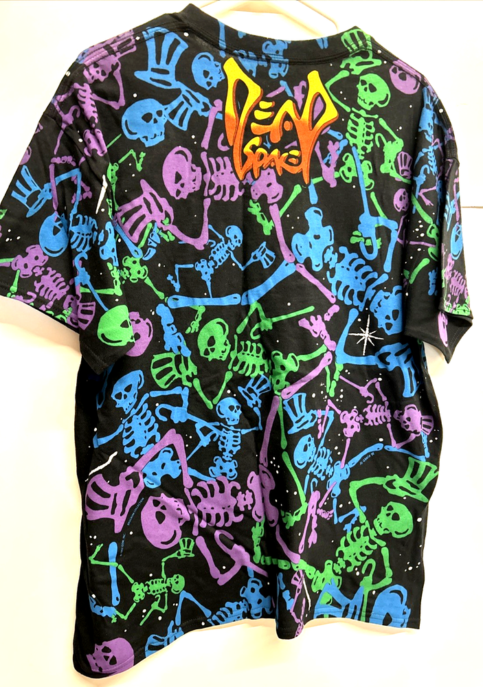 The Grateful Dead Liquid Blue Dancing Skeleton Shirt is a colorful and vibrant graphic print tee perfect for any hippie or skeleton-themed outfit. Made from lightweight cotton, this short sleeve t-shirt features a crew neckline and is machine washable for easy care. The shirt is available in size large, with a regular fit, making it suitable for all seasons and occasions. With its unique design and high-quality construction, this Liquid Blue shirt is a must-have for any music or pop culture enthusiast.