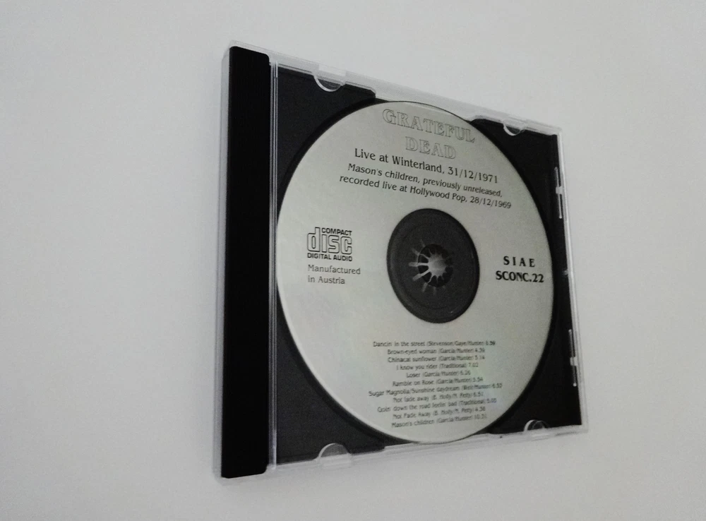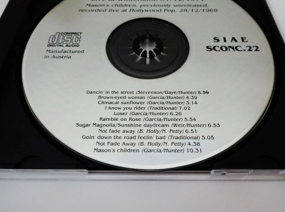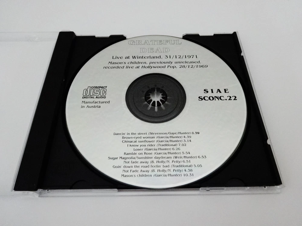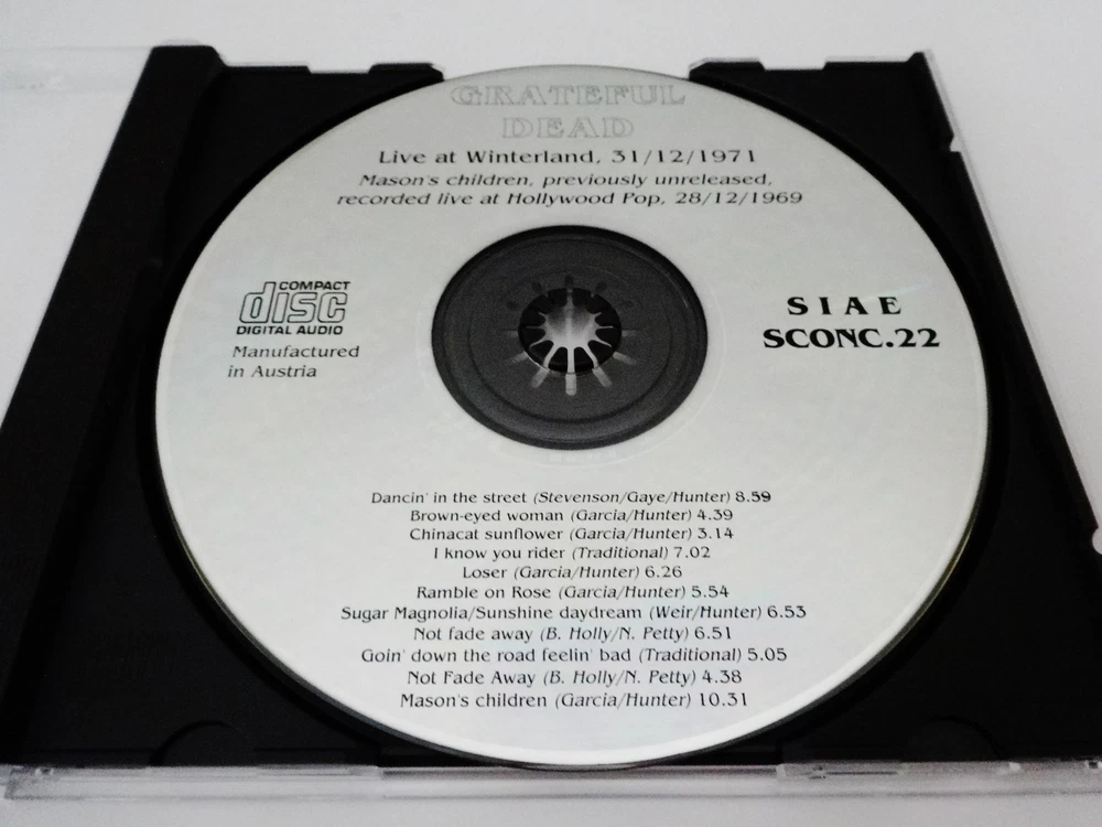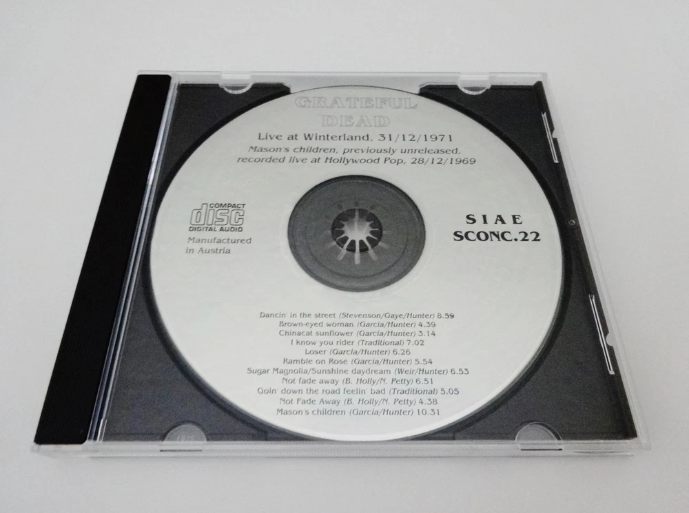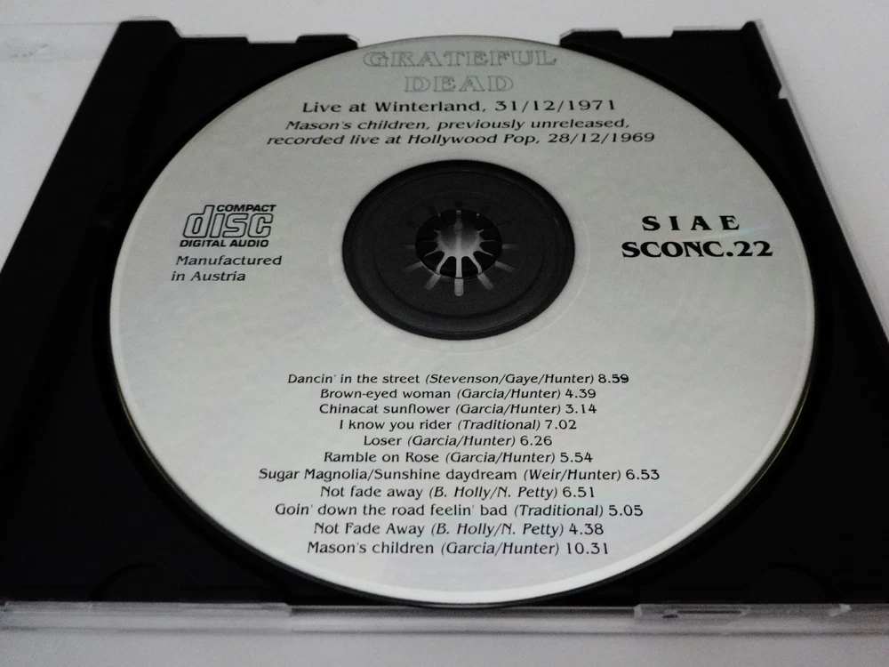 Grateful Dead - Bonus Disc CD - Live At Winterland - New Year's Eve 1971 - 1972 - December 31, 1971 ( 12/31/1971 ) - Winterland Arena - San Francisco, California ( CA ) - A Trip Without A Ticket - 1992 First Edition release - ( + Live At Hollywood Pop - December 28, 1969 ( 12/28/1969 ) ) - SIAE SCONC.22 - Made In Australia 1971 Grateful Dead ( Jerry Garcia / Ron Pigpen McKernan / Bob Weir / Phil Lesh / Bill Kreutzmann / Keith Godchaux ) / 12/31/71 December 31, 1971 ( 12/31/1971 ) - New Years Eve 1971 - 1972 - Winterland - San Francisco, California ( CA ) Dancin' In The Street ( 8:59 ) Brown Eyed Women ( 4:39 ) China Cat Sunflower > ( 3:14 ) I Know You Rider ( 7:02 ) Loser ( 6:26 ) Ramble On Rose ( 5:54 ) Sugar Magnolia ( 6:53 ) Not Fade Away > ( 6:51 ) Goin' Down The Road Feelin' Bad > ( 5:05 ) Not Fade Away > ( 4:38 ) 1969 Grateful Dead ( Jerry Garcia / Ron Pigpen McKernan / Bob Weir / Phil Lesh / Bill Kreutzmann / Mickey Hart / Tom Constanten ) - 12/28/69 December 28, 1969 ( 12/28/1969 ) - Hollywood Pop Festival - Hollywood, Florida ( FL ) Mason's Children ( 10:31 ) * Bonus Disc CD from the 1992 " A Trip Without A Ticket " ( Pasquale Di Bello ) Book release - included with the First Edition Book releases only in 1992 * Very Good condition ( light scratches on CD / no original white paper CD sleeve or book included - CD only )
