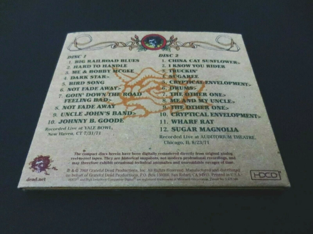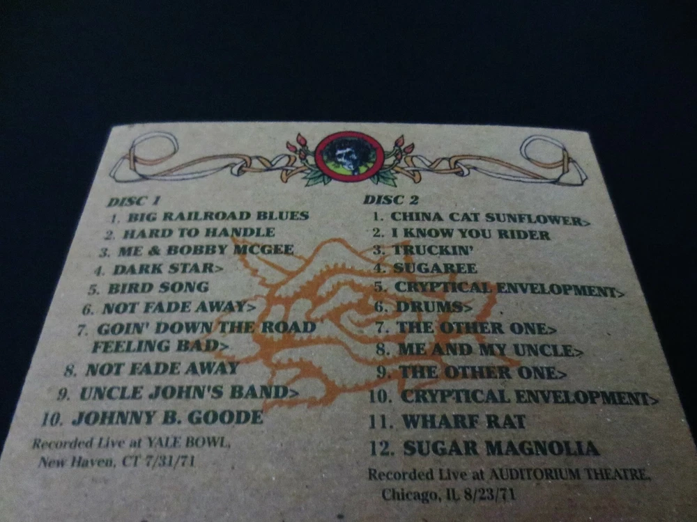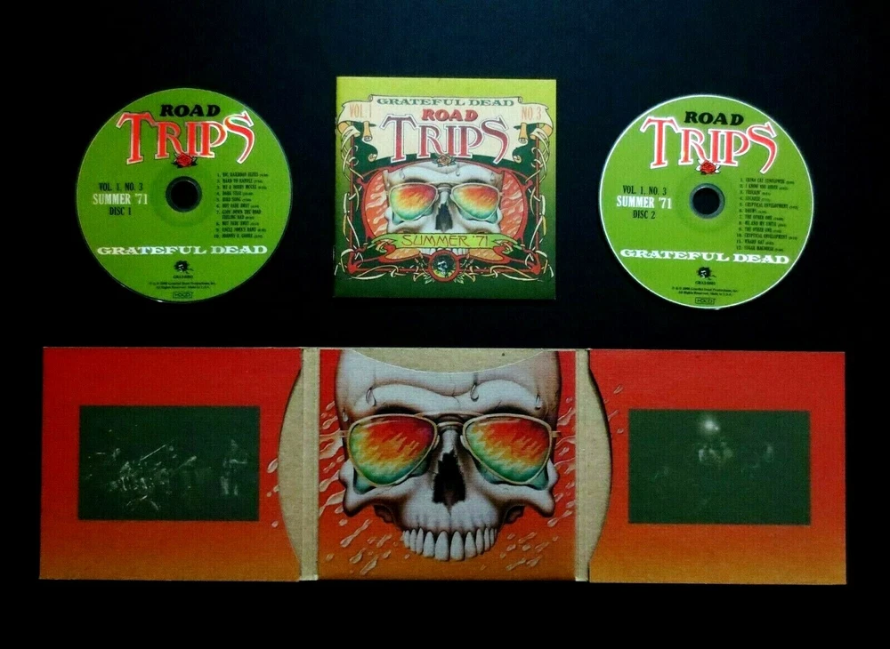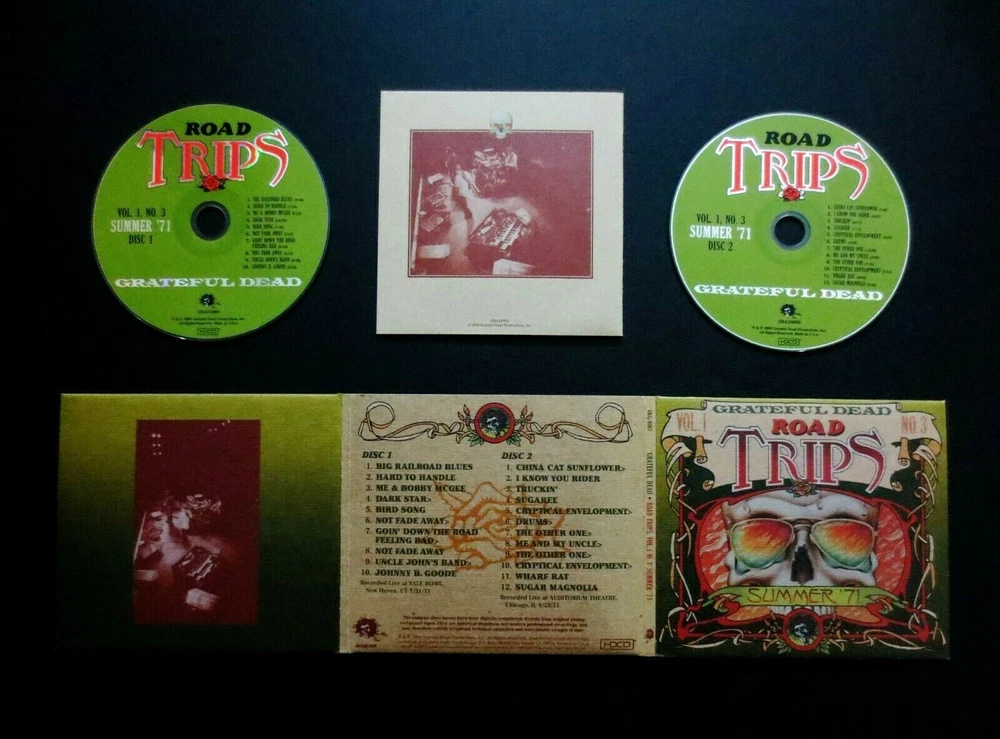 Grateful Dead : Road Trips Vol. 1 No. 3 - Summer '71 : Summer Tour 1971 ! : July 31, 1971 ( 7/31/1971 ) - Yale University - Yale Bowl - New Haven, Connecticut ( CT ) & August 23, 1971 ( 8/23/1971 ) - Auditorium Theatre - Chicago, Illinois ( IL ) : 2 CD : 2008 (1971/2008) Grateful Dead Productions, Inc. / Rhino ( GDP / Rhino ) = GRA2-6003 : Summer Tour '71 ! = RED-HOT !! Live-Dead !!! Absolutely-Amazing ! ... 1971 Summer Tour Grateful Dead !! - Twenty-Two ( 22 ) Tracks in total from the Yale Bowl !! & Chicago !!! Recorded ' Live ' at Yale Bowl - Yale University - New Haven, CT ( 7/31/1971 ) & Auditorium Theatre - Chicago, IL ( 8/23/1971 ) > > > Wow ... Dead Fans ! This indeed is " The ! " Grateful Dead recorded Live during the Amazing ! 1971 Summer Tour !!! This is Ultra-Tight - Energetic & Power-Packed Live-Dead !! - which also sadly marks Pigpen's final U.S. peak ( arguably ), as it is following this Tour that Keith Godchaux, and then Donna Jean Godchaux join the Band. This Very-Fine ! release is an Absolute ! " Must-Have " for Dead Fans who love their Good Ol' ( Early ! ) Grateful Dead - and really any other Music Fans who treasure Incredible ! ' Live ' Rock n' Roll !! 22-Tracks total are highlighted on this Road Trips - from both the Yale Bowl ! in New Haven, CT ( Yale University ! ) on 7/31/71 ! - and Auditorium Theatre in Chicago, IL on 8/23/71 !! This Very-Special ! 1971 Grateful Dead release ( from 2008 ) is in my personal opinion an Absolute " MUST-have ! " for Music Collectors - Rock Fans - Deadheads - and pretty much about everybody else who loves & treasures ' Special ' Live Rock & Roll performances by an Amazing-Band ! - here in one of their main " Prime " Eras ! ... 1971 !! Anyone with a fine-tuned ear that clearly recognizes an Extraordinary ! " Live " release, when they hear one - well ... here you go !! And, just a little fore-warning ... Look-out ! for the Cryptical > Drums > Other One > Me & My Uncle > Other One > Cryptical !!!!! Just Superb ! & Seamless Perfection !! Truly-Amazing Live-Dead !! ... Summer '71 at ' Both ' Yale U. ! & Chicago ! - a ' True-to-Form ' Grateful Dead " Road Trip ! " ... from Summer Tour '71 !! Wow !!! -- Enjoy !!!!! TRACK LISTING >>> DISC 1 : Recorded ' Live ' at Yale Bowl in New Haven, Connecticut ( CT ) on July 31, 1971 ( 7/31/1971 ) : Big Railroad Blues Hard To Handle Me & Bobby McGee Dark Star > Bird Song Not Fade Away Goin' Down The Road Feeling Bad > Not Fade Away Uncle John's Band > Johnny B. Goode DISC 2 : Recorded ' Live ' at Auditorium Theatre in Chicago, Illinois ( IL ) on August 23, 1971 ( 8/23/1971 ) : China Cat Sunflower > I Know You Rider Truckin' Sugaree Cryptical Envelopment > Drums > The Other One > Cryptical Envelopment > Wharf Rat Sugar Magnolia Item Condition : This Very-Rare !! Out of Print ( 2008 GDP / Rhino release ) Grateful Dead Road Trips Vol. 1 No. 3 - Summer '71 ( Recorded ' Live ' at Yale Bowl in New Haven, CT on 7/31/71 & Auditorium Theatre in Chicago, IL on 8/23/71 ) is in Very Good condition - close to Very Good/Like New overall. CD's ( Disc 1 & Disc 2 ) are in Very Good condition with light marks/scratches on the playing surfaces (please see photos). Liner Notes ( 16-Page Booklet Insert ) are in Like New (Near Mint/Mint!) condition (please see photos). CD Case ( 2-CD Tri-Fold ) is in Very Good condition - close to Very Good/Like New with light edge/surface wear (please see photos). Please see all photos provided. Photos included are of the actual item you will receive. The Dead Skeleton ! with Sunglasses !! & a few-beads of Sweat ! drippin' too ! ... out on '71 Summer Tour !! - with the Good Ol' Grateful Dead !!! ... at ' Both ' Yale University ! ( Whoa !?! ) & Chicago, Illinois ! -- Enjoy !!!!! Please ask any questions before bidding/buying & Best of Luck ! ( also ... please feel free to click the 'see other items' button above to check-out my other related live listings - Thanks ! ) U.S. & International buyers welcome (additional shipping charges & delivery time will apply for international destinations). Shipping charges include delivery confirmation on every item. Returns accepted within 14 days of purchase if item is returned unused & undamaged (buyer pays return shipping). All items will be shipped as merchandise with the winning bid entered as item value (2023-2024).