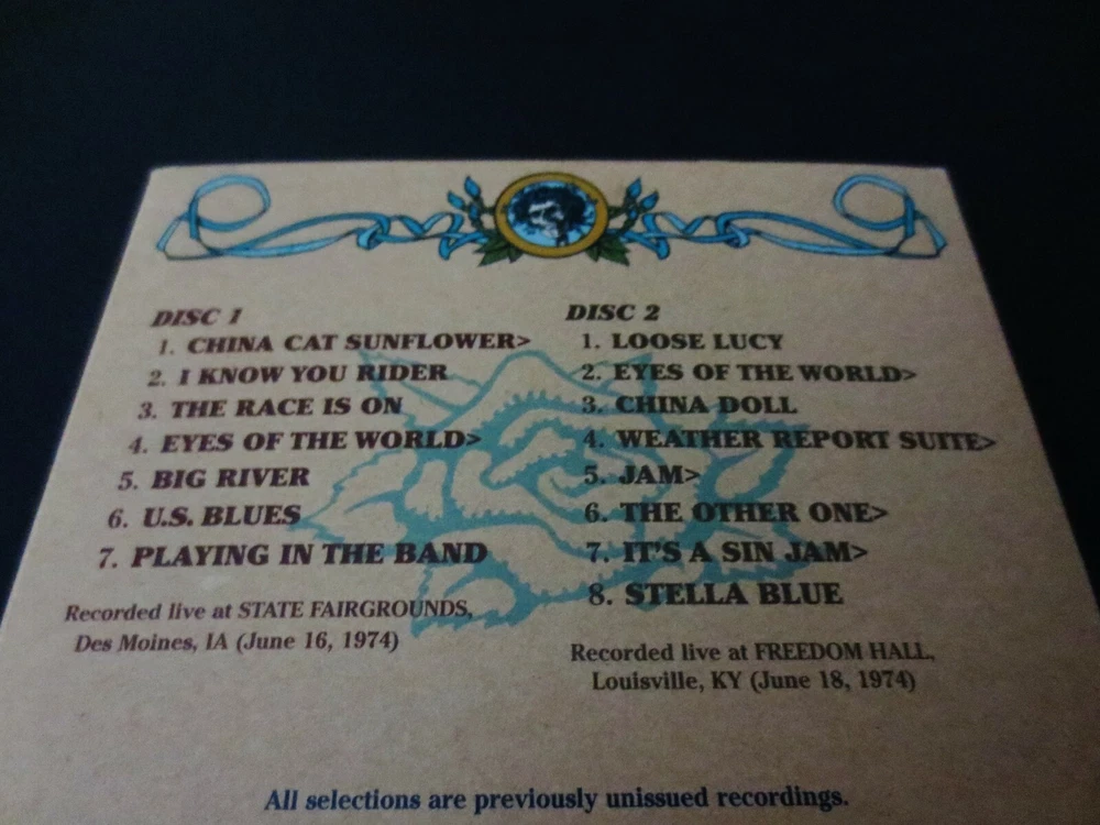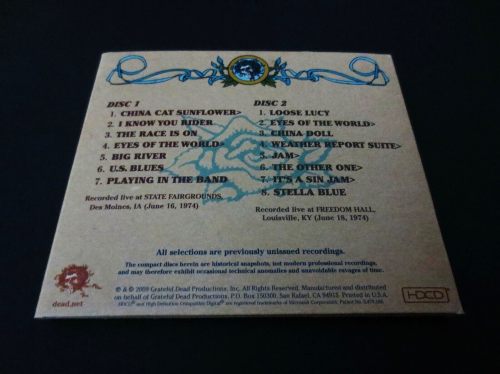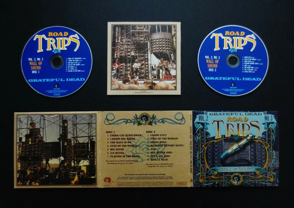 Grateful Dead : Road Trips Vol. 2 No. 3 - Wall Of Sound !!! : June 16, 1974 ( 6/16/1974 ) - State Fairgrounds - Des Moines, Iowa ( IA ) & June 18, 1974 ( 6/18/1974 ) - Freedom Hall - Louisville, Kentucky ( KY ) : 1974 : 2 CD : 2009 (1974/2009) Grateful Dead Productions, Inc. / Rhino ( GDP / Rhino ) : G.D. '74 Summer Tour ! ... through ' The ! ' Wall Of Sound !!! : Very Rare !! Grateful Dead recorded ' Live ' from the Legendary ! 1974 Des Moines, IA ( State Fairgrounds ) 6/16/74 & Louisville, KY ( Freedom Hall ) 6/18/74 Shows !! ... through The " Wall Of Sound !!!!! ". Oh Wow. Good Ol' ! Grateful Dead !!! Pretty much three ' Perfect ! ' words to describe this one in my humble Dead Fan opinion : Wall. Of. Sound. !!! !!! !!! This one Fans, is just ' as-advertised ' ( & then some !! ) ... from two completely Historic ! nights of '74 Summer Tour Grateful Dead, from both Louisville, KY & Des Moines, IA. Two ( 2 ) Monumental !! Stops on the Glorious ! '74 Summer Tour. This 2-CD Set offers tracks from both 6/16/74 & 6/18/74. A true-to-form " Road Trip " from two mighty-nights on this G.D. '74 Summer Tour >>> the China > Rider, Eyes > Big River, and Playin' ! from Iowa ( 6/16/74 ), and also the Amazing !!! Eyes > China Doll, Weather Report > Jam ! > Other One > It's A Sin Jam > Stella Blue segment from Freedom Hall, KY ( 6/18/74 ). Some serious Pre-hiatus Live '74 G.D. here Fans, certainly worth it's weight in audio Gold ! And naturally too - straight through " The Wall !!! ". At least to my ears ... Fabulous !!! Enjoy !!!!! TRACK LISTING >>> Grateful Dead recorded ' Live ' in Des Moines, Iowa ( IA ) at the State Fairgrounds on June 16th, 1974 ( 6/16/1974 ) - and - in Louisville, Kentucky ( KY ) at Freedom Hall on June 18th, 1974 ( 6/18/1974 ) : Disc 1 : Des Moines, Iowa ( IA ) - State Fairgrounds - June 16, 1974 ( 6/16/1974 ) : China Cat Sunflower > I Know You Rider The Race Is On Eyes Of The World > Big River U.S. Blues Playing In The Band Disc 2 : Louisville, Kentucky ( KY ) - Freedom Hall - June 16, 1974 ( 6/18/1974 ) : Loose Lucy Eyes Of The World > China Doll Weather Report Suite > Jam > The Other One > It's A Sin Jam Stella Blue Item Condition : This Very-Rare ! Out of Print ( 2009 GDP / Rhino release ) Grateful Dead Road Trips " Wall Of Sound " Vol. 2 / No. 3 ( 6/16/1074 - Des Moines, IA & 6/18/1974 - Louisville, KY ) 2-CD Set is in Very Good condition. CD's ( Disc 1 & Disc 2 ) are in Very Good condition with faint light marks/scratches on the playing surfaces (please see photos). Liner Notes ( 12-page Insert Booklet ) are in Like New (Near Mint/Mint!) condition (please see photos). CD Case ( 2-CD Tri-Fold ) is in Very Good condition with light surface wear indentations (please see photos). Please see all photos provided. Photos included are of the actual item you will receive. 1974 Summer Tour ! - Des Moines & Freedom Hall !! -- '74 Wall of Sound !!! ... Enjoy !!!!! Please ask any questions before bidding/buying & Best of Luck ! ( also ... please feel free to click the 'see other items' button above to check-out my other related live listings - Thanks ! ) U.S. & International buyers welcome (additional shipping charges & delivery time will apply for international destinations). Shipping charges include delivery confirmation on every item. Returns accepted within 14 days of purchase if item is returned unused & undamaged (buyer pays return shipping). All items will be shipped as merchandise with the winning bid entered as item value (2025-2026).