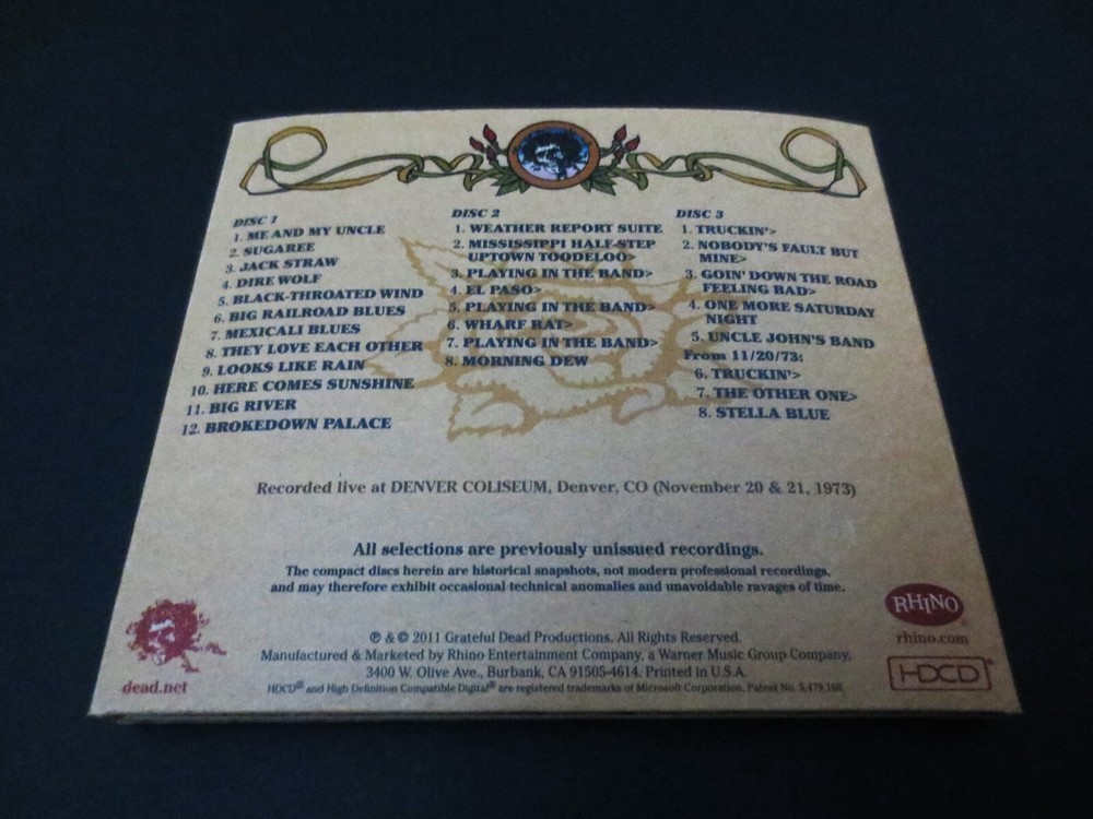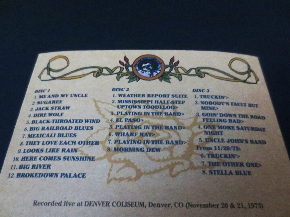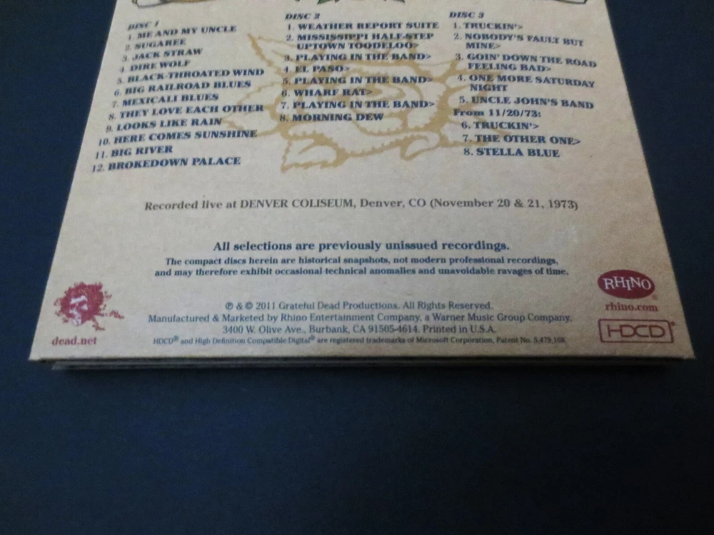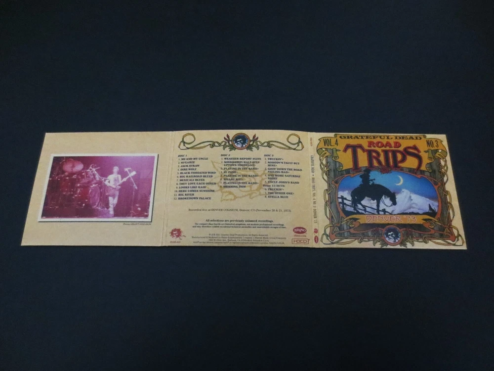 Grateful Dead : Road Trips Vol. 4 No. 3 - Denver '73 : Denver Coliseum - Denver, Colorado ( CO ) : November 21 ( + 20 ), 1973 ( 11/20/1973 & 11/21/1973 ) : 2011 (1973/2011) Grateful Dead Productions, Inc. / Rhino ( GDP / Rhino ) - GRA2-6020 : Very-Rare ! ... '73 Live-Dead !!! An Amazing !!! 1973 Grateful Dead performance from 11/21/73 ( Denver Coliseum ) - also including additional tracks from the 11/20/73 Denver Show ... Air-Tight ! - Fall '73 !! Live-Dead !!!!! Whoa ! ... Dead Fans, Dead Fans !! This release is Strong ! & Spacey !! Grateful Dead in that stripped-down one-Drummer format ( B.K. ! ) ... that can deliver a whole-new type of G.D. Magic ! all on it's own ! Wow ... There is indeed that special-brand of Fall '73 Grateful Dead Magic !!! all-throughout this performance, including the ' on-a-dime ' song transitions / segues that truly trademark the Band in 1973. Along with those other two words - so commonly heard to describe this fine period for the Band ... " Fluid " & " Tight " !!! To the ears ( at least to mine ), it truly is amazing that this is a band less than one year from feeling that a ' hiatus ' from playing together is much needed ... as this is arguably one of " The ! " Prime & Peak ! Periods & Eras of the somewhat earlier Grateful Dead. And just to think that " Year Nine ( 9 ) " is considered " Early " !?!! After all this is America's pride & joy Band that Always ! had at least nine-lives. Well, maybe not for the ' mainstream ' - but who really needs that mainstream stuff anyways. This is some Silky-Smooth ! Colorado G.D. here folks, as Bobby Weir even called " Me & My Uncle " for the Show opener !!! And look out below ! for the " Triple-Playin-Sandwich " !!! on Disc 2 ! ... Yum. With a Mesmerizing ! Morning Dew !!! for desert ... Yummier !! Wow ... What a Red-Hot Show ! In a " 1973 G.D. " way, which at times ... just simply spells Magic !!! In fact, this was the only " 1973 " 3-CD Set from the entire " Road Trips " Series, and it is without question an uncommon, somewhat surprising / unexpected & Excellent ! selection from this Very-Fine ! '73 period, Tour, and Era ! ... Enjoy !!!!! TRACK LISTING >>> Grateful Dead ' Live ' at the Denver Coliseum in Denver, Colorado ( CO ) on November 21 ( & 20 ), 1973 ( 11/21/1973 + 11/20/1973 ) : Disc 1 ( 11/21/1973 ) : Me And My Uncle Sugaree Jack Straw Dire Wolf Black-Throated Wind Big Railroad Blues Mexicali Blues They Love Each Other Looks Like Rain Here Comes Sunshine Big River Brokedown Palace Disc 2 ( 11/21/1973 ) : Weather Report Suite Mississippi Half Step Uptown Toodeloo > Playing In The Band > El Paso > Playing In The Band > Wharf Rat > Playing In The Band > Morning Dew Disc 3 ( 11/21/1973 ( +11/20/1973 - Denver, Colorado ( CO ) ) ) : Truckin' > Nobody's Fault But Mine > Going' Down The Road Feeling Bad > One More Saturday Night Uncle John's Band + Additional Bonus Tracks from 11/20/1973 ( Denver, Colorado ( CO ) ) : Truckin' > The Other One > Stella Blue Item Condition : This Very-Rare ! Out of Print ( 2011 GDP / Rhino release ) Grateful Dead Road Trips Vol. 4 No. 3 Denver '73 ( 11/21/73 +11/20/73 ) 3-CD Set is in Like New condition. CD's ( Disc 1, Disc 2, Disc 3 ) are in Like New (Near Mint/Mint) condition (please see photos). Liner Notes ( 16-Page Booklet ) are in Like New (Near Mint/Mint) condition (please see photos). CD Case ( 3-CD Tri-Fold ) is in Like New (Near Mint/Mint) condition (please see photos). This 3-CD Set was purchased Brand New / Factory-Sealed with each CD being played only one-time - then stored very-carefully inside protective plastic in my professional CD rack. Please see all photos provided. Photos included are of the actual item you will receive. 1973 Fall Tour Grateful Dead ! - in Denver, Colorado !! ... Enjoy !!! Please ask any questions before bidding/buying & Best of Luck ! ( also ... feel free to click the 'see other items' button above to check out my other related live listings - Thanks ! ) U.S. & International buyers welcome (additional shipping charges & delivery time will apply for international destinations). Shipping charges include delivery confirmation on every item. Returns accepted within 14 days of purchase if item is returned unused & undamaged (buyer pays return shipping). All items will be shipped as merchandise with the winning bid entered as item value (2025-2026).